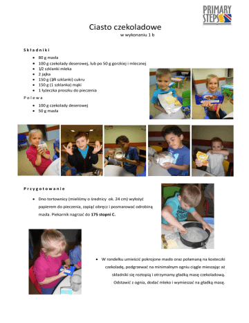 Ciasto czekoladowe w wykonaniu 1 b Składniki 80 g masła 100 g czekolady deserowej, lub po 50 g gorzkiej i mlecznej 1/2 szklanki mleka 2 jajka 150 g (3/4 szklanki) cukru 150 g (1 szklanka) mąki 1 łyżeczka proszku do pieczenia Polewa 100 g czekolady deserowej 50 g masła Przygotowanie Dno tortownicy (mieliśmy o średnicy ok. 24 cm) wyłożyć papierem do pieczenia, zapiąć obręcz i posmarować odrobiną masła. Piekarnik nagrzać do 175 stopni C. W rondelku umieścić pokrojone masło oraz połamaną na kosteczki czekoladę, podgrzewać na minimalnym ogniu ciągle mieszając aż składniki się roztopią i otrzymamy gładką masę czekoladową. Odstawić z ognia, dodać mleko i wymieszać na gładką masę. W misce ubić jajka z cukrem (ok. 4 minuty) na puszystą masę. Do drugiej miski przesiać mąkę, dodać proszek do pieczenia i dokładnie wymieszać. Dodać ubite jajka oraz masę czekoladową, zmiksować na minimalnych obrotach miksera lub wymieszać drewnianą łyżką tylko do połączenia się składników w jednolite ciasto. Wyłożyć je do tortownicy, wstawić do piekarnika i piec przez ok. 43 minuty do suchego patyczka (w większej niż 24 cm formie, ciasto będzie piekło się krócej, ok. 30 - 35 minut, sprawdzamy to patyczkiem wetkniętym w środek, czy jest jeszcze obklejony surowym ciastem). Po upieczeniu wyjąć ciasto z piekarnika i studzić przez ok. 30 minut w formie, następnie wyłożyć na paterę. Polać polewą: do garnka włożyć połamaną na kosteczki czekoladę i pokrojone masło, cały czas mieszając podgrzewać na małym ogniu aż czekolada się roztopi. Od razu odstawić z ognia i polać po cieście. Można posypać skrojonymi orzechami (użyliśmy mieszanki studenckiej). SMACZNEGO!