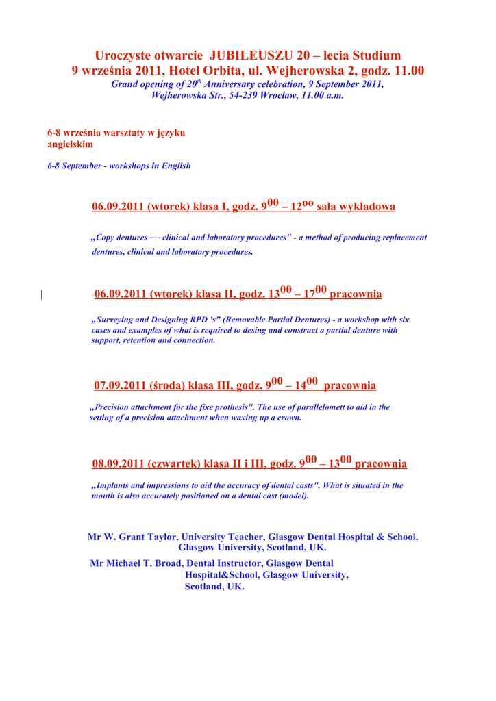 Uroczyste otwarcie JUBILEUSZU 20 – lecia Studium 9 września 2011, Hotel Orbita, ul. Wejherowska 2, godz. 11.00 Grand opening of 20th Anniversary celebration, 9 September 2011, Wejherowska Str., 54-239 Wrocław, 11.00 a.m. 6-8 września warsztaty w języku angielskim 6-8 September - workshops in English 06.09.2011 (wtorek) klasa I, godz. 900 – 12oo sala wykładowa „Copy dentures — clinical and laboratory procedures" - a method of producing replacement dentures, clinical and laboratory procedures. 06.09.2011 (wtorek) klasa II, godz. 1300 – 1700 pracownia „Surveying and Designing RPD 's" (Removable Partial Dentures) - a workshop with six cases and examples of what is required to desing and construct a partial denture with support, retention and connection. 07.09.2011 (środa) klasa III, godz. 900 – 1400 pracownia „Precision attachment for the fixe prothesis". The use of parallelomett to aid in the setting of a precision attachment when waxing up a crown. 08.09.2011 (czwartek) klasa II i III, godz. 900 – 1300 pracownia „Implants and impressions to aid the accuracy of dental casts". What is situated in the mouth is also accurately positioned on a dental cast (model). Mr W. Grant Taylor, University Teacher, Glasgow Dental Hospital & School, Glasgow University, Scotland, UK. Mr Michael T. Broad, Dental Instructor, Glasgow Dental Hospital&School, Glasgow University, Scotland, UK.