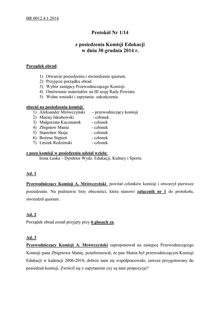 Protokół nr 1/14 - 29 grudnia 2014 r.