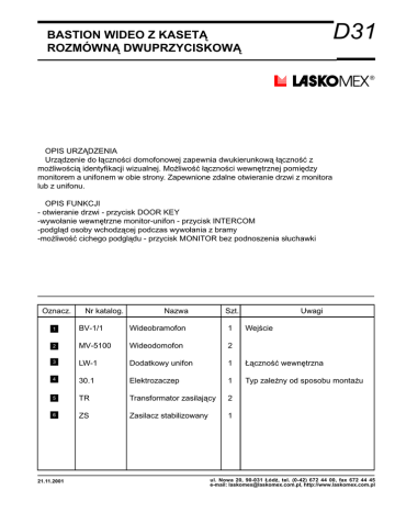 D31 BASTION WIDEO Z KASET¥ ROZMÓWN¥ DWUPRZYCISKOW¥ OPIS URZ¥DZENIA Urz¹dzenie do ³¹cznoci domofonowej zapewnia dwukierunkow¹ ³¹cznoæ z mo¿liwoci¹ identyfikacji wizualnej. Mo¿liwoæ ³¹cznoci wewnêtrznej pomiêdzy monitorem a unifonem w obie strony. Zapewnione zdalne otwieranie drzwi z monitora lub z unifonu. OPIS FUNKCJI - otwieranie drzwi - przycisk DOOR KEY -wywo³anie wewnêtrzne monitor-unifon - przycisk INTERCOM -podgl¹d osoby wchodz¹cej podczas wywo³ania z bramy -mo¿liwoæ cichego podgl¹du - przycisk MONITOR bez podnoszenia s³uchawki Oznacz. Nr katalog. Nazwa Szt. Uwagi 1 BV-1/1 Wideobramofon 1 2 MV-5100 Wideodomofon 2 3 LW-1 Dodatkowy unifon 1 £¹cznoæ wewnêtrzna 4 30.1 Elektrozaczep 1 Typ zale¿ny od sposobu monta¿u 5 TR Transformator zasilaj¹cy 2 6 ZS Zasilacz stabilizowany 1 21.11.2001 Wejcie ul. Nowa 20, 90-031 £ód, tel. (0-42) 672 44 00, fax 672 44 45 e-mail: [email protected], http://www.laskomex.com.pl Schemat blokowy Schemat monta¿owy UNIFON 1R 2W Nr. katalogowy 4B KEY KEY LW-1 PABX 3 ~220 V 6 6 ZASILACZ ZAS. TABILIZO. L 2 D31 ZASILACZ 12V/500 mA DC N ZS 2 Zaciski monitora dodatkowego typu MV-5101 (równie¿ MV5200 ale bez zacisków PABX) 5 2 MONITOR 2 1R 2W 3Y AUX1 AUX2 KEY2 KEY1 PABX1 PABX2 4B MV-5101 MV-5201 TR ZASILACZ 2 5 2 8 Zaciski monitora g³ównego typu MV-5100 (równie¿ MV5200 ale bez zacisków PABX) MONITOR 1 1R 2W 3Y MV-5100 MV-5200 AUX1 AUX2 KEY2 KEY1 PABX1 PABX2 4B TR TRNASFORMATOR 1 BV-1/1 KASETA V 4 4K K Uwagi: pierwszy przycisk kasety wywo³uje monitor 1 drugi przycisk kasety wywo³uje monitor 2 i unifon 4 2 01.03.2002 A B S1/Z S2 Z ELEKTROZACZEP