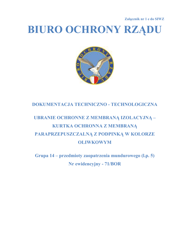 Załącznik nr 1 e do SIWZ BIURO OCHRONY RZĄDU DOKUMENTACJA TECHNICZNO - TECHNOLOGICZNA UBRANIE OCHRONNE Z MEMBRANĄ IZOLACYJNĄ – KURTKA OCHRONNA Z MEMBRANĄ PARAPRZEPUSZCZALNĄ Z PODPINKĄ W KOLORZE OLIWKOWYM Grupa 14 – przedmioty zaopatrzenia mundurowego (l.p. 5) Nr ewidencyjny - 71/BOR SPIS TREŚCI 1. Rysunek modelowy. 3 2. Opis ogólny wyrobu. 4 3. Wymagania techniczne. 5 3.1. Wykaz materiałów zasadniczych i dodatków. 5-6 3.2. Wymagania techniczno-uŜytkowe tkaniny zasadniczej. 7-9 3.3. Wymagania techniczno-uŜytkowe dzianiny typu „Polar” (lub równowaŜnej). 10-11 3.4. Rodzaje szwów i ściegów maszynowych. 11 3.5. Dopuszczalne sztukowanie elementów. 11 3.6. Klasyfikacja wielkości. 12 4. Cechowanie, składanie, pakowanie i przechowywanie. 12 4.1. Rozmieszczenie cech dostawcy. 12-13 4.2 Składanie. 13 4.3. Pakowanie. 13 4.4. Przechowywanie. 13 5. Gwarancja. 13 6. Rysunki techniczne. 14-18 7. Arkusz ewidencji wprowadzonych zmian. 19 str. 2 1. RYSUNEK MODELOWY. Rysunek nr 1 – rysunek modelowy. str. 3 2. OPIS OGÓLNY WYROBU. Kurtka ochronna wykonana z wodoodpornej tkaniny poliestrowej z membraną paroprzepuszczalną w kolorze zielonej oliwki. Zaprojektowana pod kątem zabezpieczenia przed złymi warunkami atmosferycznymi oraz dla podniesienia komfortu uŜytkowania. Kurtka posiada ocieplacz dopinany w przodzie zamkiem błyskawicznym. Po odpięciu ocieplacza od kurtki wyrób moŜe być uŜytkowany jako bluza. Kurtka zapinana na rozdzielny zamek błyskawiczny dwusuwakowy przykryty plisą zapinaną na napy i rzepy. Pliski zakrywają takŜe kieszenie (poziome) umieszczone na wysokości piersi zamykane na zamek błyskawiczny. Pod karczkiem przodu prawego umieszczona jest wyjmowana patka z logiem BOR. W tylnej części pleców pod karczkiem równieŜ umieszczona jest wyjmowana patka z napisem „BOR ”w kolorze srebrnym odblaskowym. Logo BOR jak zarówno napis, zarówno w przodzie jak i w tyle przypinane jest na taśmę samosczepną. W dolnej części przodów wykonane kieszenie cięte zapinane na zamek błyskawiczny przykrywane listewkami. Na wysokości piersi przy krawędziach przodu wykonane kieszenie pionowe zapinane na dwa odcinki taśmy samosczepnej. W szwach bocznych kurtki i sięgających do rękawa znajdują się otwory przelotowe zapinane na zamek błyskawiczny przystosowane do wkładania i wyjmowania broni słuŜbowej. Dół kurtki wykończony podwinięciem w postaci tunelu, w który umieszczona jest guma słuŜąca do regulacji obwodu. W tylnej części kurtki poniŜej tunelu wykonana kieszeń cięta zapinana na zamek błyskawiczny przykrywany listewką. Kurtka posiada kaptur zapinany na zamek błyskawiczny z moŜliwością chowania w stójkę. Kaptur wyposaŜony jest w regulacje obwodu sznurkiem elastycznym w części przedniej. Na wierzchniej części rękawów pod lekkim skosem wykonane kieszenie cięte zapinane na zamek błyskawiczny. Dół rękawa z patką słuŜącą do regulacji obwodu. Kurtka posiada od wewnętrznej strony dodatkowy zamek błyskawiczny umoŜliwiający przypięcie ocieplacza. Ocieplacz kurtki ochronnej wykonany jest z dzianiny odzieŜowej typu „polar” w kolorze zielonej oliwki. Przód ocieplacza zapinany na zamek błyskawiczny, posiada skośne kieszenie boczne zapinane na zamki błyskawiczne. Góra bluzy wykończona szeroką stójką z moŜliwością wykładania. Dół wykończony podwinięciem w formie tunelu. W szwach bocznych ocieplacza wykonane są otwory przelotowe zapinane na zamek błyskawiczny przystosowane do wkładania i wyjmowania broni słuŜbowej. Od strony wewnętrznej ocieplacza po lewej stronie na wysokości piersi pionowa kieszeń wpuszczana zapinana na zamek błyskawiczny. Natomiast od wewnętrznej strony ocieplacza po prawej stronie naszyta siatkowa kieszeń wykończona gumką. Na karczku tyłu i przodu oraz na rękawach, naszyte tkaninowe wzmocnienia. str. 4 3. WYMAGANIA TECHNICZNE. 3.1. WYKAZ MATERIAŁÓW ZASADNICZYCH I DODATKÓW. Wykaz surowców, materiałów zasadniczych i dodatków przedstawiono w tabeli nr 1. Tabela nr 1. L.p. Nazwa materiału /dodatku 1 2 1. Trójwarstwowy laminat z membraną ePTFE (lub równowaŜny) z poliestrową tkaniną zewnętrzną w kolorze oliwkowym i poliamidową tkaniną spodnią w kolorze nikiel. 2. Podszewka poliestrowa w kolorze oliwka. 3. Tkanina wzmocnieniowa 100% bawełna w kolorze oliwka. 4. Dzianina aŜurowa (siatka) w kolorze oliwka. 5. Poliamidowa dzianina osnowowa, w kolorze oliwka. 6. Dzianina polar w kolorze oliwka. 7. Taśma do uszczelniania szwów z membraną PTFE (lub równowaŜną), szerokość 2,2 cm, w kolorze nikiel. 8. Emblemat BOR okrągły. 9. Napis wysokoodblaskowy BOR. 10. Włóknitex bez kleju (lub równowaŜny). 11. Taśma elastyczna szer. 20 mm w kolorze khaki. 12. Taśma wieszakowa 6mm w kolorze khaki. 13. Guma okrągła 3mm w kolorze khaki. 14. Nici z rdzeniem poliestrowym grubość 194x2dtex lub 200x2dtex w kolorze tkaniny zasadniczej. 15. Nici poliestrowe z włókien ciętych grubość 194x2dtex lub 200x2dtex w kolorze tkaniny zasadniczej. 16. Stoper jednokomorowy z dziurkami na tasiemkę z tworzywa sztucznego w kolorze khaki. 17. Stoper dwukomorowy z tworzywa sztucznego w kolorze khaki. 18. Końcówki do sznurka w kolorze khaki. 19. Oczko mosięŜne oksydowane, średnica 5,5mm. str. 5 1 2 20. Zamek błyskawiczny 2-suwakowy średniocząstkowy rozdzielczy. 21. Zamek błyskawiczny 1-suwakowy średniocząstkowy rozdzielczy. 22. Zamek błyskawiczny 1-suwakowy spiralny rozdzielczy. 23. Zamek błyskawiczny 1-suwakowy spiralny nierozdzielczy. 24. Zamek błyskawiczny 2-suwakowy kostka nierozdzielczy, forma X. 25. Taśma samosczepna szer.2,0cm w kolorze khaki pętelka. 26. Taśma samosczepna szer.2,0cm w kolorze khaki haczyk. 27. Taśma samosczepna szer.10cm w kolorze khaki haczyk. 28. Taśma samosczepna szer.10cm w kolorze khaki pętelka. 29. Zatrzask konfekcyjny o średnicy 15mm: -wierzch w kolorze oksydowanym; -gniazdo, słupek, lejek – mosięŜne oksydowan