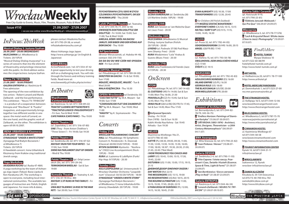WrocławWeekly Monday 24th Psychoterapia czyli seks w zyciu czlowieka (Psychotherapy, or sex in human life) - Thu 20:00 SCENA KAMERALNA (ul. Świdnicka 28) Lili Marléne (Indie: 10PLN) - 19:00 Free City Guide to Events, Music, Film, Theatre, Museum, Pubs & More Lalek (Puppet) Theatre (pl. Teatralny Tuesday 25th Issue #110 4, tel. 071/ 344-76-77, 344-12-16) Zwierzęta Doktora Dolittle (Dr Dolittle) - Fri 10:00; Sat 15:00; Sun 11:00; Tue & Wed 10:00 Amelka, Bóbr i Król na dachu (Amley, der Biber und der König auf dem Dach) - Thu 10:00 RURA Jam Session w/ Jan Malecha Quartet (Jazz: Free) - 20:30 21.09.2007 - 27.09.2007 > we are now online: www.WroclawWeekly.pl > [email protected] InFocus:ThisWeek please contact Akademia Ruchu: tel. 071/793-29-38, or email: [email protected] 26.09.2007 - 20:00 (Wednesday) MLECZARNIA (ul. Włodkowica 5) Tickets: 20/15PLN “Musical Dialog (Dialog muzyczny)” is a series of concerts that mix the element of theatricality and privilege interaction with the public. Its third edition welcomes the singer/actress Justyna Szafran. About Ashtanga Joga Japan: http://www.ashtanga.jp/ (in English & Japanese) Musical Dialog 3: Justyna Szafran Neuro TV: TRYBICON 21.09.2007 - 18:00 (Friday) Galeria ENTROPIA (ul. Rzeźnicza 4) Free admission The opening of the new exhibition by two artists - Robert Lenard and Marek Zalibarek - and the live performance. This exhibition - “Neuro TV: TRYBICON” - is a product of a cooperation between Entropia and “Rita Baum” & “Puzdro” magazines, and experimentally brings together two different worlds in one space: the metal work of Lenard, on the one hand, and the graphic work of Zalibarek, on the other. The exhibition is open till 09.10.2007. IRENA URBAŃSKA & Klezmerzy 23.09.2007 - 19:00 (Sunday) SYNAGOGUE “UNDER A WHITE STORK” (Synagoga Pod Białym Bocianem / ul.Włodkowica 7) Tickets: 20/15PLN A Hawdalah concert. Irena Urbańska & Klezmerzy from Kraków sing traditional Jewish songs. Yoga Workshop AKADEMIA RUCHU (ul. Ruska 47-48A) A yoga workshop by the team of Ashtanga Joga Japan (Tokyo): Basia Lipska & Ken Harakuma (JP). The workshop is open to everyone, including local international communities. The available languages of instruction are: Polish, English and Japanese. For more info & dates, Quad Biking ActivePoland.com / tel. 071/354-47-42 A great opportunity to test your driving skill on a challenging track. You will ride through the forests and military training fields. Read more at: wroclawweekly.pl/index.php/activities/ InTheatre Współczesny (Contemporary) Theatre (ul. Rzeźnicza 12, tel. 071/ 358-89-22) Traktat (Ludwig Wittgenstein’s “Tractatus logico-philosophicus”) - Fri-Sun, Tue & Wed 19:00 Cafe Panika (Cafe Panic) - Thu 19:00 Polski Theatre (1) (ul. Zapolskiej 3, tel. 071/ 316-07-80) One (They - from Anton Chekhov’s “Three Sisters”) - Fri 19:00; Sat 19:30 Polski Theatre (2) (ul. Świdnicka 28, tel. 071/ 316-07-52) Mayday (Run for Your Wife!) - Sat 17:00; Sun 19:00 Okno na Parlament (Out of Order) - Wed & Thu 19:00 Polski Theatre (3) (pl. Orląt Lwowskich 20c, tel. 071/ 341-29-54) Terrordrom Breslau - Sat & Sun 19:00 Komedia Theatre (pl. Teatralny 4, tel. 071/ 316-07-78 thru -80) Mayday 2 (It Runs in the Family) - Fri 20:00 Unia bez tajemnic (A Rise in the Mar ket) - Sat 20:00; Sun 17:00 Ad Spectatores (Browar Mieszczanski, ul. Hubska 44-48, contact: 502-210-735) Da-da-du-du-wie-czór-nie-spodzianek - Fri-Sun 20:00 CAPITOL Musical Theatre (ul. Piłsudskiego 67, tel. 071/789-04-00) Skrzypek na dachu - Fri & Sat 19:00; Sun 17:00 Mdłość, Mniezłość, Miłość - Tue & Wed 20:00 Mała Księżniczka - Thu 10:30 OPERA Wrocławska (ul.Świdnicka 35) “Cosi fan tutte” by W.A. Mozart - Sat 19:00; Sun 17:00 “Czarodziejski flet (Die Zauberflöte)” by W.A. Mozart - Tue 19:00; Wed 11:00 “Hagith” by K. Szymanowski - Thu 19:00 Concerts Wednesday 26th MLECZARNIA (Włodkowica 5) Musical Dialog: Justyna Szafran (Polish: 20/15PLN) - 20:00 ŁYKEND (ul. Podwale 37/38) Pod Masztem (Shanty: Free) - 20:00 RURA Włodzimierz “Lola” Krakus & Guests (Blues: Free) - 20:30 Thursday 27th RURA Lena Frankiewicz & Friends (Jazz: 9/7/5PLN) - 20:30 OnScreen ATOM (ul. Piłsudskiego 74, tel. 071/ 347-14-65) El Custodio (AR) Fri 14:00; Sat & Sun 11:00; Mon-Thu 16:00, 21:30 Pravidla lži (CZ) Fri 15:45; Sat & Sun 12:45; Mon-Thu 19:30 Irina Palm (GB/LU/BE/DE/FR) Fri 17:45; Sat & Sun 14:45; Mon-Thu 17:45 > Bollywood Specials: Sholay - Fri 19:30 Don (1978) - Sat & Sun 16:30 Kabhi Alvida Naa Kehna - Sat 19:45 Athadu - Sun 19:30 Friday 21st HELIOS WROCŁAW PHILHARMONIC CONCERT HALL (ul. Piłsudskiego 19) Symphonic Concert: K. Penderecki / A. Dworzak (Classical: 60/40/2520/15PLN) - 19:00 WYSPA SŁODOWA Myslovitz - “Nosferatu” (1922) Live Accompaniment (Rock: 15PLN) - 19:00 RURA (ul. Łazienna 4) LabiRytm (Funk/ Hip-Hop: 9/7/5PLN) - 20:30 (Kazimierza Wielkiego 19a-21, tel.071/786-65-66) Katyń (PL) 08:30, 09:00, 09:30, 11:00, 11:30, 12:00, 13:30, 14:30, 15:30, 16:00, 17:00, 18:00, 18:30*, 19:30, 20:30, 21:00, 21:45, 22:45 (*Not Wed) I Now Pronounce You Chuck and Larry (US) 10:45, 13:00, 15:15, 17:30, 19:45, 22:00 Disturbia (US) 11:00, 15:00, 17:15, 19:15, 21:15 Дневной дозор (Dnevnoy dozor / Day Watch) (RU) 22:15 The Messengers (US) 15:15, 19:00 No Reservations (US/AU) 18:15, 20:15 The Bourne Ultimatum (US) 11:00, 13:15, 15:30, 17:45, 20:00, 22:15 U Pana Boga w ogródku (PL) 12:00, 14:15, 16:30, 18:45, 21:00 Sunday 23rd AULA LEOPOLDINA (pl. Uniwersytecki 1) Wrocław Chamber Orchestra “Leopoldinum” (Classical: 50/35/20/15PLN) - 18:00 SYNAGOGUE “UNDER A WHITE STORK” (Synagoga Pod Białym Bocianem / ul.Włodkowica 7) Irena Urbańska & Klezmerzy (Hawdalah: 20/15PLN) - 19:00 Contact: Wrocław Tourist Information Center, Rynek 14, 50-101 Wrocław, tel. (+48 71) 344 31 11, [email protected] Evan Almighty (US) 10:30, 17:00 Transformers (US) 12:30, 20:45 > For Children (All Polish Dubbed): I Ty możesz zosta