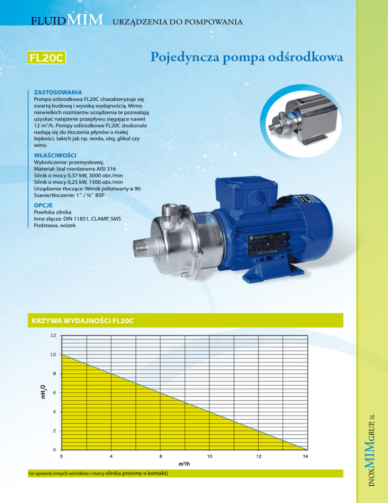 URZĄDZENIA DO POMPOWANIA FL20C Pojedyncza pompa odśrodkowa ZASTOSOWANIA Pompa odśrodkowa FL20C charakteryzuje się zwartą budową i wysoką wydajnością. Mimo niewielkich rozmiarów urządzenia te pozwalają uzyskać natężenie przepływu sięgające nawet 12 m3/h. Pompy odśrodkowe FL20C doskonale nadają się do tłoczenia płynów o małej lepkości, takich jak np. woda, olej, glikol czy wino. WŁAŚCIWOŚCI Wykończenie: przemysłowej, Materiał: Stal nierdzewna AISI 316 Silnik o mocy 0,37 kW, 3000 obr./min Silnik o mocy 0,25 kW, 1500 obr./min Urządzenie tłoczące: Wirnik półotwarty ø 90 Ssanie/tłoczenie: 1” / ¾” BSP OPCJE Powłoka silnika Inne złącza: DIN 11851, CLAMP, SMS Podstawa, wózek (w sprawie innych wirników i mocy silnika prosimy o kontakt) INOX m33/h /h MIMGRUP, SL mH2O KRZYWA WYDAJNOŚCI FL20C WYMIARY I CHARAKTERYSTYKA MODELU FL20C 211,5 3/4" 132 22,6 111 Ø138 79.5 1" 56 ec-185 ec-135 213 155 240 22 129 53 ec-135 213 155 INOX MIMGRUP, SL ec-185 NW25 DIN11851 111 237 88 NW20 DIN11851 FL20C.PL_04/14 INOXMIMGRUP S.L. zastrzega sobie prawo do zmiany podanych informacji bez uprzedniego powiadomienia.
