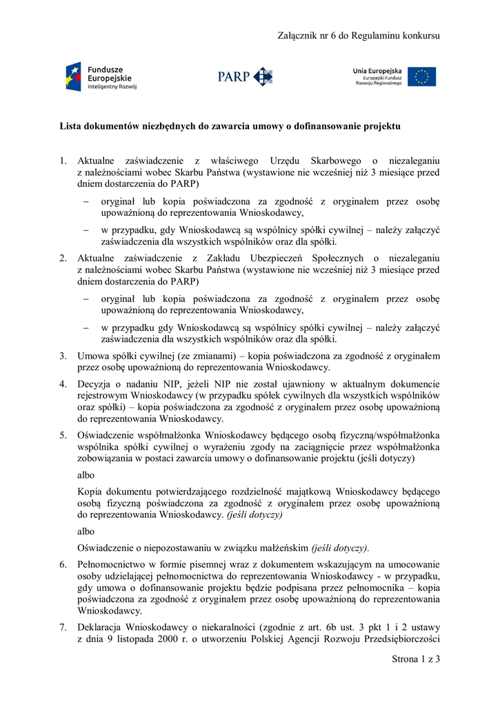 Załącznik nr 6 do Regulaminu konkursu Lista dokumentów niezbędnych do zawarcia umowy o dofinansowanie projektu 1. 2. Aktualne zaświadczenie z właściwego Urzędu Skarbowego o niezaleganiu z należnościami wobec Skarbu Państwa (wystawione nie wcześniej niż 3 miesiące przed dniem dostarczenia do PARP) oryginał lub kopia poświadczona za zgodność z oryginałem przez osobę upoważnioną do reprezentowania Wnioskodawcy, w przypadku, gdy Wnioskodawcą są wspólnicy spółki cywilnej – należy załączyć zaświadczenia dla wszystkich wspólników oraz dla spółki. Aktualne zaświadczenie z Zakładu Ubezpieczeń Społecznych o niezaleganiu z należnościami wobec Skarbu Państwa (wystawione nie wcześniej niż 3 miesiące przed dniem dostarczenia do PARP) oryginał lub kopia poświadczona za zgodność z oryginałem przez osobę upoważnioną do reprezentowania Wnioskodawcy, w przypadku gdy Wnioskodawcą są wspólnicy spółki cywilnej – należy załączyć zaświadczenia dla wszystkich wspólników oraz dla spółki. 3. Umowa spółki cywilnej (ze zmianami) – kopia poświadczona za zgodność z oryginałem przez osobę upoważnioną do reprezentowania Wnioskodawcy. 4. Decyzja o nadaniu NIP, jeżeli NIP nie został ujawniony w aktualnym dokumencie rejestrowym Wnioskodawcy (w przypadku spółek cywilnych dla wszystkich wspólników oraz spółki) – kopia poświadczona za zgodność z oryginałem przez osobę upoważnioną do reprezentowania Wnioskodawcy. 5. Oświadczenie współmałżonka Wnioskodawcy będącego osobą fizyczną/współmałżonka wspólnika spółki cywilnej o wyrażeniu zgody na zaciągnięcie przez współmałżonka zobowiązania w postaci zawarcia umowy o dofinansowanie projektu (jeśli dotyczy) albo Kopia dokumentu potwierdzającego rozdzielność majątkową Wnioskodawcy będącego osobą fizyczną poświadczona za zgodność z oryginałem przez osobę upoważnioną do reprezentowania Wnioskodawcy. (jeśli dotyczy) albo Oświadczenie o niepozostawaniu w związku małżeńskim (jeśli dotyczy). 6. Pełnomocnictwo w formie pisemnej wraz z dokumentem wskazującym na umocowanie osoby udzielającej pełnomocnictwa do reprezentowania Wnioskodawcy - w przypadku, gdy umowa o dofinansowanie projektu będzie podpisana przez pełnomocnika – kopia poświadczona za zgodność z oryginałem przez osobę upoważnioną do reprezentowania Wnioskodawcy. 7. Deklaracja Wnioskodawcy o niekaralności (zgodnie z art. 6b ust. 3 pkt 1 i 2 ustawy z dnia 9 listopada 2000 r. o utworzeniu Polskiej Agencji Rozwoju Przedsiębiorczości Strona 1 z 3 Załącznik nr 6 do Regulaminu konkursu (Dz. U. z 2016 r., poz. 359) przygotowana zgodnie ze wzorem dostępnym na stronie internetowej PARP. 8. Oświadczenie wnioskodawcy o numerze rachunku bankowego (w przypadku występowania przez wnioskodawcę o płatności zaliczkowe – numery dwóch rachunków bankowych ze wskazaniem, który z nich jest przeznaczony do obsługi płatności zaliczkowych, a który do obsługi płatności pośrednich i końcowej) oraz kopia dokumentu wystawionego przez bank dotyczącego numeru/ów rachunku bankowego wnioskodawcy poświadczona za zgodność z oryginałem przez osobę upoważnioną do reprezentowania wnioskodawcy. 9. Harmonogram płatności. 10. Wniosek o zmianę harmonogramu rzeczowo-finansowego łącznie ze zmodyfikowanym harmonogramem rzeczowo-finansowym i harmonogramem płatności (jeśli dotyczy). 11. Oświadczenie o spełnianiu kryteriów MŚP przygotowane zgodnie ze wzorem dostępnym na stronie internetowej PARP. 12. Kopie sprawozdań finansowych za okres 3 ostatnich zamkniętych lat obrotowych (a w przypadku wnioskodawców działających krócej, za okres ostatnich zamkniętych lat obrotowych), sporządzone zgodnie z przepisami o rachunkowości - jeśli Wnioskodawca ma obowiązek sporządzania sprawozdań finansowych na podstawie przepisów o rachunkowości albo tabela dotycząca sytuacji finansowej oraz zatrudnienia wnioskodawcy opracowana zgodnie ze wzorem na stronie internetowej PARP - jeśli Wnioskodawca nie ma obowiązku sporządzania sprawozdań finansowych na podstawie przepisów o rachunkowości. 13. Oświadczenie dotyczące aktualnego adresu zamieszkania (dotyczy wnioskodawców zarejestrowanych w Centralnej Ewidencji i Informacji o Działalności Gospodarczej (CEIDG) przygotowane zgodnie ze wzorem dostępnym na stronie internetowej PARP. 14. Oświadczenie o aktualności danych i oświadczeń zawartych we wniosku o dofinansowanie przygotowane zgodnie ze wzorem dostępnym na stronie internetowej PARP. 15. Oryginał wypełnionego formularza informacji przedstawianych przy ubieganiu się o pomoc de minimis, którego wzór określa rozporządzenie Rady Ministrów z dnia 29 marca 2010 r. w sprawie zakresu informacji przedstawianych przez podmiot ubiegający się o pomoc de minimis (Dz.U. Nr 53, poz. 311 z późn. zm.), z uwzględnieniem § 2 ust. 1a tego rozporządzenia. 16. Oświadczenie o wysokości pomocy de minimis, de minimis w rolnictwie i rybołówstwie uzyskanej przez wnioskodawcę (jako jednego przedsiębiorcę w rozumieniu art. 2 ust. 2 rozporządzenia Komisji (UE) nr 1407/2013 z dnia 18 grudnia 2013 r. w sprawie stosowania art. 107 i 108 Traktatu o funkcjonowaniu Unii Europejskiej do pomocy de minimis (Dz. Urz. UE L 352 z 24.12.2013) w ciągu bieżącego roku i 2 poprzednich lat podatkowych lub zaświadczenia dotyczące tej pomocy. 17. Formularz informacji przedstawianych przy ubieganiu się o pomoc inną niż pomoc w rolnictwie lub rybołówstwie, pomoc de minimis lub pomoc de minimis w rolnictwie lub rybołówstwie stanowiący załącznik do rozporządzenia Rady Ministrów z dnia 29 marca 2010 r. w sprawie zakresu informacji przedstawianych przez podmiot ubiegający się o Strona 2 z 3 Załącznik nr 6 do Regulaminu konkursu pomoc inną niż pomoc de minimis lub pomoc de minimis w rolnictwie lub rybołówstwie (Dz.U. Nr 53, poz. 312 z późn. zm.). 18. Oświadczenie o nieotr