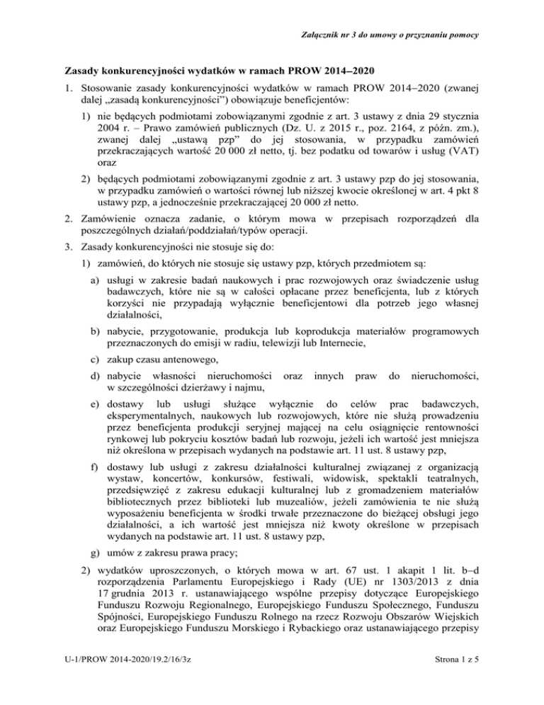 Załącznik nr 3 do umowy o przyznaniu pomocy Zasady konkurencyjności wydatków w ramach PROW 20142020 1. Stosowanie zasady konkurencyjności wydatków w ramach PROW 20142020 (zwanej dalej „zasadą konkurencyjności”) obowiązuje beneficjentów: 1) nie będących podmiotami zobowiązanymi zgodnie z art. 3 ustawy z dnia 29 stycznia 2004 r. – Prawo zamówień publicznych (Dz. U. z 2015 r., poz. 2164, z późn. zm.), zwanej dalej „ustawą pzp” do jej stosowania, w przypadku zamówień przekraczających wartość 20 000 zł netto, tj. bez podatku od towarów i usług (VAT) oraz 2) będących podmiotami zobowiązanymi zgodnie z art. 3 ustawy pzp do jej stosowania, w przypadku zamówień o wartości równej lub niższej kwocie określonej w art. 4 pkt 8 ustawy pzp, a jednocześnie przekraczającej 20 000 zł netto. 2. Zamówienie oznacza zadanie, o którym mowa w przepisach rozporządzeń dla poszczególnych działań/poddziałań/typów operacji. 3. Zasady konkurencyjności nie stosuje się do: 1) zamówień, do których nie stosuje się ustawy pzp, których przedmiotem są: a) usługi w zakresie badań naukowych i prac rozwojowych oraz świadczenie usług badawczych, które nie są w całości opłacane przez beneficjenta, lub z których korzyści nie przypadają wyłącznie beneficjentowi dla potrzeb jego własnej działalności, b) nabycie, przygotowanie, produkcja lub koprodukcja materiałów programowych przeznaczonych do emisji w radiu, telewizji lub Internecie, c) zakup czasu antenowego, d) nabycie własności nieruchomości w szczególności dzierżawy i najmu, oraz innych praw do nieruchomości, e) dostawy lub usługi służące wyłącznie do celów prac badawczych, eksperymentalnych, naukowych lub rozwojowych, które nie służą prowadzeniu przez beneficjenta produkcji seryjnej mającej na celu osiągnięcie rentowności rynkowej lub pokryciu kosztów badań lub rozwoju, jeżeli ich wartość jest mniejsza niż określona w przepisach wydanych na podstawie art. 11 ust. 8 ustawy pzp, f) dostawy lub usługi z zakresu działalności kulturalnej związanej z organizacją wystaw, koncertów, konkursów, festiwali, widowisk, spektakli teatralnych, przedsięwzięć z zakresu edukacji kulturalnej lub z gromadzeniem materiałów bibliotecznych przez biblioteki lub muzealiów, jeżeli zamówienia te nie służą wyposażeniu beneficjenta w środki trwałe przeznaczone do bieżącej obsługi jego działalności, a ich wartość jest mniejsza niż kwoty określone w przepisach wydanych na podstawie art. 11 ust. 8 ustawy pzp, g) umów z zakresu prawa pracy; 2) wydatków uproszczonych, o których mowa w art. 67 ust. 1 akapit 1 lit. bd rozporządzenia Parlamentu Europejskiego i Rady (UE) nr 1303/2013 z dnia 17 grudnia 2013 r. ustanawiającego wspólne przepisy dotyczące Europejskiego Funduszu Rozwoju Regionalnego, Europejskiego Funduszu Społecznego, Funduszu Spójności, Europejskiego Funduszu Rolnego na rzecz Rozwoju Obszarów Wiejskich oraz Europejskiego Funduszu Morskiego i Rybackiego oraz ustanawiającego przepisy U-1/PROW 2014-2020/19.2/16/3z Strona 1 z 5 Załącznik nr 3 do umowy o przyznaniu pomocy ogólne dotyczące Europejskiego Funduszu Rozwoju Regionalnego, Europejskiego Funduszu Społecznego, Funduszu Spójności i Europejskiego Funduszu Morskiego i Rybackiego oraz uchylającego rozporządzenie Rady (WE) nr 1083/2006 (Dz. Urz. UE L 347 z 20.12.2013, str. 320, z późn. zm.); 3) wydatków ponoszonych w ramach tzw. projektów grantowych, o których mowa w przepisach o rozwoju lokalnym z udziałem lokalnej społeczności; 4. Wartość zamówienia ustala się z należytą starannością, biorąc pod uwagę łączne spełnienie następujących kryteriów: a) sumowaniu podlegają usługi, dostawy i roboty budowlane tego samego rodzaju i o tym samym przeznaczeniu; b) możliwe jest udzielenie zamówienia w tym samym czasie; c) możliwe jest wykonanie zamówienia przez jednego wykonawcę dostaw, usług lub robót budowlanych (zwanego dalej „wykonawcą”). 5. W celu spełnienia zasady konkurencyjności należy: 1) upublicznić zapytanie ofertowe zgodnie z warunkami, o których mowa w ust. 8, przy czym zapytanie ofertowe zawiera co najmniej: a) opis przedmiotu zamówienia, – jednoznaczny i wyczerpujący, za pomocą dostatecznie dokładnych i zrozumiałych określeń, uwzględniający wszystkie wymagania i okoliczności mogące mieć wpływ na sporządzenie oferty, – który nie powinien odnosić się do określonego wyrobu lub źródła, szczególnych sposobów postępowania lub znaków towarowych, patentów, rodzajów lub specyficznego pochodzenia, chyba że takie odniesienie jest uzasadnione przedmiotem zamówienia i został określony zakres równoważności, b) warunki udziału w postępowaniu, c) kryteria oceny oferty oraz informację o wagach punktowych lub procentowych przypisanych do poszczególnych kryteriów oceny oferty, d) opis sposobu przyznawania punktacji za spełnienie danego kryterium oceny oferty, e) termin składania ofert, przy czym termin na złożenie oferty powinien wynosić nie mniej niż 7 dni kalendarzowych w przypadku dostaw i usług, a 14 dni kalendarzowych w przypadku robót budowlanych od dnia upublicznienia zapytania ofertowego, f) warunki wykluczenia, o którym mowa w ust. 6, g) termin realizacji zamówienia; 2) wybrać najkorzystniejszą spośród wszystkich złożonych ofert1 w oparciu o ustalone w zapytaniu ofertowym kryteria oceny. 6. Zamówienia udzielane przez beneficjenta nie mogą być udzielane podmiotom powiązanym z nim osobowo lub kapitałowo. Przez powiązania kapitałowe lub osobowe rozumie się wzajemne powiązania między beneficjentem lub osobami upoważnionymi do zaciągania zobowiązań w imieniu beneficjenta lub osobami wykonującymi w imieniu 1 W przypadku gdy beneficjent dopuszcza składanie ofert częściowych postępowanie może zakończyć się wyborem kilku wykonawców. U-1/PROW 2014-2020/19.2/16/3z Strona 2 z 5 Załą