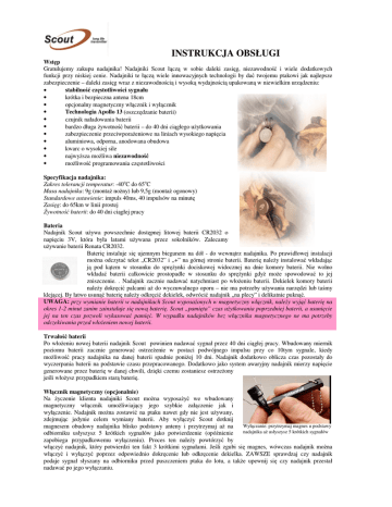 INSTRUKCJA OBSŁUGI Wstęp Gratulujemy zakupu nadajnika! Nadajniki Scout łączą w sobie daleki zasięg, niezawodność i wiele dodatkowych funkcji przy niskiej cenie. Nadajniki te łączą wiele innowacyjnych technologii by dać twojemu ptakowi jak najlepsze zabezpieczenie – daleki zasięg wraz z niezawodnością i wysoką wydajnością upakowaną w niewielkim urządzeniu: stabilność częstotliwości sygnału • • krótka i bezpieczna antena 18cm • opcjonalny magnetyczny włącznik i wyłącznik • Technologia Apollo 13 (oszczędzanie baterii) • czujnik naładowania baterii • bardzo długa żywotność baterii – do 40 dni ciągłego użytkowania • zabezpieczenie przeciwporażeniowe na liniach wysokiego napięcia • aluminiowa, odporna, anodowana obudowa • kwarc o wysokiej sile • najwyższa możliwa niezawodność • możliwość programowania częstotliwości Specyfikacja nadajnika: Zakres tolerancji temperatur: -40oC do 65oC Masa nadajnika: 9g (montaż nożny) lub 9,5g (montaż ogonowy) Standardowe ustawienie: impuls 40ms, 40 impulsów na minutę Zasięg: do 65km w linii prostej Żywotność baterii: do 40 dni ciągłej pracy Bateria Nadajnik Scout używa powszechnie dostępnej litowej baterii CR2032 o napięciu 3V, która była latami używana przez sokolników. Zalecamy używanie baterii Renata CR2032. Baterię instaluje się ujemnym biegunem na dół - do wewnątrz nadajnika. Po prawidłowej instalacji można odczytać tekst „CR2032” i „+” na górnej stronie baterii. Baterię należy instalować wkładając ją pod kątem w stosunku do sprężynki dociskowej widocznej na dnie komory baterii. Nie wolno wkładać baterii całkowicie prostopadle w stosunku do sprężynki gdyż może spowodować to jej zniszczenie. . Nadajnik zacznie nadawać natychmiast po włożeniu baterii. Dekielek komory baterii należy dokręcić palcami aż do wyczuwalnego oporu – nie ma potrzeby używania narzędzi lub taśmy klejącej. By łatwo usunąć baterię należy odkręcić dekielek, odwrócić nadajnik „na plecy” i delikatnie puknąć. UWAGA: przy wymianie baterii w nadajnikach Scout wyposażonych w magnetyczny włącznik, należy wyjąć baterię na okres 1-2 minut zanim zainstaluje się nową baterię. Scout „pamięta” czas użytkowania poprzedniej baterii, a usunięcie jej na ten czas pozwoli wykasować pamięć. W wypadku nadajników bez włącznika magnetycznego ne ma potrzeby odczekiwania przed włożeniem nowej baterii. Trwałość baterii Po włożeniu nowej baterii nadajnik Scout powinien nadawać sygnał przez 40 dni ciągłej pracy. Wbudowany miernik poziomu baterii zacznie generować ostrzeżenie w postaci podwójnego impulsu przy co 10tym sygnale, kiedy możliwość pracy nadajnika na danej baterii spadnie poniżej 10 dni. Nadajnik dodatkowo oblicza czas pozostały do wyczerpania baterii na podstawie czasu przepracowanego. Dodatkowo jako system awaryjny nadajnik mierzy napięcie generowane przez baterię w danej chwili, dzięki czemu zostaniesz ostrzeżony jeśli włożysz przypadkiem starą baterię. Włącznik magnetyczny (opcjonalnie) Na życzenie klienta nadajniki Scout można wyposażyć we wbudowany magnetyczny włącznik umożliwiający jego szybkie załączenie jak i wyłączenie. Nadajnik można zostawić na ptaku nawet gdy nie jest używany, zdejmując jedynie celem wymiany baterii. Aby wyłączyć Scout dotknij Wyłączanie: przytrzymaj magnes u podstawy magnesem obudowy nadajnika blisko podstawy anteny i przytrzymaj aż na nadajnika aż usłyszysz 5 krótkich sygnałów odbiorniku usłyszysz 5 krótkich sygnałów jako potwierdzenie (opóźnienie zapobiega przypadkowemu wyłączeniu). Proces ten należy powtórzyć by włączyć nadajnik, który potwierdzi ten fakt 3 krótkimi sygnałami. Jeśli zgubi się magnes, wówczas nadajnik można włączyć i wyłączyć poprzez odpowiednio dokręcenie lub odkręcenie dekielka. ZAWSZE sprawdzaj czy nadajnik podaje sygnał słyszany na odbiorniku przed puszczeniem ptaka do lotu, a także upewnij się czy nadajnik przestał nadawać po jego wyłączaniu. UWAGA: Ponieważ Scout pobiera bardzo niewielką ilość energii, kiedy jest wyłączony magnesem, nie należy się martwić zużyciem baterii w takim wypadku. Nowo włożona bateria do nadajnika, który nie będzie używany, będzie nadal tak samo naładowana nawet po 2 latach od jej zainstalowania. Technologia Apollo 13: jeśli nadajnik działa bez przerwy przez ponad 24 godziny, oznacza to iż twój ptak najprawdopodobniej się zgubił. Nadajnik robi wówczas dokładnie to samo co zrobiłaby NASA: zaczyna oszczędzać baterię spowalniając częstość jak i długość nadawania sygnału. Jeśli twój ptak zgubi się z nadajnikiem wyposażonym w nową baterię, technologia Apollo 13 uaktywni się po 24 godzinach dając ci do 40 dni na odnalezienie swojego ptaka. Jeśli zgubisz ptaka tuż przed pojawieniem się sygnału ostrzegającego o niskim poziomie baterii wówczas nadajnik będzie działać jeszcze przez 10 dni. Konserwacja Scout jest całkowicie wodoszczelny i może być myty gorąca wodą. Należy się upewnić, że wnętrze komory na baterie jest suche przed zainstalowaniem nowej baterii. Antenę należy sprawdzać regularnie i wymienić natychmiast jeśli zauważy się jakiekolwiek ślady pęknięcia izolacji lub wystające części metalowe anteny. W wypadku montażu ogonowego zawsze należy sprawdzać stan sprężyny nadajnika, którą mocuje się go do klipsa. W wypadku zauważenia jakichkolwiek oznak zmęczenia materiału lub pęknięć należy ją bezzwłocznie wymienić. W wypadku montażu nożnego należy sprawdzać oczko przy dekielku na obecność pęknięć lub zużycia. Wymiana anteny Krótką antenę nadajnika Scout można wymienić w warunkach polowych. Należy używać tylko anten firmy Marshall z unikalną technologią zapobiegającą porażeniu prądem z linii wysokiego napięcia. Długość anteny dla Scout wynosi 18