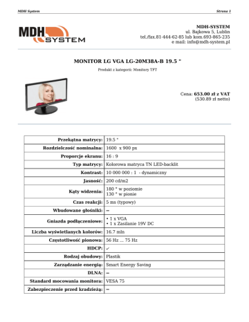 MDH System Strona 1 MDH-SYSTEM ul. Bajkowa 5, Lublin tel./fax.81-444-62-85 lub kom.693-865-235 e mail: [email protected] MONITOR LG VGA LG-20M38A-B 19.5 " Produkt z kategorii: Monitory TFT Cena: 653.00 zł z VAT (530.89 zł netto) Przekątna matrycy: 19.5 " Rozdzielczość nominalna: 1600 x 900 px Proporcje ekranu: 16 : 9 Typ matrycy: Kolorowa matryca TN LED-backlit Kontrast: 10 000 000 : 1 - dynamiczny Jasność: 200 cd/m2 Kąty widzenia: 180 ° w poziomie 130 ° w pionie Czas reakcji: 5 ms (typowy) Wbudowane głośniki: Gniazda podłączeniowe: • 1 x VGA • 1 x Zasilanie 19V DC Liczba wyświetlanych kolorów: 16.7 mln Częstotliwość pionowa: 56 Hz ... 75 Hz HDCP: Rodzaj obudowy: Plastik Zarządzanie energią: Smart Energy Saving DLNA: Standard mocowania monitora: VESA 75 Zabezpieczenie przed kradzieżą: MDH System Strona 2 Regulacja parametrów: OSD - za pomocą przycisków na monitorze OnScreen Control - z poziomu PC • Flicker Safe - Technologia eliminująca męczący oczy efekt migotania obrazu • Podział ekranu na strefy Wybrane funkcje: • PIP - Obraz w obrazie • Tryb czytelnika - Ocieplenie obrazu, zwiększające komfort czytania oraz pracy z tekstem Zasilanie: 19 V DC / 0.84 A (zasilacz w komplecie) Pobór mocy: • 20 W (typowo) • 0.3 W (w trybie uśpienia) Waga: 2.2 kg Wymiary: • 463 x 359 x 168 mm (z podstawką) • 463 x 286 x 57 (bez podstawki) Producent / Marka: LG Przyciski sterujące menu OSD: MDH System Strona 3 Widok z boku: Widok z tyłu: MDH System Strona 4 Złącza monitora: W zestawie: Zapraszamy do naszego sklepu internetowego www.mdh-system.pl Dokument wygenerowany 2017-03-02 o godzinie 16:17