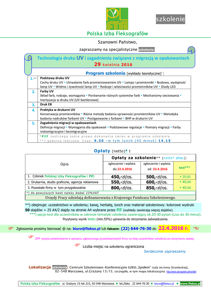 szkolenie Polska Izba Fleksografów Szanowni Państwo, zapraszamy na specjalistyczne szkolenie:: Technologia druku UV i zagadnienia związane z migracją w opakowaniach 29 kwietnia 2016 Program szkolenia (wykłady teoretyczne)* : 1.** Podstawy druku UV 2. Cechy druku UV y Utrwalanie farb promieniowaniem UV y Lampy i promienniki y Budowa, wydajność lamp UV y Widmo i żywotność lamp UV y Rodzaje i właściwości promienników UV y Diody LED Farby UV Skład farb, rodzaje, wymagania y Porównanie różnych systemów farb y Mechanizmy sieciowania y Inertyzacja w druku UV (UV beztlenowe) Druk EB 3. 4. Praktyka w drukarni UV 5. Konserwacja promienników y Różne metody badania sprawności promienników UV y Metodyka badania nadruków farbami UV y Postępowanie z farbami y BHP w drukarni UV Zagadnienia migracji w opakowaniach Definicje migracji y Wymagania dla opakowań y Podstawowe regulacje y Pomiary migracji y Farby niskomigracyjne i bezmigracyjne *PIF zastrzega sobie prawo dokonania zmian w programie szkolenia **) godzina lekcyjna. Czas: 9.30 –w tym lunch (45 minut) 14.15 Opłaty ( n e t t o ) * : Opłaty za szkolenie * * ( n e t t o * zł/os.) : Opis 1. Członek Polskiej Izby Fleksografów ( PIF) 2. Drukarnia, studio graficzne, agencja reklamowa 3. Pozostałe firmy w tym przygotowalnie zgłoszenie i wpłata zgłoszenie i wpłata do 22.4.2016 od 23.4.2016 test*** 450,-zł/os. 550,-zł/os. 800,-zł/os. 500,-zł/os. 600,-zł/os. 850,-zł/os. + 20,00 + 40,00 + 40,00 *) do powyższych kwot należy dodać 23%VAT Urzędy Pracy udzielają dofinansowania z Krajowego Funduszu Szkoleniowego. **) obejmuje: uczestnictwo w szkoleniu; kawę, herbatę, lunch oraz materiał szkoleniowy: kolorowe wydruki 50 slajdów = 25 A4/2 slajdy na stronie A4 wybrane przez PIF (wykłady zawierają więcej slajdów). ***) opcja‐test dla uczestników w zakresie tematyki szkolenia zawierający ok.20‐30 pytań (czas do 30 minut). Pozytywny wynik testu (min.55%) uprawnia do otrzymania zaświadczenia. ) Zgłoszenia prosimy kierować @ na: [email protected] lub faksem: (22) 644-76-30 do ) 22.4.2016 r. ( ZPF wysyła potwierdzenie o wpisaniu zgłoszonego przedstawiciela/li firmy na listę uczestników szkolenia po otrzymaniu wpłaty. ) Liczba miejsc na szkoleniu ograniczona Serdecznie zapraszamy Lokalizacja szkolenia: Centrum Szkoleniowo-Konferencyjne KZRSS „Społem” (sala im.Ireny Strzeleckiej), 02-548 Warszawa, ul.Grażyny 13/15; szczegóły, w tym mapa lokalizacyjna: http://www.csk-spolem.pl/kontakt Polska Izba Fleksografów ul. Grażyny 15 lok.315, 02-548 Warszawa z tel./faks: 22 644-76-30 z [email protected] z www.flekso.pl UV i migracja w opakowaniach 29 kwietnia 2016 Karta zgłoszenia udziału Zgłaszam udział w szkoleniu następujących osób: Imię i nazwisko Stanowisko Rejestracja i warunki udziału w szkoleniu : 1. Przesłanie mejlem wypełnionej Karty zgłoszenia udziału 2. Wyliczenie opłaty udziałowej następuje na podstawie miejsca zatrudnienia zgłaszanego pracownika a nie w imieniu i wg stawki obowiązującej firmę zgłaszającą. 3. Dokonanie wpłaty przed datą szkolenia. Osoby zgłaszające się na szkolenie bez przedpłaty nie będą wpisane na liście uczestników i nie będą miały prawa udziału w szkoleniu. 4. O uczestnictwie w szkoleniu decyduje PIF oraz kolejność zgłoszeń. 5. Karty zgłoszenia udziału bez wpisanej (poniżej) wyliczonej kwoty należności (wraz z doliczonym vatem) oraz dokonanej wpłaty nie będą brane pod uwagę. 6. Koszt udziału w szkoleniu nie obejmuje usług dodatkowych jak np.noclegu/ów oraz dojazdu do miejsca szkolenia, które pokrywa uczestnik. 7. W przypadku rezygnacji i nie powiadomienia pisemnego PIF w terminie nie później niż 5 dni roboczych przed szkoleniem wpłacona kwota nie podlega zwrotowi. 8. PIF zastrzega sobie prawa do zmiany programu, jak również odwołania szkolenia, wtedy dokonane wpłaty zostaną zwrócone w 100 %. Należność w wysokości (wraz z podatkiem VAT): ................................................................... zł wpłaciliśmy na konto Polskiej Izby BNP Paribas Bank Polska S.A. O/W-wa nr PL 33 1600 1127 1847 8364 6000 0001 Fleksografów: Lokalizacja szkolenia: Centrum Szkoleniowo-Konferencyjne KZRSS „Społem” (sala im.Ireny Strzeleckiej) , 02-548 Warszawa, ul.Grażyny 15; szczegóły, w tym mapa lokalizacyjna: http://www.csk-spolem.pl/kontakt Firma: Ulica: Kod: NIP: Miasto: e.mail: Tel.kontaktowy : Imię i nazwisko osoby kontaktowej studio graficzne* agencja reklamowa* przygotowalnia* drukarnia* dostawca* inne * : *) pr. właściwe zaznaczyć lub wpisać Wyrażam zgodę na przetwarzanie przez Polską Izbę Fleksografów (PIF) z siedzibą w Warszawie danych osobowych zawartych w formularzu zgłoszenia na potrzeby realizacji szkolenia zgodnie z ustawą z 29.8.1997 r. o ochronie danych osobowych. (Dz. U. z 2002 r. Nr 101, poz. 926 z późniejszymi zmianami). PIF zapewnia Zgłaszającemu prawo wglądu i zmiany swoich danych osobowych. Udzielam / nie udzielam (pr. niepotrzebne skreślić) zgody na przesyłanie korespondencji marketingowo-handlowej oraz promocyjnej związanej z działalnością Polskiej Izby Fleksografów (PIF). pieczęć …………………….................................... podpis osoby upoważnionej data .................... Polska Izba Fleksografów ul. Grażyny 15 lok.315, 02-548 Warszawa z tel./faks: 22 644-76-30 z [email protected] z www.flekso.pl