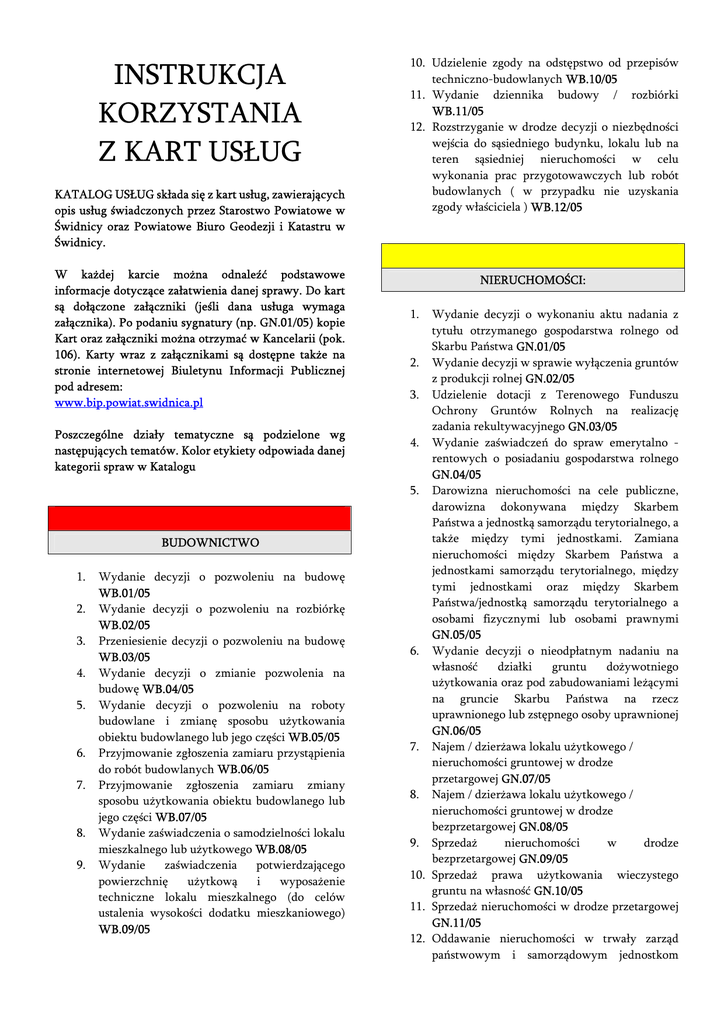 INSTRUKCJA KORZYSTANIA Z KART USŁUG KATALOG USŁUG składa się z kart usług, zawierających opis usług świadczonych przez Starostwo Powiatowe w Świdnicy oraz Powiatowe Biuro Geodezji i Katastru w Świdnicy. W każdej karcie można odnaleźć podstawowe informacje dotyczące załatwienia danej sprawy. Do kart są dołączone załączniki (jeśli dana usługa wymaga załącznika). Po podaniu sygnatury (np. GN.01/05) kopie Kart oraz załączniki można otrzymać w Kancelarii (pok. 106). Karty wraz z załącznikami są dostępne także na stronie internetowej Biuletynu Informacji Publicznej pod adresem: www.bip.powiat.swidnica.pl Poszczególne działy tematyczne są podzielone wg następujących tematów. Kolor etykiety odpowiada danej kategorii spraw w Katalogu BUDOWNICTWO 1. 2. 3. 4. 5. 6. 7. 8. 9. Wydanie decyzji o pozwoleniu na budowę WB.01/05 Wydanie decyzji o pozwoleniu na rozbiórkę WB.02/05 Przeniesienie decyzji o pozwoleniu na budowę WB.03/05 Wydanie decyzji o zmianie pozwolenia na budowę WB.04/05 Wydanie decyzji o pozwoleniu na roboty budowlane i zmianę sposobu użytkowania obiektu budowlanego lub jego części WB.05/05 Przyjmowanie zgłoszenia zamiaru przystąpienia do robót budowlanych WB.06/05 Przyjmowanie zgłoszenia zamiaru zmiany sposobu użytkowania obiektu budowlanego lub jego części WB.07/05 Wydanie zaświadczenia o samodzielności lokalu mieszkalnego lub użytkowego WB.08/05 Wydanie zaświadczenia potwierdzającego powierzchnię użytkową i wyposażenie techniczne lokalu mieszkalnego (do celów ustalenia wysokości dodatku mieszkaniowego) WB.09/05 10. Udzielenie zgody na odstępstwo od przepisów techniczno-budowlanych WB.10/05 11. Wydanie dziennika budowy / rozbiórki WB.11/05 12. Rozstrzyganie w drodze decyzji o niezbędności wejścia do sąsiedniego budynku, lokalu lub na teren sąsiedniej nieruchomości w celu wykonania prac przygotowawczych lub robót budowlanych ( w przypadku nie uzyskania zgody właściciela ) WB.12/05 NIERUCHOMOŚCI: 1. Wydanie decyzji o wykonaniu aktu nadania z tytułu otrzymanego gospodarstwa rolnego od Skarbu Państwa GN.01/05 2. Wydanie decyzji w sprawie wyłączenia gruntów z produkcji rolnej GN.02/05 3. Udzielenie dotacji z Terenowego Funduszu Ochrony Gruntów Rolnych na realizację zadania rekultywacyjnego GN.03/05 4. Wydanie zaświadczeń do spraw emerytalno rentowych o posiadaniu gospodarstwa rolnego GN.04/05 5. Darowizna nieruchomości na cele publiczne, darowizna dokonywana między Skarbem Państwa a jednostką samorządu terytorialnego, a także między tymi jednostkami. Zamiana nieruchomości między Skarbem Państwa a jednostkami samorządu terytorialnego, między tymi jednostkami oraz między Skarbem Państwa/jednostką samorządu terytorialnego a osobami fizycznymi lub osobami prawnymi GN.05/05 6. Wydanie decyzji o nieodpłatnym nadaniu na własność działki gruntu dożywotniego użytkowania oraz pod zabudowaniami leżącymi na gruncie Skarbu Państwa na rzecz uprawnionego lub zstępnego osoby uprawnionej GN.06/05 7. Najem / dzierżawa lokalu użytkowego / nieruchomości gruntowej w drodze przetargowej GN.07/05 8. Najem / dzierżawa lokalu użytkowego / nieruchomości gruntowej w drodze bezprzetargowej GN.08/05 9. Sprzedaż nieruchomości w drodze bezprzetargowej GN.09/05 10. Sprzedaż prawa użytkowania wieczystego gruntu na własność GN.10/05 11. Sprzedaż nieruchomości w drodze przetargowej GN.11/05 12. Oddawanie nieruchomości w trwały zarząd państwowym i samorządowym jednostkom organizacyjnym, przekazywanie trwałego zarządu między jednostkami organizacyjnymi i orzekanie o wygaśnięciu trwałego zarządu GN.12/05 GEODEZJA I KATASTER 1. 2. 3. 4. 5. 6. 7. 8. Gleboznawcza klasyfikacja gruntów – wydanie decyzji GK.01/05 Obsługa zgłoszeń prac geodezyjnych GK.02/05 Udostępnianie bazy danych kartograficznych i opisowych gruntów, rejestru granic i powierzchni gmin i obrębów GK.03/05 Uzgodnienie usytuowania projektowanych sieci uzbrojenia podziemnego terenu GK.04/05 Wydawanie wypisów i wyrysów z operatu ewidencyjnego GK.05/05 Wydawanie wypisów z rejestru gruntów, udzielanie informacji o gruntach GK.06/05 Wykonywanie kopii map, udostępnianie danych i materiałów geodezyjnych GK.07/05 Zgłaszanie zmian danych objętych ewidencją gruntów i budynków GK.08/05 10. Wpis do rejestru przedsiębiorców prowadzących ośrodek szkolenia kierowców KT.10/05 11. Wydanie karty parkingowej placówkom zajmujących się opieką, rehabilitacją lub edukacja osób niepełnosprawnych KT.11/05 12. Wydanie karty parkingowej osobie niepełnosprawnej KT.12/05 13. Wydanie licencji na wykonywanie transportu drogowego osób lub rzeczy KT.13/05 14. Wydanie międzynarodowego prawa jazdy KT.14/05 15. Wydanie zaświadczeń na przewozy drogowe osób lub rzeczy na potrzeby własne KT.15/05 16. Wydanie prawa jazdy KT.16/05 17. Wymiana prawa jazdy lub wydanie wtórnika KT.17/05 18. Zwrot zatrzymanego prawa jazdy, przywrócenie cofniętego uprawnienia do kierowania pojazdami KT.18 /05 19. Wydawanie zezwoleń na wykonywanie regularnych i regularnych specjalnych przewozów osób w krajowym transporcie drogowym KT.19/05 SPRAWY OBYWATELSKIE KOMUNIKACJA I TRANSPORT 1. 2. 3. 4. 5. 6. 7. 8. 9. Wydawanie uprawnienia diagnosty do wykonywania badań technicznych pojazdów KT.01/05 Wpis do rejestru przedsiębiorców prowadzących stację kontroli pojazdów KT.02/05 Czasowe wycofanie pojazdu z ruchu KT.03/05 Pierwsza rejestracja pojazdu nowego zakupionego na terenie Rzeczypospolitej Polskiej KT.04/05 Pierwsza rejestracja pojazdu na terenie Rzeczypospolitej Polskiej, sprowadzonego z zagranicy KT.05/05 Rejestracja pojazdu w przypadku zmiany właściciela pojazdu zarejestrowanego na terenie Rzeczypospolitej Polskiej KT.06/05 Wyrejestrowanie pojazdu KT.07/05 Zgłoszenie zbycia pojazdu (zmiany właściciela) KT.08/05 Wpis do ewidencji instruktorów nauki jazdy KT.09/05 1. 2. 3. 4. 5. Zezwolenia Starosty Świdnickiego na sprowadzenie zwłok/s
