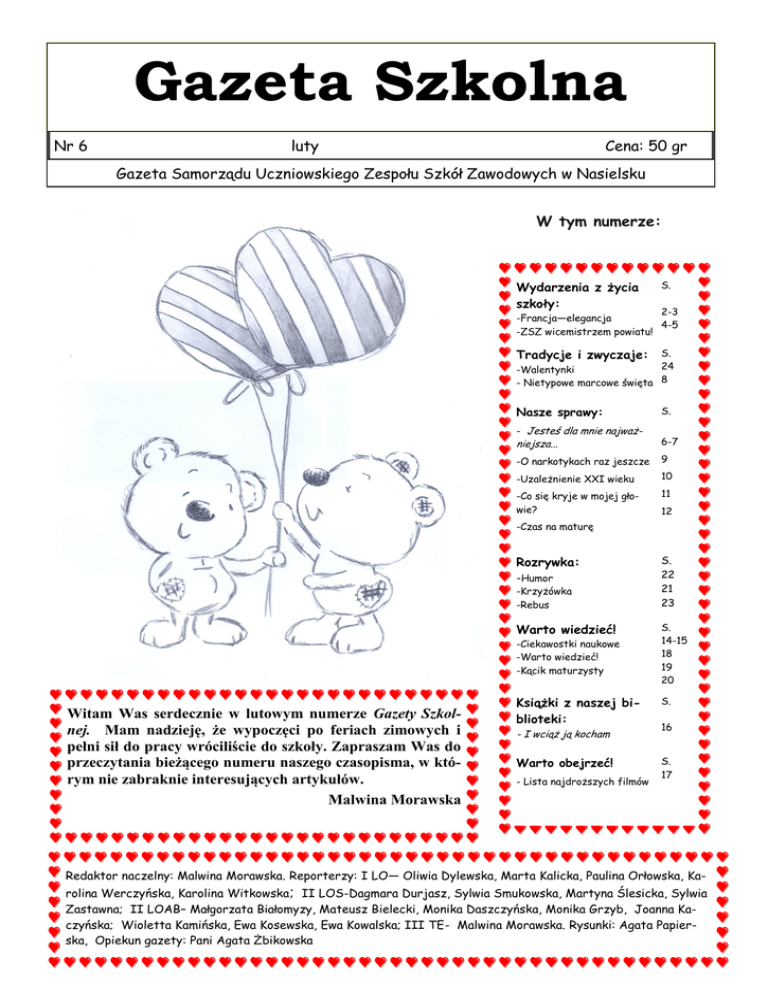 Gazeta Szkolna Nr 6 luty Cena: 50 gr Gazeta Samorządu Uczniowskiego Zespołu Szkół Zawodowych w Nasielsku W tym numerze: Wydarzenia z życia szkoły: S. 2-3 -Francja—elegancja 4-5 -ZSZ wicemistrzem powiatu! Tradycje i zwyczaje: S. 24 -Walentynki - Nietypowe marcowe święta 8 Nasze sprawy: - Jesteś dla mnie najważ- S. niejsza... 6-7 -O narkotykach raz jeszcze 9 -Uzależnienie XXI wieku 10 -Co się kryje w mojej głowie? 11 12 -Czas na maturę Rozrywka: -Humor -Krzyżówka -Rebus Warto wiedzieć! -Ciekawostki naukowe -Warto wiedzieć! -Kącik maturzysty Witam Was serdecznie w lutowym numerze Gazety Szkolnej. Mam nadzieję, że wypoczęci po feriach zimowych i pełni sił do pracy wróciliście do szkoły. Zapraszam Was do przeczytania bieżącego numeru naszego czasopisma, w którym nie zabraknie interesujących artykułów. Malwina Morawska S. 22 21 23 S. 14-15 18 19 20 Książki z naszej biblioteki: S. Warto obejrzeć! S. 17 - I wciąż ją kocham - Lista najdroższych filmów 16 Redaktor naczelny: Malwina Morawska. Reporterzy: I LO— Oliwia Dylewska, Marta Kalicka, Paulina Orłowska, Karolina Werczyńska, Karolina Witkowska; II LOS-Dagmara Durjasz, Sylwia Smukowska, Martyna Ślesicka, Sylwia Zastawna; II LOAB– Małgorzata Białomyzy, Mateusz Bielecki, Monika Daszczyńska, Monika Grzyb, Joanna Kaczyńska; Wioletta Kamińska, Ewa Kosewska, Ewa Kowalska; III TE- Malwina Morawska. Rysunki: Agata Papierska, Opiekun gazety: Pani Agata Żbikowska Wydarzenia z życia szkoły Stereotypy kulturowe w uczeniu się języka francuskiego Uczniowie klasy II liceum z Zespołu Szkół Zawodowych w Nasielsku wzięli udział w zajęciach dla licealistów zorganizowanych przez Instytut Romanistyki w Warszawie. Na początku roku akademickiego 2012/2013 Instytut Romanistyki przeniósł się z ulicy Oboźnej do nowej siedziby przy ulicy Dobrej 55. Uczniowie mogli podziwiać nowo otwarty, nowoczesny, przestrzenny budynek dydaktyczny powstały dla potrzeb Wydziału Lingwistyki Stosowanej oraz Wydziału Neofilologii Uniwersytetu Warszawskiego, umożliwiający kształcenie w oparciu o nowoczesny sprzęt, aparaturę i specjalistyczne oprogramowanie dydaktyczne. Zajęcia zostały przeprowadzone przez prof. dr hab. Jolantę Zając. Temat spotkania to: „Francja-elegancja, czyli o stereotypach kulturowych w uczeniu się języka francuskiego”. Na wstępie spotkania dowiedzieliśmy się, które narody są w Polsce najbardziej lubiane. Okazało się, że 35% Polaków lubi Amerykanów za ich spontaniczność, poczucie humoru, na drugim miejscu plasują się Niemcy, natomiast 19, 7% Polaków uznało, że ulubioną przez nas nacją są Francuzi. Potocznie nazywamy Francuzów żabojadami, ale okazało się, że z żabami mają oni niewiele wspólnego. Żabimi udkami zajadają się głównie turyści, którzy są ciekawi smaku tego wykwintnego i niezwykle drogiego dania. Dla tych, którzy lubią eksperymentować i poznawać nowe smaki, niezbędna rada z naszej strony - najlepsze „mięsko” ma żaba zielona, nieco mniej smaczna jest żaba ruda. Okazało się, że Francuzi to prędzej „ślimakojady”. Ślimaki podaje się na specjalnym talerzu wraz ze szczypczykami i widelcem o dwóch zębach. Na wykładzie młodzież mogła dowiedzieć się również o tym, czy wszystkie francuskie wina są świetne i jak rozpoznawać ich jakość po etykietach. Należy bacznie przyglądać się różnym znakom umieszczonym na nich. Znaki AOC, VDQS są gwarancją dobrej jakości francuskiego wina, natomiast wina tzw. „vin de table” należy raczej się wystrzegać, ponieważ spożycie tego rodzaju trunku można przypłacić poważnymi dolegliwościami żołądkowymi. Nr 6 luty 2013 Gazeta Szkolna Każda butelka ma zaznaczony rocznik, niektóre były dobre (słoneczne) i dały świetne wina, inne gorsze (chłodniejsze i deszczowe) i dały gorsze, to właśnie składa się na ogromną wiedzę enologa, specjalisty od smaku wina. Dowiedzieliśmy się również, że prawdziwy szampan pochodzi z regionu Francji Szampanii. Trunki, które najczęściej spożywamy w noc sylwestrową, to wina musujące, które nie mają nic wspólnego z szampanem. Francuzi wynaleźli wiele określeń, których nie sposób zliczyć, aby zachwycać się smakiem, kolorem, a nawet bąbelkami szampana. Szampan na pewno nie jest lepszy im starszy, po kilku latach traci swe walory smakowe i zapachowe. Szampan towarzyszy najszlachetniejszym daniom: łosoś, ostrygi, szlachetne mięsa i delikatne desery. Dla smakoszy kuchni, nie tylko francuskiej, polecić możemy książkę „Filozofia smaku” Anthelme’a Brillant-Savarin’a, która jest naukową rozprawą o potrawach i jedzeniu, opartą na wiedzy chemicznej, ludzkiej anatomii i medycynie. Jest pochwałą dobrego smaku w jedzeniu, wychwala zalety zdrowej żywności. My, kobietki lubimy czytać i słuchać o modzie, kosmetykach i wszelkich nowinkach, które czynią nas pięknymi i wpływają na nasze dobre samopoczucie. Dlatego też z zaciekawieniem wsłuchiwałyśmy się w słowa pani Jolanty Zając, która wprowadziła nas w świat francuskiej mody. Przedstawiła ona sylwetkę Coco Chanel, która wylansowała krótkie włosy dla kobiet, sznury długich pereł opadających nawet na ramiona i plecy, styl męski w modzie damskiej, wygodne, niekrępujące ruchów spodnie, skromne kapelusze, bez przepychu i zbędnych ozdób, a przede wszystkim perfumy Chanel n 5. Na koniec wykładu młodzież mogła sprawdzić swoją pamięć i zdolność koncentracji, wykonując quiz. Okazało się, że mamy bardzo kulturalną, zdolną i otwartą na wiedzę młodzież, która doskonale wywiązała się z powierzonego im zadania. Wykład był niezwykle interesujący, poruszał temat stereotypów kulturowych we Francji w bardzo dostępny i swobodny sposób. Uczniowie z zainteresowaniem słuchali wykładowcy, który bardzo żywiołowo i ciekawie przekazywał nam szereg pouczających informacji. Anna Łączyńska Nr 6 luty 2