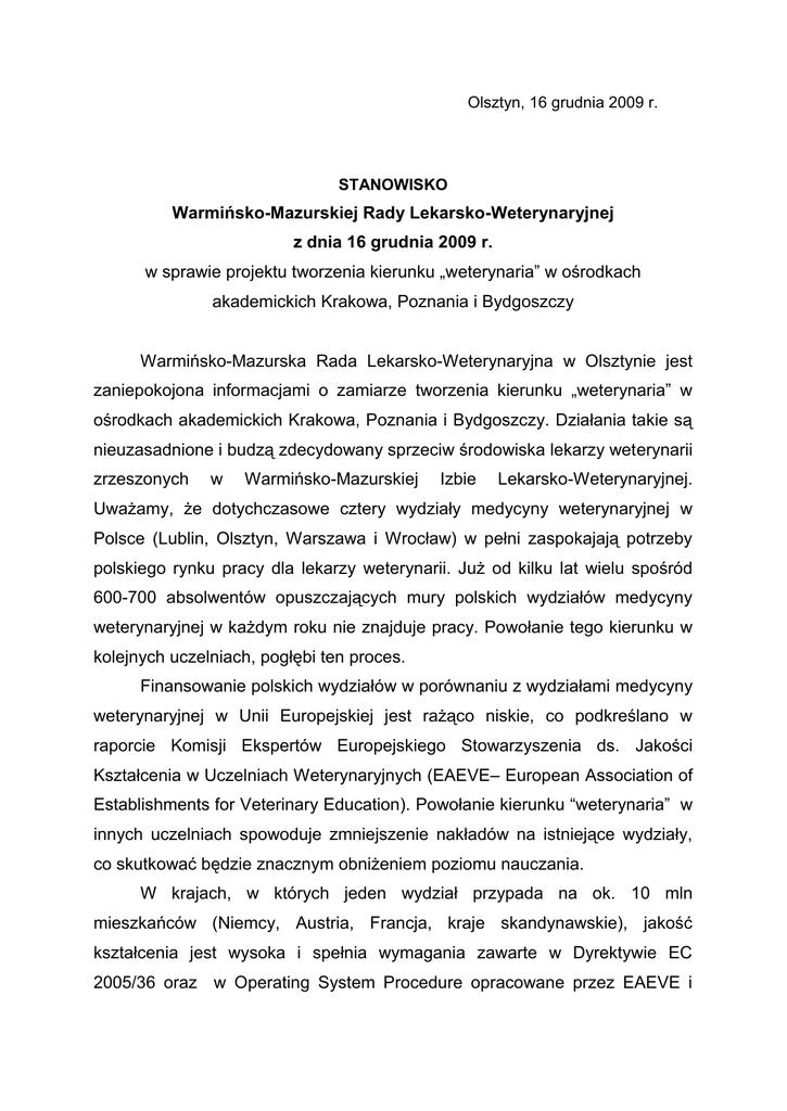 Olsztyn, 16 grudnia 2009 r. STANOWISKO Warmińsko-Mazurskiej Rady Lekarsko-Weterynaryjnej z dnia 16 grudnia 2009 r. w sprawie projektu tworzenia kierunku „weterynaria” w ośrodkach akademickich Krakowa, Poznania i Bydgoszczy Warmińsko-Mazurska Rada Lekarsko-Weterynaryjna w Olsztynie jest zaniepokojona informacjami o zamiarze tworzenia kierunku „weterynaria” w ośrodkach akademickich Krakowa, Poznania i Bydgoszczy. Działania takie są nieuzasadnione i budzą zdecydowany sprzeciw środowiska lekarzy weterynarii zrzeszonych w Warmińsko-Mazurskiej Izbie Lekarsko-Weterynaryjnej. Uważamy, że dotychczasowe cztery wydziały medycyny weterynaryjnej w Polsce (Lublin, Olsztyn, Warszawa i Wrocław) w pełni zaspokajają potrzeby polskiego rynku pracy dla lekarzy weterynarii. Już od kilku lat wielu spośród 600-700 absolwentów opuszczających mury polskich wydziałów medycyny weterynaryjnej w każdym roku nie znajduje pracy. Powołanie tego kierunku w kolejnych uczelniach, pogłębi ten proces. Finansowanie polskich wydziałów w porównaniu z wydziałami medycyny weterynaryjnej w Unii Europejskiej jest rażąco niskie, co podkreślano w raporcie Komisji Ekspertów Europejskiego Stowarzyszenia ds. Jakości Kształcenia w Uczelniach Weterynaryjnych (EAEVE– European Association of Establishments for Veterinary Education). Powołanie kierunku “weterynaria” w innych uczelniach spowoduje zmniejszenie nakładów na istniejące wydziały, co skutkować będzie znacznym obniżeniem poziomu nauczania. W krajach, w których jeden wydział przypada na ok. 10 mln mieszkańców (Niemcy, Austria, Francja, kraje skandynawskie), jakość kształcenia jest wysoka i spełnia wymagania zawarte w Dyrektywie EC 2005/36 oraz w Operating System Procedure opracowane przez EAEVE i 2 określające minimalne kryteria kształcenia na europejskich wydziałach medycyny weterynaryjnej. Kierując się dużą troską o jakość kształcenia lekarzy weterynarii w Polsce i zapewnienia im odpowiedniej liczby miejsc pracy, zwracamy się z apelem do władz uczelni, które zamierzają tworzyć kierunek „weterynaria” w Polsce by nie kierowały się wyłącznie partykularnymi interesami swojego środowiska akademickiego i zaniechały tych działań. Prezes Warmińsko-Mazurskiej Izby Lekarsko-Weterynaryjnej lek. wet. Jacek Łukaszewicz Otrzymują: 1. 2. 3. 4. 5. 6. 7. 8. 9. 10. 11. 12. 13. 14. Minister Nauki i Szkolnictwa Wyższego Minister Rolnictwa i Rozwoju Wsi Rada Główna Szkolnictwa Wyższego Państwowa Komisja Akredytacyjna Przewodniczący Konferencji Rektorów Akademickich Szkół Polskich (KRASP) Rektor Uniwersytetu Przyrodniczego w Lublinie Rektor Uniwersytetu Warmińsko-Mazurskiego w Olsztynie Rektor Szkoły Głównej Gospodarstwa Wiejskiego w Warszawie Rektor Uniwersytetu Przyrodniczego we Wrocławiu Rektor Uniwersytetu Jagiellońskiego w Krakowie Rektor Uniwersytetu Rolniczego w Krakowie Rektor Uniwersytetu Technologiczno-Przyrodniczego w Bydgoszczy Rektor Uniwersytetu Przyrodniczego w Poznaniu Dziekani Wydziałów Medycyny Weterynaryjnej w Lublinie, Olsztynie, Warszawie i Wrocławiu