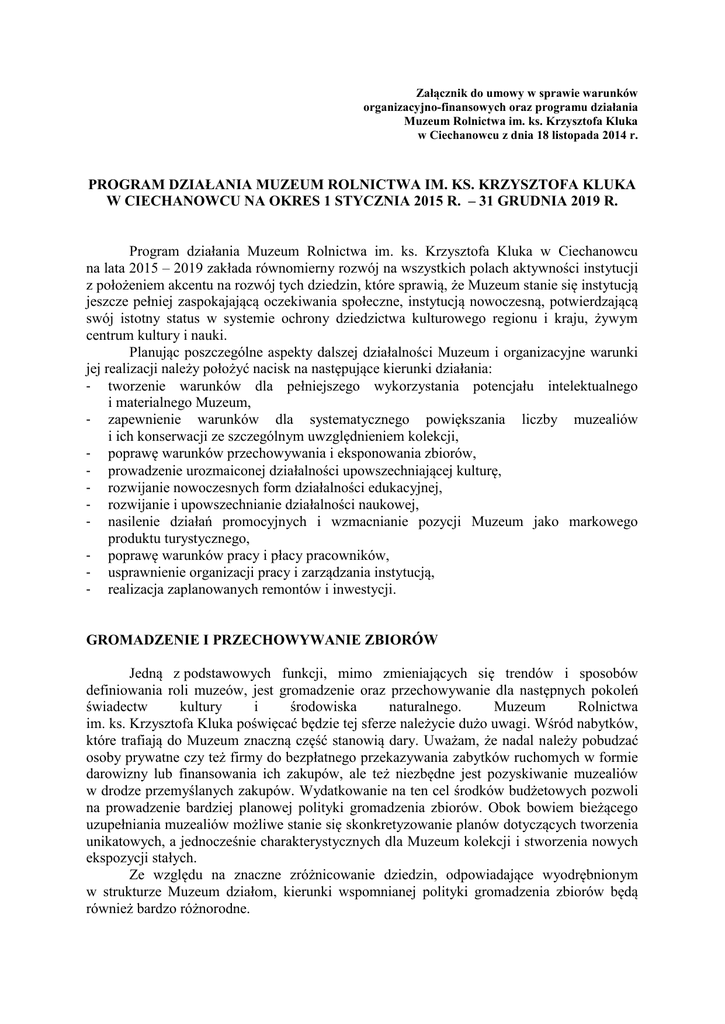 Załącznik do umowy w sprawie warunków organizacyjno-finansowych oraz programu działania Muzeum Rolnictwa im. ks. Krzysztofa Kluka w Ciechanowcu z dnia 18 listopada 2014 r. PROGRAM DZIAŁANIA MUZEUM ROLNICTWA IM. KS. KRZYSZTOFA KLUKA W CIECHANOWCU NA OKRES 1 STYCZNIA 2015 R. – 31 GRUDNIA 2019 R. Program działania Muzeum Rolnictwa im. ks. Krzysztofa Kluka w Ciechanowcu na lata 2015 – 2019 zakłada równomierny rozwój na wszystkich polach aktywności instytucji z położeniem akcentu na rozwój tych dziedzin, które sprawią, że Muzeum stanie się instytucją jeszcze pełniej zaspokajającą oczekiwania społeczne, instytucją nowoczesną, potwierdzającą swój istotny status w systemie ochrony dziedzictwa kulturowego regionu i kraju, żywym centrum kultury i nauki. Planując poszczególne aspekty dalszej działalności Muzeum i organizacyjne warunki jej realizacji należy położyć nacisk na następujące kierunki działania: - tworzenie warunków dla pełniejszego wykorzystania potencjału intelektualnego i materialnego Muzeum, - zapewnienie warunków dla systematycznego powiększania liczby muzealiów i ich konserwacji ze szczególnym uwzględnieniem kolekcji, - poprawę warunków przechowywania i eksponowania zbiorów, - prowadzenie urozmaiconej działalności upowszechniającej kulturę, - rozwijanie nowoczesnych form działalności edukacyjnej, - rozwijanie i upowszechnianie działalności naukowej, - nasilenie działań promocyjnych i wzmacnianie pozycji Muzeum jako markowego produktu turystycznego, - poprawę warunków pracy i płacy pracowników, - usprawnienie organizacji pracy i zarządzania instytucją, - realizacja zaplanowanych remontów i inwestycji. GROMADZENIE I PRZECHOWYWANIE ZBIORÓW Jedną z podstawowych funkcji, mimo zmieniających się trendów i sposobów definiowania roli muzeów, jest gromadzenie oraz przechowywanie dla następnych pokoleń świadectw kultury i środowiska naturalnego. Muzeum Rolnictwa im. ks. Krzysztofa Kluka poświęcać będzie tej sferze należycie dużo uwagi. Wśród nabytków, które trafiają do Muzeum znaczną część stanowią dary. Uważam, że nadal należy pobudzać osoby prywatne czy też firmy do bezpłatnego przekazywania zabytków ruchomych w formie darowizny lub finansowania ich zakupów, ale też niezbędne jest pozyskiwanie muzealiów w drodze przemyślanych zakupów. Wydatkowanie na ten cel środków budżetowych pozwoli na prowadzenie bardziej planowej polityki gromadzenia zbiorów. Obok bowiem bieżącego uzupełniania muzealiów możliwe stanie się skonkretyzowanie planów dotyczących tworzenia unikatowych, a jednocześnie charakterystycznych dla Muzeum kolekcji i stworzenia nowych ekspozycji stałych. Ze względu na znaczne zróżnicowanie dziedzin, odpowiadające wyodrębnionym w strukturze Muzeum działom, kierunki wspomnianej polityki gromadzenia zbiorów będą również bardzo różnorodne. W dziale techniki rolniczej planuję kontynuować uzupełnianie kolekcji zabytkowych ciągników i lokomobil, która w ostatnich latach została znacząco wzbogacona. Aktualnie Muzeum jest w posiadaniu 30 sztuk ciągników i 7 sztuk lokomobil parowych sprawnych technicznie, po przeprowadzonej konserwacji, które stanowią niewątpliwie największą tego typu kolekcję w Europie. Ciągle jednak Muzeum brakuje jeszcze ok. 20 szt. innych modeli ciągników polskich i zagranicznych, a także ok. 5 szt. lokomobil, innych producentów niż posiadane. Ponadto zamierzam zainicjować pozyskiwanie przez Muzeum ciągników wykonanych samodzielnie przez rolników na bazie różnego rodzaju silników. Rozwój kolekcji ciągników i lokomobil w Muzeum Rolnictwa powinien przyczynić się do powstania najbardziej prestiżowej i rozpoznawalnej wystawy tych maszyn w kraju i za granicą. Istotne znaczenie oprócz lokomobil i ciągników ma także kolekcja stacjonarnych silników spalinowych i silników elektrycznych, którą również będę starała się systematycznie uzupełniać. W ekspozycji zagrody leśnej planowane jest powiększenie kolekcji maszyn leśnych. W najbliższym czasie zorganizowana zostanie zewnętrzna wystawa pod nazwą „Tartak”, która będzie prezentować zabytkowe maszyny tartaczne z początku XX wieku. Ponadto planuję poszerzenie kolekcji dotyczącej historii leśnictwa o tematykę myśliwską. Pierwszym krokiem byłoby odkupienie zdeponowanego w Muzeum zbioru trofeów myśliwskich należącego do rodziny Państwa Filipowiczów, który obecnie stanowi wyposażenie ekspozycji usytuowanej na poddaszu budynku leśniczówki. W sferze kompetencyjnej działów etnograficznego i budownictwa wiejskiego planuję stworzenie tzw. wsi białoruskiej. Obok istniejących obiektów chaty i stodoły stanęłyby kolejne drewniane budynki gospodarskie, a także drewniana cerkiewka bądź kaplica cerkiewna. Byłoby to dopełnieniem odzwierciedlającym przenikanie kultur charakterystycznych dla naszego regionu. Ponadto, co jest wypadkową pozyskania ww. obiektów, zostaną powzięte działania mające na celu pozyskanie muzealiów niezbędnych do wyposażenia tych obiektów. W zakresie gromadzenia zbiorów działu etnograficznego planuję też w ciągu najbliższych lat rozszerzenie dwóch wiodących kolekcji: dywanów dwuosnowowych oraz oleodruków katolickich i prawosławnych. Unikatową kolekcję w skali kraju stanowi tzw. Muzeum pisanki. Przekazana nam w 2004 roku, w ilości 1000 sztuk kolekcja liczy obecnie ponad 2000. Planuję dbać o poszerzanie i udoskonalanie tej kolekcji podkreślając jej znaczenie i wyjątkowość. Wiąże się to ze zwiększeniem powierzchni wystawienniczej, którą planuję stworzyć w innych pomieszczeniach dworu z Siemion. W ramach działu tradycji zielarskich planuję przygotowanie nowej kolekcji fenologicznej z wykorzystaniem dziko rosnących roślin jadalnych oraz pszczelarskich. Projekt polega na przygotowaniu nowego ogrodu na działce przy budynku zabytkowej szkoły w Winnej Chrołach pod n