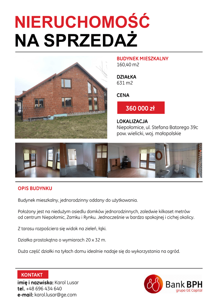 NIERUCHOMOŚĆ NA SPRZEDAŻ BUDYNEK MIESZKALNY 160,40 m2 DZIAŁKA 631 m2 CENA 360 000 zł LOKALIZACJA Niepołomice, ul. Stefana Batorego 39c pow. wielicki, woj. małopolskie OPIS BUDYNKU Budynek mieszkalny, jednorodzinny oddany do użytkowania. Położony jest na niedużym osiedlu domków jednorodzinnych, zaledwie kilkaset metrów od centrum Niepołomic, Zamku i Rynku. Jednocześnie w bardzo spokojnej i cichej okolicy. Z tarasu rozpościera się widok na zieleń, łąki. Działka prostokątna o wymiarach 20 x 32 m. Duża część działki na tyłach domu idealnie nadaje się do wykorzystania na ogród. KONTAKT imię i nazwisko: Karol Lusar tel. +48 696 434 640 e-mail: [email protected]