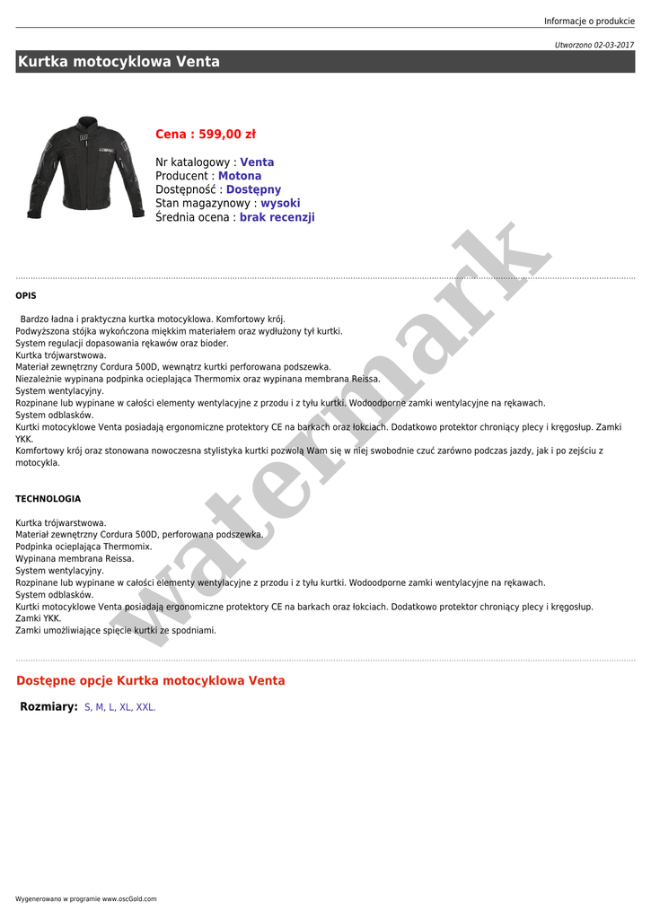 Informacje o produkcie Utworzono 02-03-2017 Kurtka motocyklowa Venta Cena : 599,00 zł er m ar k Nr katalogowy : Venta Producent : Motona Dostępność : Dostępny Stan magazynowy : wysoki Średnia ocena : brak recenzji OPIS Bardzo ładna i praktyczna kurtka motocyklowa. Komfortowy krój. Podwyższona stójka wykończona miękkim materiałem oraz wydłużony tył kurtki. System regulacji dopasowania rękawów oraz bioder. Kurtka trójwarstwowa. Materiał zewnętrzny Cordura 500D, wewnątrz kurtki perforowana podszewka. Niezależnie wypinana podpinka ocieplająca Thermomix oraz wypinana membrana Reissa. System wentylacyjny. Rozpinane lub wypinane w całości elementy wentylacyjne z przodu i z tyłu kurtki. Wodoodporne zamki wentylacyjne na rękawach. System odblasków. Kurtki motocyklowe Venta posiadają ergonomiczne protektory CE na barkach oraz łokciach. Dodatkowo protektor chroniący plecy i kręgosłup. Zamki YKK. Komfortowy krój oraz stonowana nowoczesna stylistyka kurtki pozwolą Wam się w niej swobodnie czuć zarówno podczas jazdy, jak i po zejściu z motocykla. TECHNOLOGIA w at Kurtka trójwarstwowa. Materiał zewnętrzny Cordura 500D, perforowana podszewka. Podpinka ocieplająca Thermomix. Wypinana membrana Reissa. System wentylacyjny. Rozpinane lub wypinane w całości elementy wentylacyjne z przodu i z tyłu kurtki. Wodoodporne zamki wentylacyjne na rękawach. System odblasków. Kurtki motocyklowe Venta posiadają ergonomiczne protektory CE na barkach oraz łokciach. Dodatkowo protektor chroniący plecy i kręgosłup. Zamki YKK. Zamki umożliwiające spięcie kurtki ze spodniami. Dostępne opcje Kurtka motocyklowa Venta Rozmiary: S, M, L, XL, XXL. Wygenerowano w programie www.oscGold.com