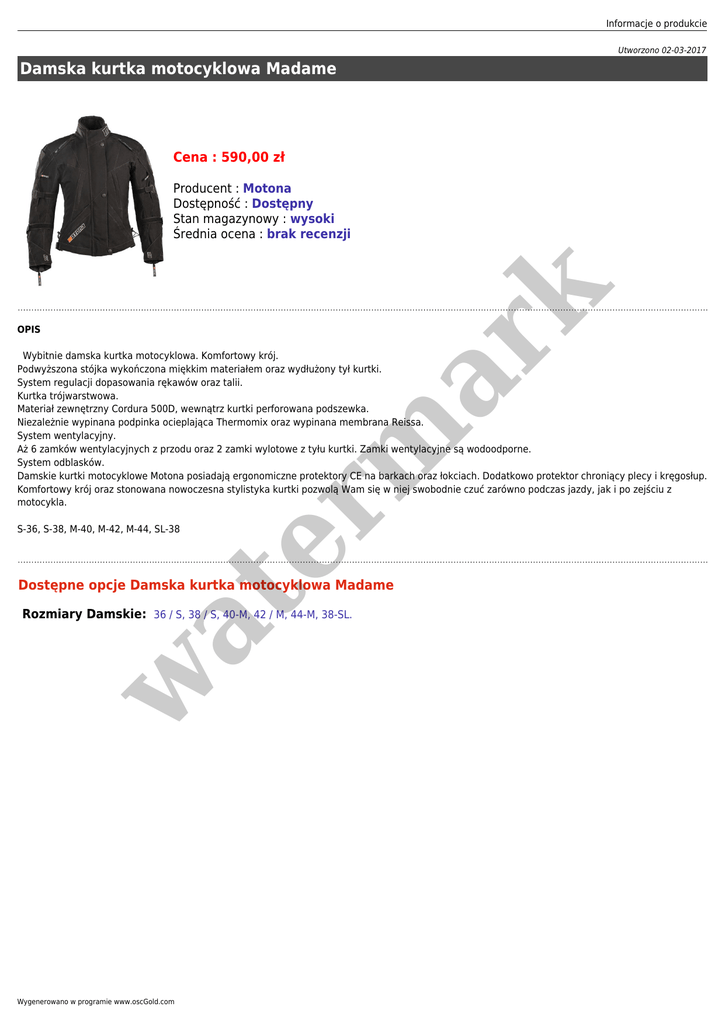 Informacje o produkcie Utworzono 02-03-2017 Damska kurtka motocyklowa Madame Cena : 590,00 zł OPIS er m ar k Producent : Motona Dostępność : Dostępny Stan magazynowy : wysoki Średnia ocena : brak recenzji Wybitnie damska kurtka motocyklowa. Komfortowy krój. Podwyższona stójka wykończona miękkim materiałem oraz wydłużony tył kurtki. System regulacji dopasowania rękawów oraz talii. Kurtka trójwarstwowa. Materiał zewnętrzny Cordura 500D, wewnątrz kurtki perforowana podszewka. Niezależnie wypinana podpinka ocieplająca Thermomix oraz wypinana membrana Reissa. System wentylacyjny. Aż 6 zamków wentylacyjnych z przodu oraz 2 zamki wylotowe z tyłu kurtki. Zamki wentylacyjne są wodoodporne. System odblasków. Damskie kurtki motocyklowe Motona posiadają ergonomiczne protektory CE na barkach oraz łokciach. Dodatkowo protektor chroniący plecy i kręgosłup. Komfortowy krój oraz stonowana nowoczesna stylistyka kurtki pozwolą Wam się w niej swobodnie czuć zarówno podczas jazdy, jak i po zejściu z motocykla. S-36, S-38, M-40, M-42, M-44, SL-38 at Dostępne opcje Damska kurtka motocyklowa Madame w Rozmiary Damskie: 36 / S, 38 / S, 40-M, 42 / M, 44-M, 38-SL. Wygenerowano w programie www.oscGold.com
