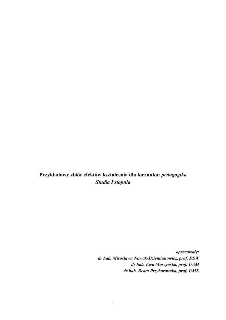 Przykładowy zbiór efektów kształcenia dla kierunku: pedagogika Studia I stopnia opracowały: dr hab. Mirosława Nowak-Dziemianowicz, prof. DSW dr hab. Ewa Muszyńska, prof. UAM dr hab. Beata Przyborowska, prof. UMK 1 Przykładowy zbiór efektów kształcenia dla kierunku: pedagogika Studia I stopnia 1. Umiejscowienie kierunku w obszarze (obszarach) z uzasadnieniem Pedagogika to naukowa dyscyplina obejmująca przedmiotem swoich badań i praktyk edukację, wychowanie i kształcenie (nauczanie i uczenie się) człowieka we wszystkich fazach jego życia. Pedagogika należy do grupy nauk humanistycznych i społecznych. Jej przedmiot badań jest umiejscowiony zarówno w obszarze idei (ideały, normy, powinności), jak i praktyk społecznych. Pedagogika jako nauka o wychowaniu i kształceniu łączy dwie perspektywy humanistyczną, koncentrującą się na istocie wychowania, nauczania i uczenia się oraz społeczną dotyczącą środowisk wychowawczych, systemów instytucji oświatowych i opiekuńczych, ich funkcji i znaczenia w rozwoju człowieka. Pedagogika zajmuje się rozumieniem tego, jak ludzie rozwijają się, uczą w ciągu całego życia oraz krytyczną analizą istoty wiedzy i rozumienia w wymiarze ich jednostkowych i społecznych konsekwencji. Pedagogika obejmuje analizy procesów edukacyjnych, systemów i podejść, i ich kulturowych, społecznych, politycznych, historycznych i ekonomicznych kontekstów. Pedagogika dążąc do autonomii wyrosła z filozofii, posługuje się w swoich badaniach podstawowych metodami humanistycznymi, natomiast w badaniach eksplikacyjnych i stosowanych odwołuje się w głównej mierze do metodologii nauk społecznych. Pedagogika jako dyscyplina zajmująca się faktem społeczno-kulturowym jakim jest wychowanie, uczenie się, samorozwój, opisem procesów związanych z wprowadzaniem człowieka w kulturę, w życie społeczne, umiejscowiona jest zarówno w humanistyce, jak i w obszarze badań społecznych. Ze względu na swój aplikacyjny charakter, związany z metodycznie prowadzoną interwencją wspomagającą rozwój jednostek i grup społecznych, czerpie z nauk przyrodniczych, medycznych, nauk o kulturze fizycznej, psychologicznych i socjologicznych, natomiast prowadząc badania nad oświatą i stymulując zachodzące w niej reformy musi korzystać z dorobku nauk ekonomicznych i nauk o zarządzaniu. Ma ścisły związek z etyką, zwłaszcza z aksjologią. Normatywny wymiar dyscypliny odróżnia ją od innych dyscyplin. Podstawowe systemy myślenia pedagogicznego (analitycznego, krytycznego, konstruktywistycznego) mają charakter ściśle humanistyczny, bliski filozofii, epistemologii, kulturoznawstwa, psychologicznych teorii rozwoju, makrosocjologii. W swoim rozwoju pedagogika przyswoiła sobie także metody nauk empirycznych i stosowanych nauk społecznych. Jest już na trwałe transdyscyplinarna dlatego przydzielenie jej do jednego obszaru jest sztuczne i nie zmieni osiągniętego stanu dyscypliny jako międzyobszarowej. Wiedza w obszarze pedagogiki obejmuje teorie opisujące i wyjaśniające przedmiot badań dyscypliny. Wyjaśnia złożoność relacji edukacji, wychowania i kształcenia człowieka, ich genezę i konsekwencje z perspektywy zarówno historycznej, jak i współczesnych przemian społeczno-kulturowych. Wiedza pedagogiczna pozwala zrozumieć przemiany, kryzysy środowisk i instytucji edukacyjnych, idei i wzorów wychowania oraz ich konsekwencje dla praktyki edukacyjnej. Korzystając z innych nauk humanistycznych i społecznych pedagogika wzbogaca rozumienie praktyki edukacyjnej, wskazuje możliwości pełniejszego wyjaśniania 2 własnego przedmiotu badań. Pedagogika czerpie swoje uzasadnienia z różnych orientacji naukowych, ideologicznych czy aksjonormatywnych. Opisuje naturę jednostki podlegającą procesom wychowania/socjalizacji i kształcenia przez całe życie; wyraża swoje zaangażowanie w realizacje wartości równego dostępu do kształcenia i równych szans edukacyjnych. Koncentruje się na potrzebach jednostek i grup defaworyzowanych w społeczeństwie, wykluczanych, potrzebujących pomocy i wsparcia. Student pedagogiki bada ogół oddziaływań służących formowaniu się zdolności życiowych człowieka. Jest zainteresowany rozwojem i zmianą w życiu jednostkowym i wspólnotowym (cele emancypacyjne). Analizuje rolę wychowania i kształcenia w procesie adaptacji, trwania i reprodukcji społecznej (cele adaptacyjne). Student pedagogiki rozpoznaje zjawiska edukacyjne i potrafi poddać je krytycznej analizie. Jest wrażliwy na wspólnotowy kontekst wychowania i kształcenia człowieka. Student pedagogiki poznaje współzależność formalnych (instytucjonalnych) i nieformalnych (media, grupy rówieśnicze) obszarów uczenia się w życiu człowieka i społeczeństwa. Studia w zakresie pedagogiki są ściśle związane ze społeczną praktyką edukacyjną. Jej dynamika i zróżnicowanie odzwierciedla się również w pedagogice. Studia w zakresie tej dyscypliny obejmują szereg subdyscyplin pedagogicznych wynikających z wieku rozwojowego podmiotów wychowywanych lub uczących się (np. pedagogika wieku wczesnoszkolnego, andragogika); celów edukacji jak np. ukształtowanie umiejętności czytania przez edukację szkolną (dydaktyka), czy zmianę zachowań, postaw (teoria wychowania). Studia w zakresie pedagogiki oscylują również wokół kategorii dewiacji, patologii i dysfunkcji rozwojowych człowieka (pedagogika specjalna). Innym kryterium występowania subdyscyplin pedagogicznych są obszary działalności człowieka powiązane z wychowaniem i kształceniem: opieka, pomoc, profilaktyka, terapia, animacja społecznokulturowa. Studia obejmują wszystkie środowiska wychowawcze i socjalizacyjne (m.in. rodzina, szkoła, media, grupy rówieśnicze), w tym poznanie instytucji (praktyki studenckie) powołane do realizacji wymienionych czynności edukacyjnych. Badanie i porównywanie systemów edukacyjnych (pedagogika