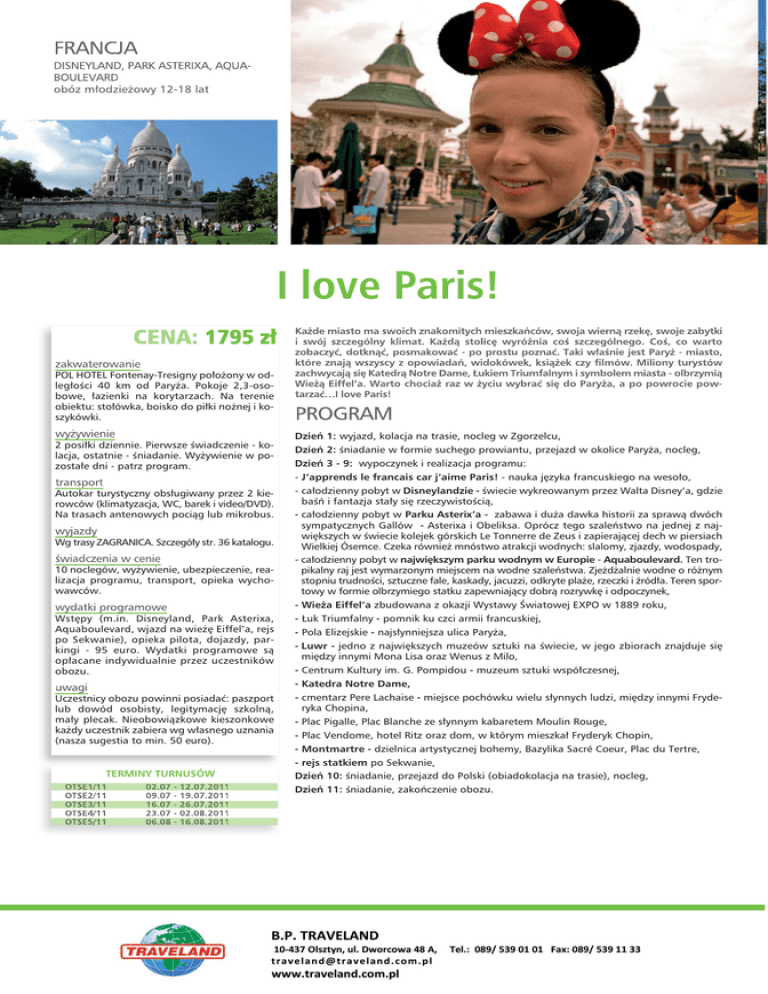 I love Paris! 1795 zł POL HOTEL Fontenay-Tresigny położony w odległości 40 km od Paryża. Pokoje 2,3-osobowe, łazienki na korytarzach. Na terenie obiektu: stołówka, boisko do piłki nożnej i koszykówki. 2 posiłki dziennie. Pierwsze świadczenie - kolacja, ostatnie - śniadanie. Wyżywienie w pozostałe dni - patrz program. Dzień 1: wyjazd, kolacja na trasie, nocleg w Zgorzelcu, Dzień 2: śniadanie w formie suchego prowiantu, przejazd w okolice Paryża, nocleg, Dzień 3 - 9: wypoczynek i realizacja programu: - J’apprends le francais car j’aime Paris! - nauka języka francuskiego na wesoło, Autokar turystyczny obsługiwany przez 2 kierowców (klimatyzacja, WC, barek i video/DVD). Na trasach antenowych pociąg lub mikrobus. - całodzienny pobyt w Disneylandzie - świecie wykreowanym przez Walta Disney’a, gdzie baśń i fantazja stały się rzeczywistością, Wg trasy ZAGRANICA. Szczegóły str. 36 katalogu. - całodzienny pobyt w Parku Asterix’a - zabawa i duża dawka historii za sprawą dwóch sympatycznych Gallów - Asterixa i Obeliksa. Oprócz tego szaleństwo na jednej z największych w świecie kolejek górskich Le Tonnerre de Zeus i zapierającej dech w piersiach Wielkiej Ósemce. Czeka również mnóstwo atrakcji wodnych: slalomy, zjazdy, wodospady, 10 noclegów, wyżywienie, ubezpieczenie, realizacja programu, transport, opieka wychowawców. - całodzienny pobyt w największym parku wodnym w Europie - Aquaboulevard. Ten tropikalny raj jest wymarzonym miejscem na wodne szaleństwa. Zjeżdżalnie wodne o różnym stopniu trudności, sztuczne fale, kaskady, jacuzzi, odkryte plaże, rzeczki i źródła. Teren sportowy w formie olbrzymiego statku zapewniający dobrą rozrywkę i odpoczynek, - Wieża Eiffel’a zbudowana z okazji Wystawy Światowej EXPO w 1889 roku, Wstępy (m.in. Disneyland, Park Asterixa, Aquaboulevard, wjazd na wieżę Eiffel’a, rejs po Sekwanie), opieka pilota, dojazdy, parkingi - 95 euro. Wydatki programowe są opłacane indywidualnie przez uczestników obozu. - Łuk Triumfalny - pomnik ku czci armii francuskiej, - Pola Elizejskie - najsłynniejsza ulica Paryża, - Luwr - jedno z największych muzeów sztuki na świecie, w jego zbiorach znajduje się między innymi Mona Lisa oraz Wenus z Milo, - Centrum Kultury im. G. Pompidou - muzeum sztuki współczesnej, - Katedra Notre Dame, Uczestnicy obozu powinni posiadać: paszport lub dowód osobisty, legitymację szkolną, mały plecak. Nieobowiązkowe kieszonkowe każdy uczestnik zabiera wg własnego uznania (nasza sugestia to min. 50 euro). - cmentarz Pere Lachaise - miejsce pochówku wielu słynnych ludzi, między innymi Fryderyka Chopina, - Plac Pigalle, Plac Blanche ze słynnym kabaretem Moulin Rouge, - Plac Vendome, hotel Ritz oraz dom, w którym mieszkał Fryderyk Chopin, - Montmartre - dzielnica artystycznej bohemy, Bazylika Sacré Coeur, Plac du Tertre, - rejs statkiem po Sekwanie, TERMINY TURNUSÓW Dzień 10: śniadanie, przejazd do Polski (obiadokolacja na trasie), nocleg, Dzień 11: śniadanie, zakończenie obozu. 8 www.wakacjezprzygoda.pl