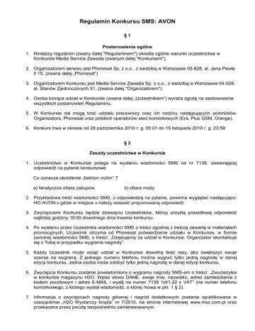 Regulamin Konkursu SMS: AVON §1 Postanowienia ogólne 1. Niniejszy regulamin (zwany dalej "Regulaminem") określa ogólne warunki uczestnictwa w Konkursie Media Service Zawada (zwanym dalej "Konkursem"). 2. Organizatorem serwisu jest Phonesat Sp. z o.o., z siedzibą w Warszawie 00-828, al. Jana Pawła II 15, (zwana dalej „Phonesat”) 3. Organizatorem Konkursu jest Media Service Zawada Sp. z o.o., z siedzibą w Warszawie 04-028, al. Stanów Zjednoczonych 51, (zwana dalej "Organizatorem"). 4. Osoba biorąca udział w Konkursie (zwana dalej „Uczestnikiem”) wyraża zgodę na zastosowanie wszystkich postanowień Regulaminu. 5. W Konkursie nie mogą brać udziału pracownicy oraz ich rodziny następujących podmiotów: Organizatora, Phonesat oraz polskich operatorów sieci komórkowych (Era, Plus GSM, Orange). 6. Konkurs trwa w okresie od 28 października 2010 r. g. 00:01 do 15 listopada 2010 r. g. 23:59 §2 Zasady uczestnictwa w Konkursie 1. Uczestnictwo w Konkursie polega na wysłaniu wiadomości SMS na nr 7138, zawierającej odpowiedź na pytanie konkursowe: Co oznacza określenie „fashion victim” ? a) fanatyczna ofiara zakupów b) ofiara mody 2. Przykładowa treść wiadomości SMS, z odpowiedzią na pytanie, powinna wyglądać następująco: HO.AVON.x gdzie w miejsce x należy wstawić proponowaną odpowiedź. 3. Zwycięzcami Konkursu będzie dziesięciu Uczestników, którzy przyślą prawidłową odpowiedź najbliżej godziny 18:00 dowolnego dnia trwania konkursu. 4. Po wysłaniu przez Uczestnika wiadomości SMS o treści zgodnej z treścią zawartą w materiałach promocyjnych, Uczestnik otrzyma od Phonesat potwierdzenie udziału w Konkursie, w formie zwrotnej wiadomości SMS, o treści: „Dziękujemy za udział w Konkursie. Organizator skontaktuje się z Tobą w przypadku wygrania nagrody”. 5. Każdy Uczestnik może wziąć udział w Konkursie dowolną ilość razy, aby zwiększyć swoje szanse na wygraną. Z jednego numeru telefonu można wygrać tylko jedną nagrodę w danej edycji konkursu. Jedna osoba może zdobyć tylko jedną nagrodę w danej edycji konkursu. 6. Zwycięzca Konkursu zostanie powiadomiony o wygraniu nagrody SMS-em o treści: „Zwyciezyles w konkursie magazynu H2O. Wpisz slowo DANE. swoje imie, nazwisko, adres zamieszkania z kodem pocztowym i adres E-MAIL i wyslij na numer 7138 1zł/1,22 z VAT” (na numer telefonu komórkowego, z którego wysłał wiadomość, o której mowa w pkt. 1 § 2). 7. Informacja o zwycięzcach nagrody głównej i nagród dodatkowych zostanie opublikowana w czasopiśmie „H2O Wystarczy kropla” nr 7/2010, na stronie internetowej www.msz.com.pl oraz przekazana przez pocztę bezpośrednio zainteresowanym. 8. Za świadomą rezygnację zwycięzcy z nagrody uzna się nie wysłanie wiadomości zwrotnej, o której mowa w pkt. 6 § 2 w ciągu 72h od momentu wygenerowania i wysłania wiadomości do zwycięscy z systemu teleinformatycznego Phonesat. 9. Wyklucza się możliwość zamiany nagrody rzeczowej na ekwiwalent pieniężny lub na inną nagrodę rzeczową. §3 Postanowienia końcowe 1) Nagrody: 10 nagród równorzędnych w postaci Zestawów kosmetyków AVON (Szampon pielęgnacyjny AVON Advance Techniques, Odżywka pielęgnacyjna AVON Advance Techniques, Pianka do włosów AVON Advance Techniques) ufundowanych przez firmę AVON o wartości jednostkowej 50 zł netto. 2. Uczestnictwo w Konkursie jest możliwe za pośrednictwem sieci polskich operatorów telefonii komórkowej (Era, Plus GSM, Orange), zarówno w systemie prepaid, jak i postpaid (abonamentowym). 3. Opłata za wysłanie wiadomości SMS na numer 7138 wynosi 1,22 zł z VAT. 4. Do uczestnictwa w Konkursie nie mają zastosowania ulgi dla grup abonentów na opłaty abonamentowe oraz usługi dodatkowe. 5. Wysłanie przez Uczestnika wiadomości SMS, o której mowa w § 2, jest równoznaczne ze złożeniem przez niego oświadczenia, iż wyraża on zgodę na postanowienia niniejszego Regulaminu. 6. Organizator dołoży wszelkich starań w celu zapewnienia prawidłowego działania Konkursu. 7. Operatorzy sieci telefonii komórkowych odpowiadają wyłącznie za usługi telekomunikacyjne umożliwiające uczestnictwo w Konkursie. 8. Organizator nie ponosi odpowiedzialności za: udział w Konkursie przez osoby nieuprawnione do użytkowania telefonu komórkowego, problemy w funkcjonowaniu Konkursu, jeżeli nastąpiły one wskutek zdarzeń, których Organizator przy zachowaniu należytej staranności nie był w stanie przewidzieć, lub którym nie mógł zapobiec, w szczególności w przypadku problemów związanych ze zdarzeniami losowymi o charakterze siły wyższej, udział w Konkursie niezgodnie z postanowieniami niniejszego Regulaminu i szkody tym spowodowane, przerwy w funkcjonowaniu Konkursu zaistniałe z przyczyn technicznych (np. konserwacja, przegląd, wymiana sprzętu) lub niezależnych od Organizatora, 9. Organizator zastrzega sobie prawo zmiany postanowień Regulaminu w razie zmiany przepisów prawnych lub z innej ważnej przyczyny. 10. Reklamacje dotyczące Konkursu należy przesyłać w formie elektronicznej na adres e-mail: [email protected] z dopiskiem „GRA”. 11. Reklamacje Uczestników dotyczące Konkursu będą rozpatrywane przez Komisje Sprawdzającą niezwłocznie, jednakże nie później niż w terminie 7 dni od daty otrzymania reklamacji. 12. Decyzja Komisji Sprawdzającej odnoszącej się do zgłoszonej reklamacji jest ostateczna. 13. Regulamin oraz dodatkowe informacje na temat Konkursu są dostępne w siedzibie Organizatora.