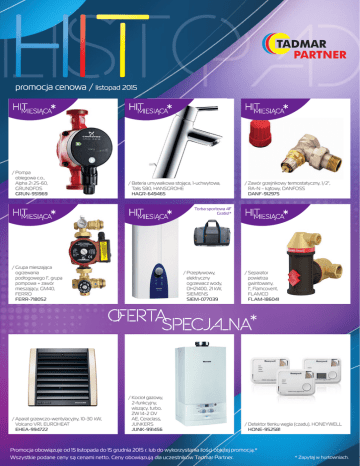 promocja cenowa / listopad 2015 hit miesiąca* hit miesiąca* hit miesiąca* /Pompa obiegowa c.o., Alpha 2 l 25-60, GRUNDFOS GRUN-951969 /Bateria umywalkowa stojąca, 1-uchwytowa, Talis S80, HANSGROHE HAGR-649465 /Zawór grzejnikowy termostatyczny, 1/2", RA-N – kątowy, DANFOSS DANF-912975 hit miesiąca* hit miesiąca* /Grupa mieszająca ogrzewania podłogowego 1", grupa pompowa + zawór mieszający, GM40, FERRO FERR-718052 Torba sportowa 4F Gratis!* /Przepływowy, elektryczny ogrzewacz wody, DH21400, 21 kW, SIEMENS SIEM-077039 hit miesiąca* /Separator powietrza gwintowany, 1", Flamcovent, FLAMCO FLAM-186041 OFERTA SPECJALNA* /Aparat grzewczo-wentylacyjny, 10-30 kW, Volcano VR1, EUROHEAT EHEA-994722 /Kocioł gazowy, 2-funkcyjny, wiszący, turbo, ZW 14-2 DV AE, Ceraclass, JUNKERS JUNK-991456 /Detektor tlenku węgla (czadu), HONEYWELL HONE-952581 Promocja obowiązuje od 15 listopada do 15 grudnia 2015 r. lub do wykorzystania ilości objętej promocją.* Wszystkie podane ceny są cenami netto. Ceny obowiązują dla uczestników Tadmar Partner. * Zapytaj w hurtowniach. 01 / INSTALACJE WEWNĘTRZNE Obrotowy zawór mieszający ARV, 4-drogowy 485 DN32, 1 1/4" GW, Kvs 15 AFRI-951516 Otulina do rur 18/20, Tubolit szary ARCL-940554 Otlulina do rur 25/20, Tubolit szary ARCL-940555 Zawór kulowy wodny KP1 DN 15 (1/2") FERR-025529 Zawór kulowy wodny, prosty, KP3, DN 25 (1") FERR-025531 Sprzęgło hydrauliczne, Flexbalance EcoPlus C FLAM-172404 Uszczelniacz do gwint. – nitka, LOCTITE 55,150 mb, (woda, gaz, olej) HENK-058795 Filtr narurowy mechaniczny 3/4" 100 mikronów z płukaniem wstecznym HONE-026676 Regulator ciągu FR124- 3/4A do kotła stałopalnego HONE-027284 Regulator ciśnienia DN20 3/4" 1,5-6 bar, 40°C HONE-983012 Złączka zaciskowa do miedzi PRESS GAS – mufa 22 IBP.-913844 B.PRESS GAS – Nypel, 22 x 3/4" IBP.-913854 Alupex – kolano Z/Z 25/90°, PPSU WAVI-035792 Alupex – Rura 25 x 2,5 50 m WAVI-101249 02 / TECHNIKA GRZEWCZA Głowica termostatyczna RAW 5115 DANF-912966 Kocioł wiszący kondensacyjny 1-funkcyjny MCR3 Plus 24 DIET-200280 Wymiennik ciepła pojemnościowy, 200 l, z wężownicą spiralną, stojący, skay GALM-048628 Wymiennik ciepła zasobnikowy, 2-płaszczowy, ocieplony poliuretanem, poziomy, 140 l GALM-100562 Pompa ciepła 2GT, zasobnik 200 l, EASYAIR Basic GALM-189724 Promocja obowiązuje od 15 listopada do 15 grudnia 2015 r. lub do wykorzystania ilości objętej promocją.* Wszystkie podane ceny są cenami netto. Ceny obowiązują dla uczestników Tadmar Partner. * Zapytaj w hurtowniach. Grzejnik łazienkowy, stalowy, biały, 520 W, 540 x 1072, Rettto INSP-717240 Grzejnik łazienkowy, stalowy, grafit, 50/110, Retto INSP-721739 Kocioł gazowy 2-funkcyjny, wiszący, 14-2 DVKE, Ceraclass JUNK-991454 Regulator temperatury, pokojowy, tygodniowy, 091FLRF, bezprzewodowy SALU-914069 Przepływowy, elektryczny ogrzewacz wody, trójfazowy, electronic Comfort DE181415 18/21 kW SIEM-693603 Czapka 4F Gratis!* Wymiennik ciepła płytowy LB31-30 SPOL-029187 03 / Technika Pompowa Pompa cyrkulacyjna c.w.u.UP 15-14 B PM80 GRUN-951952 Pompa obiegowa c.o., Alpha 2 l 25-40 180 – DuoPack – podwójne opakowanie GRUN-952450 Pompa obiegowa c.o. PCOw 25/6 LFP.-175796 04 / TECHNIKA SANITARNA Zawór termostatyczny mieszający do c.w.u 3/4" 30-60°C, KVS 1,6 AFRI-951552 Bateria jednouchwytowa umywalkowa stojąca, Algeo FERR-952444 Uszczelka wygłuszająca do WC GEBE-003361 Wspornik dystansowy do Duofixa GEBE-110515 Zestaw montażowy miski ustępowej H112, Duofix GEBE-668377 Bateria zlewozmywakowa stojąca, 1-uchwytowa, Allegra Variarc HAGR-106477 Zestaw: bateria natryskowa ścienna termostatyczna + zestaw natryskowy Croma 100/Unica'C 0,65 m HAGR-132403 Miska ustępowa wisząca, biała, Debba ROCA-184546 Promocja obowiązuje od 15 listopada do 15 grudnia 2015 r. lub do wykorzystania ilości objętej promocją.* Wszystkie podane ceny są cenami netto. Ceny obowiązują dla uczestników Tadmar Partner. * Zapytaj w hurtowniach. Naczynie wyrównawcze 20 l, do instalacji c.o., otw. króćce 1" ALTH-119658 Naczynie wyrównawcze do instalacji c.o. otwartej 25 l ALTH-119659 Naczynie wyrównawcze 30 l, do instalacji c.o., otw. króćce 1" ALTH-119660 Pompa obiegowa do co Altech 25-40-70 Klasa A, korpus 180 mm, w izolacji ALTH-914760 K.ZEW. Zasuwa burzowa DN110 ALTH-132326 K.ZEW. Zasuwa burzowa DN160 ALTH-132327 Taśma aluminiowa gładka 50 mm x 50 m do systemów wentylacyjnych, klimatyzacyjnych NOVI-982969 Taśma aluminiowa uzbrojona 50 mm x 50 m do systemów wentylacyjnych, klimatyzacyjnych NOVI-982970 55,20 zł 57,80 zł 64,30 zł 260,00 zł 110,00 zł 160,00 zł 15,00 zł 22,00 zł Uchwyt naczynia wyrównawczego do instalacji c.o. otwartej (komplet 2 sztuki) ALTH-084013 Zestaw grzejnikowy termostatyczny, kątowy, inwestycyjny: głowica + zawór termostatyczny 1/2" + zawór powrotny 1/2" ALTH-914642 Zestaw grzejnikowy termostatyczny, prosty, inwestycyjny: głowica + zawór termostatyczny 1/2" + zawór powrotny 1/2" ALTH-914643 Grzejnik łazienkowy, 500 x 1200 prosty chrom, moc 315 W, Bellis ALTN-183560 Grzejnik łazienkowy, 500 x 1600 prosty chrom, moc 427 W, Bellis ALTN-183561 Otulina termoizolacyjna, Basic B, szara 15/9 NNNN-197834 Otulina termoizolacyjna, Basic B, szara 18/9 NNNN-198079 Otulina termoizolacyjna, Basic BC, czerwona, 15/6, 2 m NNNN-197837 Otulina termoizolacyjna, Basic BC, czerwona, 18/6, 2 m NNNN-198082 11,50 zł 44,00 zł 44,00 zł 259,00 zł 322,00 zł 0,73 zł 0,83 zł 0,69 zł 0,84 zł Rura pe-rt/al/pe-rt, 16 x 2.0, w otulinie czerwonej – odcinki 50 m, Altech ALTH-171523 Rura pe-rt/al/pe-rt 16 x 2.0, w otulinie niebieskiej – odcinki 50 m, Altech ALTH-172599 Zestaw grzejnikowy termostatyczny, kątowy, V, inwestycyjny: głowica + z.podłącz. 1/2" + nypel 3/4"x1/2" ALTH-914644 Zestaw grzejnikowy termostatyczny, prosty V, inwestycyjny: głowica + z.podłącz. 1/2" + nypel 3/4"x1/2" ALTH-914645 Grzejnik łazienkowy, 500 x 1200 łukowy chrom, moc 315 W, Gladius ALTN-183563 G