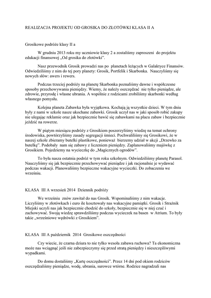 REALIZACJA PROJEKTU OD GROSIKA DO ZŁOTÓWKI KLASA II A Grosikowe podróże klasy II a W grudniu 2013 roku my uczniowie klasy 2 a zostaliśmy zaproszeni do projektu edukacji finansowej „Od grosika do złotówki”. Nasz przewodnik Grosik prowadzi nas po planetach leżących w Galaktyce Finansów. Odwiedziliśmy z nim do tej pory planety: Grosik, Portfelik i Skarbonka. Nauczyliśmy się nowych słów: awers i rewers. Podczas trzeciej podróży na planetę Skarbonka poznaliśmy dawne i współczesne sposoby przechowywania pieniędzy. Wiemy, że należy oszczędzać nie tylko pieniądze, ale zdrowie, przyrodę i własne ubrania. A wspólnie z rodzicami zrobiliśmy skarbonki według własnego pomysłu. Kolejna planeta Zabawka była wyjątkowa. Kochają ją wszystkie dzieci. W tym dniu były z nami w szkole nasze ukochane zabawki. Grosik uczył nas w jaki sposób robić zakupy nie ulegając reklamie oraz jak bezpiecznie bawić się zabawkami na placu zabaw i bezpiecznie jeździć na rowerze. W piątym miesiącu podróży z Grosikiem poszerzyliśmy wiedzę na temat ochrony środowiska, powtórzyliśmy zasady segregacji śmieci. Pochwaliliśmy się Grosikowi, że w naszej szkole zbieramy butelki plastikowe, ponieważ bierzemy udział w akcji „Drzewko za butelkę”. Podobały nam się zabawy z liczeniem pieniędzy. Zaplanowaliśmy majówkę z Grosikiem. Pojedziemy na wycieczkę do „Magicznych ogrodów”. To była nasza ostatnia podróż w tym roku szkolnym. Odwiedziliśmy planetę Parasol. Nauczyliśmy się jak bezpiecznie przechowywać pieniądze i jak racjonalnie je wydawać podczas wakacji. Planowaliśmy bezpieczne wakacyjne wycieczki. Do zobaczenia we wrześniu. KLASA III A wrzesień 2014 Dziennik podróży We wrześniu znów zawitał do nas Grosik. Wspominaliśmy z nim wakacje. Liczyliśmy w złotówkach i euro ile kosztowały nas wakacyjne pamiątki. Grosik i Strażnik Miejski uczyli nas jak bezpiecznie chodzić do szkoły, bezpiecznie się w niej czuć i zachowywać. Swoją wiedzę sprawdziliśmy podczas wycieczek na basen w Atrium. To były takie „wrześniowe wędrówki z Grosikiem”. KLASA III A październik 2014 Grosikowe oszczędności Czy wiecie, że czarna dziura to nie tylko wesoła zabawa ruchowa? Ta ekonomiczna może nas wciągnąć jeśli nie zabezpieczymy się przed stratą pieniędzy i nieszczęśliwymi wypadkami. Do domu dostaliśmy „Kartę oszczędności”. Przez 14 dni pod okiem rodziców oszczędzaliśmy pieniądze, wodę, ubrania, surowce wtórne. Rodzice nagradzali nas gwiazdkami i ocenili dużą gwiazdką kategorię, w której byliśmy najlepsi. Rodzicom i kolegom pokazaliśmy scenkę o oszczędzaniu pt.”Dbajmy o lasy”. KLASA III A listopad 2014 Grosikowe wędrówki Podczas Grosikowych wędrówek znów świetnie się bawiliśmy z zachowaniem zasad bezpieczeństwa ruchu drogowego. Zapamiętamy, że warunkiem dobrej zabawy jest zgodna współpraca. KLASA III A grudzień 2014 Od Grosika do złotówki Podróżą na planetę Złotówka zakończyliśmy szczęśliwie podróż z Grosikiem. Na planecie Złotówka było wiele ciekawych zadań i przygód. Potrzebna nam była wiedza zdobyta podczas poprzednich podróży. Poznaliśmy pojęcia : bogactwo, skarby, marzenia, osiągnięcia, lokata terminowa. W pożegnalnym liście do Grosika opisaliśmy nasze wrażenia z przebiegu bezpiecznej podróży po galaktyce Finanse i Oszczędzanie.