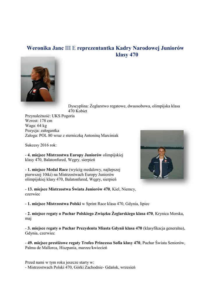 Weronika Janc III E reprezentantka Kadry Narodowej Juniorów klasy 470 Dyscyplina: Żeglarstwo regatowe, dwuosobowa, olimpijska klasa 470 Kobiet Przynależność: UKS Pogoria Wzrost: 178 cm Waga: 64 kg Pozycja: załogantka Załoga: POL 80 wraz z sterniczką Antoniną Marciniak Sukcesy 2016 rok: - 4. miejsce Mistrzostwa Europy Juniorów olimpijskiej klasy 470, Balatonfured, Węgry, sierpień - 1. miejsce Medal Race (wyścig medalowy, najlepszej pierwszej 10tki) na Mistrzostwach Europy Juniorów olimpijskiej klasy 470, Balatonfured, Węgry, sierpień - 13. miejsce Mistrzostwa Świata Juniorów 470, Kiel, Niemcy, czerwiec - 1. miejsce Mistrzostwa Polski w Sprint Race klasa 470, Gdynia, lipiec - 2. miejsce regaty o Puchar Polskiego Związku Żeglarskiego klasa 470, Krynica Morska, maj - 3. miejsce regaty o Puchar Prezydenta Miasta Gdynii klasa 470 (klasyfikacja generalna), Gdynia, czerwiec - 49. miejsce prestiżowe regaty Trofeo Princessa Sofia klasy 470, Puchar Świata Seniorów, Palma de Mallorca, Hiszpania, marzec/kwiecień Przed nami w tym roku jeszcze starty w: - Mistrzostwach Polski 470, Górki Zachodnie- Gdańsk, wrzesień - Regatach klasy 470, Kowno, Litwa, wrzesień/październik - Imperia Regatta 470, Riva del Garda, Włochy, listopad - Christmas Race 470, Palamós, Hiszpania, grudzień Oraz zgrupowania: - Górki Zachodnie-wrzesień - Górki Zachodnie-październik - Riva del Garda, Włodchy- listopad - Palamós, Hiszpania-grudzień Trzymajcie kciuki za POL 80 :) Moja przygoda z żeglarstwem typowo regatowym zaczęła się w 2010 roku, na trzyosobowej klasie Omega Sport wraz z tatą i dziadkiem, który w młodości był także reprezentantem Polski w olimpijskiej jednoosobowej klasie Finn, to właśnie dziadek rozbudził we mnie tę pasję. Startowałam przez 4 lata m.in. w Pucharach Polski, Mistrzostwach Polski w tej klasie zdobywając doświadczenie. Szybko moja pasja rozbudziła we mnie bardzo określone cele i marzenia- przejście na olimpijską klasę 470, kadra narodowa i igrzyska olimpijskie w Tokio 2020. Żeglarstwo na ś\Śląsku jest mało popularne, a co za tym idzie słabo wspierane, przez co moje marzenia dla wielu wydawały się abstrakcją. Jedne wrześniowe zawody (Mistrzostwa Polski klasy 470 w 2015r) zmieniły wszystko. W grudniu dostałam propozycję pływania wraz z Antoniną Marciniak (Kadra Narodowa Juniorów klasy 470) od lutego 2016 roku. Decyzja była trudna- szkoła, druga klasa liceum, profil biologiczno-chemiczny, a plan zgrupowań i startów kadry na 2016 rok zostawiał mi tylko niecałe 150 dni w domu. Jak się później okazało sama decyzja to nic przy wysiłku, jaki musiałam włożyć w to, by „dogonić” fizycznie jak i technicznie resztę grupy, która staż na tej łódce miała znacznie dłuższy niż ja. 470-tka to łódka, która wymaga ogromnej sprawności fizycznej, siły, zwinności, kondycji, a samo żeglarstwo to sport wymagający ogromnego poświęcenia, cierpliwości, odwagi i wytrwałości w dążeniu do celu. Załoga musi się polubić, musi chcieć tego samego i przede wszystkim musi być bardzo zgrana. Siła charakteru może zdziałać tu bardzo dużo, co udowodniłyśmy z moją sterniczką Tosią już w te wakacje zdobywając 4 miejsce na Mistrzostwach Europy i wygrywając wyścig medalowy, co jest zdecydowanie naszym życiowym wynikiem i bez wątpienia historycznym dla polskiej, damskiej, juniorskiej 470-tki, dającym nam świadomość, że nasze marzenia (cele) na następny sezon 2017 (założeniem jest 1 miejsce na MŚ w Japonii i na ME we Włoszech) jak i na 2020 rok (Tokio), mają szanse się spełnić, pod warunkiem, że dalej będziemy tak ciężko pracować jak do tej pory. :)
