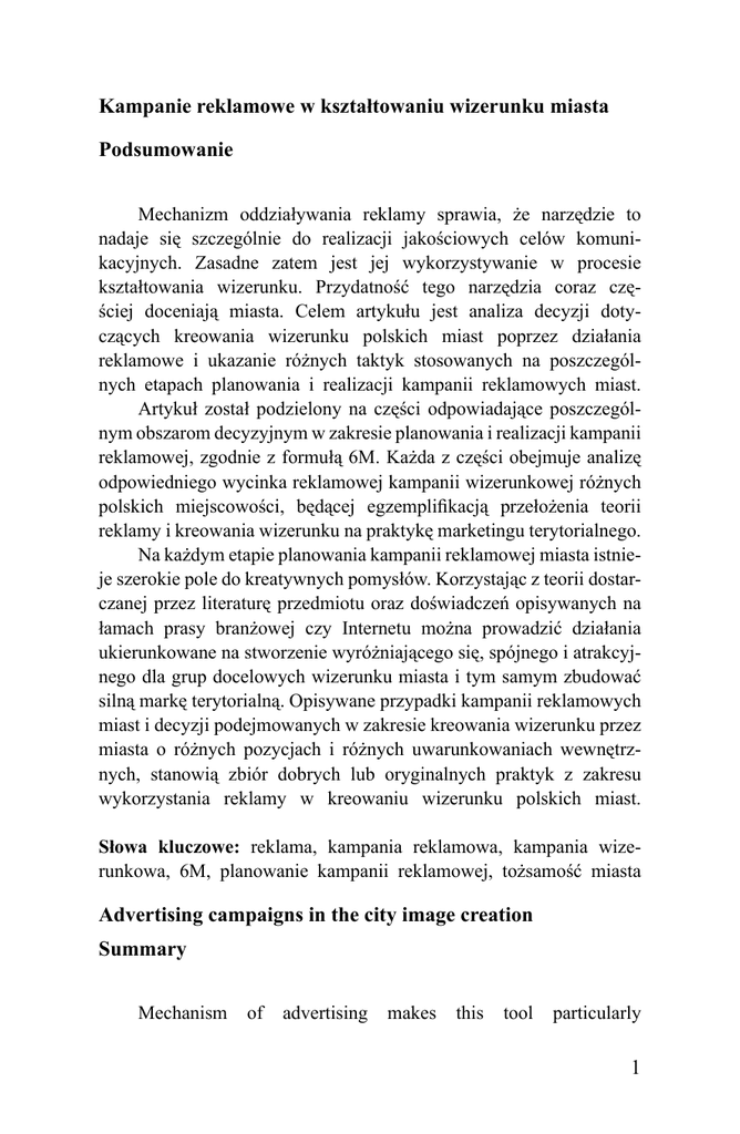 Kampanie reklamowe w kształtowaniu wizerunku miasta Podsumowanie Mechanizm oddziaływania reklamy sprawia, że narzędzie to nadaje się szczególnie do realizacji jakościowych celów komunikacyjnych. Zasadne zatem jest jej wykorzystywanie w procesie kształtowania wizerunku. Przydatność tego narzędzia coraz częściej doceniają miasta. Celem artykułu jest analiza decyzji dotyczących kreowania wizerunku polskich miast poprzez działania reklamowe i ukazanie różnych taktyk stosowanych na poszczególnych etapach planowania i realizacji kampanii reklamowych miast. Artykuł został podzielony na części odpowiadające poszczególnym obszarom decyzyjnym w zakresie planowania i realizacji kampanii reklamowej, zgodnie z formułą 6M. Każda z części obejmuje analizę odpowiedniego wycinka reklamowej kampanii wizerunkowej różnych polskich miejscowości, będącej egzemplifikacją przełożenia teorii reklamy i kreowania wizerunku na praktykę marketingu terytorialnego. Na każdym etapie planowania kampanii reklamowej miasta istnieje szerokie pole do kreatywnych pomysłów. Korzystając z teorii dostarczanej przez literaturę przedmiotu oraz doświadczeń opisywanych na łamach prasy branżowej czy Internetu można prowadzić działania ukierunkowane na stworzenie wyróżniającego się, spójnego i atrakcyjnego dla grup docelowych wizerunku miasta i tym samym zbudować silną markę terytorialną. Opisywane przypadki kampanii reklamowych miast i decyzji podejmowanych w zakresie kreowania wizerunku przez miasta o różnych pozycjach i różnych uwarunkowaniach wewnętrznych, stanowią zbiór dobrych lub oryginalnych praktyk z zakresu wykorzystania reklamy w kreowaniu wizerunku polskich miast. Słowa kluczowe: reklama, kampania reklamowa, kampania wizerunkowa, 6M, planowanie kampanii reklamowej, tożsamość miasta Advertising campaigns in the city image creation Summary Mechanism of advertising makes this tool particularly 1 suitable for the implementation of quality communication goals. Therefore, it is widely used in image creation. The usefulness of this tool is increasingly appreciated by cities. This article aims to analyze the decision on creating the image of Polish cities through advertising and showing the different tactics used by cities at various stages of planning and execution of advertising campaigns. The article is divided into sections corresponding to different areas of decision making in planning and implementing an advertising campaign, according to the 6M formula. Each section includes an analysis of the corresponding segment of the advertising image campaign of various Polish cities, which is an exemplification of translating the theory of advertising and image creation to the practice of territorial marketing. At each stage of planning an advertising campaign of the city there is a wide scope for creative ideas. Using the theory provided by the literature and experiences described in the specialized press or the Internet one can carry out activities aimed at creating a distinctive, coherent and attractive target group for the city image and thus build a strong territorial brand. Reported cases of urban advertising campaigns and decisions taken in creating the image of the city with different positions and different internal conditions, constitute a collection of good and original practices in the use of advertising in shaping the image of Polish cities. Keywords: advertising, advertising campaign, image campaign, 6M, planning an advertising campaign, the city identity 2