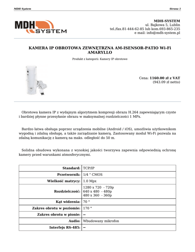 MDH System Strona 1 MDH-SYSTEM ul. Bajkowa 5, Lublin tel./fax.81-444-62-85 lub kom.693-865-235 e mail: [email protected] KAMERA IP OBROTOWA ZEWNĘTRZNA AM-ISENSOR-PATIO Wi-Fi AMARYLLO Produkt z kategorii: Kamery IP obrotowe Cena: 1160.00 zł z VAT (943.09 zł netto) Obrotowa kamera IP z wydajnym algorytmem kompresji obrazu H.264 zapewniającym czyste i bardziej płynne przesyłanie obrazu w maksymalnej rozdzielczości 1 MPx. Bardzo łatwa obsługa poprzez urządzenia mobilne (Android / iOS), umożliwia użytkownikom wygodną i zdalną obsługę, a także zarządzanie kamerą. Zastosowany moduł Wi-Fi pozwala na zdalną komunikację z kamerą na maks. odległość do 50 m. Solidna obudowa wykonana z wysokiej jakości tworzywa zapewnia odpowiednią ochronę kamery przed warunkami atmosferycznymi. Standard: TCP/IP Przetwornik: 1/4 " CMOS Wielkość matrycy: 1.0 Mpx 1280 x 720 - 720p Rozdzielczość: 640 x 480 - 480p 480 x 360 - 360p Kąt widzenia: 70 ° Zakres obrotu w poziomie: 170 ° Zakres obrotu w pionie: Audio: Wbudowany mikrofon Interfejs RS-485: MDH System Strona 2 Metoda kompresji obrazu: • H.264 • MJPEG Prędkość transmisji strumienia 30 kl/s @ 720p głównego: Protokoły sieciowe: TCP/IP, UDP/IP, HTTP/HTTPS, FTP, DHCP, NTP, WPS Interfejs sieciowy: WiFi • Dostęp przez chmurę, • Android: Darmowa aplikacja Amaryllo, Android PL: Dostęp z telefonu komórkowego: Darmowa aplikacja Amaryllo PL, • iOS (iPhone): Darmowa aplikacja Amaryllo Gniazdo karty pamięci: Pamięć wewnętrzna: 4 GB • Moduł Wi-Fi - IEEE 802.11 b/g/n, Zasięg : 50 m (otwarta przestrzeń), • Oświetlacz LED, • Automatyczna zmiana rozdzielczości i jakości obrazu w zależności od przepustowości łącza, Wybrane funkcje: • Czujnik ruchu, • Powiadomienie na telefon, • Sygnalizacja alarmu - Dioda LED, Sygnał dźwiękowy, • Strefy prywatności, • Szyfrowanie transmisji - 256 b, • Obudowa bryzgoszczelna Zasilanie: 5 V DC / 1.6 A - USB (zasilacz w komplecie) Pobór mocy: < 6 W Waga: 0.08 kg Wymiary: Ø 35 x 120 mm Obsługiwane języki: angielski, polski Producent / Marka: AMARYLLO Widok z boku: MDH System Strona 3 Widok z tyłu: W zestawie: Zapraszamy do naszego sklepu internetowego www.mdh-system.pl Dokument wygenerowany 2017-03-02 o godzinie 16:18
