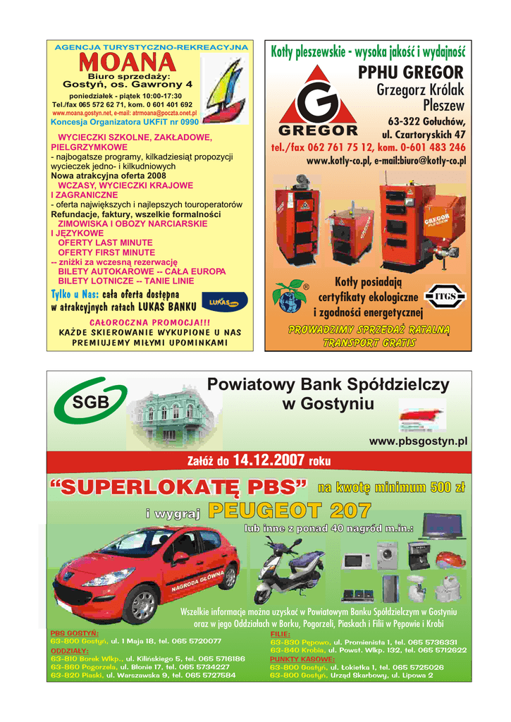 AGENCJA TURYSTYCZNO-REKREACYJNA Kot³y pleszewskie - wysoka jakoœæ i wydajnoœæ PPHU GREGOR Biuro sprzeda¿y: Gostyñ, os. Gawrony 4 63-322 Go³uchów, ul. Czartoryskich 47 tel./fax 062 761 75 12, kom. 0-601 483 246 www.kotly-co.pl, e-mail:[email protected] Koncesja Organizatora UKFiT nr 0990 GREGOR w WYCIECZKI SZKOLNE, ZAK£ADOWE, PIELGRZYMKOWE - najbogatsze programy, kilkadziesi¹t propozycji wycieczek jedno- i kilkudniowych Nowa atrakcyjna oferta 2008 w WCZASY, WYCIECZKI KRAJOWE I ZAGRANICZNE - oferta najwiêkszych i najlepszych touroperatorów Refundacje, faktury, wszelkie formalnoœci w ZIMOWISKA I OBOZY NARCIARSKIE I JÊZYKOWE w OFERTY LAST MINUTE w OFERTY FIRST MINUTE -- zni¿ki za wczesn¹ rezerwacjê w BILETY AUTOKAROWE -- CA£A EUROPA w BILETY LOTNICZE -- TANIE LINIE Tylko u Nas: ca³a oferta dostêpna w atrakcyjnych ratach LUKAS BANKU Grzegorz Królak Pleszew G poniedzia³ek - pi¹tek 10:00-17:30 Tel./fax 065 572 62 71, kom. 0 601 401 692 www.moana.gostyn.net, e-mail: [email protected] Kot³y posiadaj¹ certyfikaty ekologiczne i zgodnoœci energetycznej BANK CA£OROCZNA PROMOCJA!!! KA¯DE SKIEROWANIE WYKUPIONE U NAS PREMIUJEMY MI£YMI UPOMINKAMI Prowadzimy sprzeda¿ rataln¹ TRANSPORT GRATIS Powiatowy Bank Spó³dzielczy w Gostyniu www.pbsgostyn.pl Za³ó¿ do 14.12.2007 roku “SUPERLOKATÊ PBS” i wygraj na kwotê minimum 500 z³ PEUGEOT 207 lub inne z ponad 40 nagród m.in.: Wszelkie informacje mo¿na uzyskaæ w Powiatowym Banku Spó³dzielczym w Gostyniu oraz w jego Oddzia³ach w Borku, Pogorzeli, Piaskach i Filii w Pêpowie i Krobi PBS GOSTYÑ: 63-800 Gostyñ, ul. 1 Maja 18, tel. 065 5720077 ODDZIA£Y: 63-810 Borek Wlkp., ul. Kiliñskiego 5, tel. 065 5716186 63-860 Pogorzela, ul. B³onie 17, tel. 065 5734227 63-820 Piaski, ul. Warszawska 9, tel. 065 5727584 FILIE: 63-830 Pêpowo, ul. Promienista 1, tel. 065 5736331 63-840 Krobia, ul. Powst. Wlkp. 132, tel. 065 5712622 PUNKTY KASOWE: 63-800 Gostyñ, ul. £okietka 1, tel. 065 5725026 63-800 Gostyñ, Urz¹d Skarbowy, ul. Lipowa 2