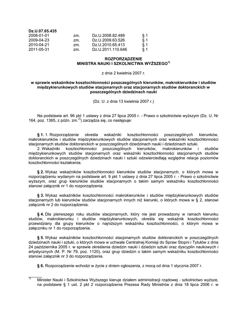 Dz.U.07.65.435 2008-01-01 2009-04-23 2010-04-21 2011-05-31 zm. zm. zm. zm. Dz.U.2008.82.489 Dz.U.2009.63.526 Dz.U.2010.65.413 Dz.U.2011.110.646 §1 §1 §1 §1 ROZPORZĄDZENIE MINISTRA NAUKI I SZKOLNICTWA WYŻSZEGO1) z dnia 2 kwietnia 2007 r. w sprawie wskaźników kosztochłonności poszczególnych kierunków, makrokierunków i studiów międzykierunkowych studiów stacjonarnych oraz stacjonarnych studiów doktoranckich w poszczególnych dziedzinach nauki (Dz. U. z dnia 13 kwietnia 2007 r.) Na podstawie art. 96 pkt 1 ustawy z dnia 27 lipca 2005 r. - Prawo o szkolnictwie wyższym (Dz. U. Nr 164, poz. 1365, z późn. zm.2)) zarządza się, co następuje: § 1. 1. Rozporządzenie określa wskaźniki kosztochłonności poszczególnych kierunków, makrokierunków i studiów międzykierunkowych studiów stacjonarnych oraz wskaźniki kosztochłonności stacjonarnych studiów doktoranckich w poszczególnych dziedzinach nauki i dziedzinach sztuki. 2. Wskaźniki kosztochłonności poszczególnych kierunków, makrokierunków i studiów międzykierunkowych studiów stacjonarnych oraz wskaźniki kosztochłonności stacjonarnych studiów doktoranckich w poszczególnych dziedzinach nauki i sztuki odzwierciedlają względne relacje poziomów kosztochłonności kształcenia. § 2. Wykaz wskaźników kosztochłonności kierunków studiów stacjonarnych, o których mowa w rozporządzeniu wydanym na podstawie art. 9 pkt 1 ustawy z dnia 27 lipca 2005 r. - Prawo o szkolnictwie wyższym, oraz grup kierunków studiów stacjonarnych o takim samym wskaźniku kosztochłonności stanowi załącznik nr 1 do rozporządzenia. § 3. Wykaz wskaźników kosztochłonności makrokierunków i studiów międzykierunkowych studiów stacjonarnych lub kierunków studiów stacjonarnych innych niż kierunki, o których mowa w § 2, stanowi załącznik nr 2 do rozporządzenia. § 4. Dla pierwszego roku studiów stacjonarnych, który nie jest prowadzony w ramach kierunku studiów, makrokierunku i studiów międzykierunkowych, określa się wskaźnik kosztochłonności przewidziany dla grupy kierunków o najniższym wskaźniku kosztochłonności, o którym mowa w załączniku nr 1 do rozporządzenia. § 5. Wykaz wskaźników kosztochłonności stacjonarnych studiów doktoranckich w poszczególnych dziedzinach nauki i sztuki, o których mowa w uchwale Centralnej Komisji do Spraw Stopni i Tytułów z dnia 24 października 2005 r. w sprawie określenia dziedzin nauki i dziedzin sztuki oraz dyscyplin naukowych i artystycznych (M. P. Nr 79, poz. 1120), oraz grup dziedzin o takim samym wskaźniku kosztochłonności stanowi załącznik nr 3 do rozporządzenia. § 6. Rozporządzenie wchodzi w życie z dniem ogłoszenia, z mocą od dnia 1 stycznia 2007 r. ______ 1) Minister Nauki i Szkolnictwa Wyższego kieruje działem administracji rządowej - szkolnictwo wyższe, na podstawie § 1 ust. 2 pkt 2 rozporządzenia Prezesa Rady Ministrów z dnia 18 lipca 2006 r. w sprawie szczegółowego zakresu działania Ministra Nauki i Szkolnictwa Wyższego (Dz. U. Nr 131, poz. 912). Zmiany wymienionej ustawy zostały ogłoszone w Dz. U. z 2006 r. Nr 46, poz. 328, Nr 104, poz. 708 i 711, Nr 144, poz. 1043 i Nr 227, poz. 1658. 2) ZAŁĄCZNIKI ZAŁĄCZNIK Nr 1 (1) WYKAZ WSKAŹNIKÓW KOSZTOCHŁONNOŚCI ORAZ GRUP KIERUNKÓW STACJONARNYCH O TAKIM SAMYM WSKAŹNIKU KOSZTOCHŁONNOŚCI 1) 2) 3) 4) 5) 6) 7) 8) 9) 10) 11) 12) 13) 14) 15) 16) 17) 1) 2) 3) 4) 5) 6) 7) 8) 9) 10) 11) 1) 2) 3) 3a) 4) 5) 6) 7) 8) 9) 10) 11) 12) 1. Grupa kierunków o wskaźniku kosztochłonności ks1 = 1,0: administracja; dziennikarstwo i komunikacja społeczna; ekonomia; europeistyka; filologia polska; filozofia; historia; muzykologia; nauki o rodzinie; pedagogika; politologia; polityka społeczna; praca socjalna; prawo; prawo kanoniczne; stosunki międzynarodowe; teologia. 2. Grupa kierunków o wskaźniku kosztochłonności ks2 = 1,5: filologia; finanse i rachunkowość; informacja naukowa i bibliotekoznawstwo; informatyka i ekonometria; kosmetologia; logistyka; matematyka; pedagogika specjalna; psychologia; socjologia; zarządzanie. 3. Grupa kierunków o wskaźniku kosztochłonności ks3 = 2,0: archeologia; architektura i urbanistyka; architektura wnętrz; bezpieczeństwo i higiena pracy; edukacja artystyczna w zakresie sztuki muzycznej; edukacja artystyczna w zakresie sztuk plastycznych; edukacja techniczno-informatyczna; etnologia; geografia; gospodarka przestrzenna; historia sztuki; kulturoznawstwo; organizacja produkcji filmowej i telewizyjnej; 13) 14) 15) 16) 17) 18) 1) 2) 3) 4) 5) 6) 7) 8) 9) 10) 11) 12) 13) 14) 15) 16) 17) 18) 19) 20) 21) 22) 23) 24) 25) 26) 27) 28) 29) 30) 31) 32) 33) 34) 35) 36) 37) 1) 2) 3) 4) 5) 6) 7) 8) 9) 9a) 10) sport; taniec; turystyka i rekreacja; wiedza o teatrze; wychowanie fizyczne; zarządzanie i inżynieria produkcji. 4. Grupa kierunków o wskaźniku kosztochłonności ks4 = 2,5: architektura krajobrazu; bezpieczeństwo narodowe; bezpieczeństwo wewnętrzne; biologia; budownictwo; chemia; dietetyka; dyrygentura; (uchylony); fizyka; geodezja i kartografia; geologia; górnictwo i geologia; grafika; informatyka; instrumentalistyka; inżynieria środowiska; jazz i muzyka estradowa; kompozycja i teoria muzyki; leśnictwo; malarstwo; oceanografia; ochrona dóbr kultury; ochrona środowiska; ogrodnictwo; rolnictwo; rybactwo; scenografia; technika rolnicza i leśna; technologia drewna; technologia żywności i żywienie człowieka; towaroznawstwo; transport; włókiennictwo; wokalistyka; wzornictwo; zdrowie publiczne. 5. Grupa kierunków o wskaźniku kosztochłonności ks5 = 3,0: aktorstwo; analityka medyczna; astronomia; automatyka i robotyka; biotechnologia; elektronika i telekomunikacja; elektrotechnika; energetyka; farmacja; fizjoterapia; fizyka techniczna; 11) 12) 13) 14) 15) 16) 17) 18) 19) 20) 21) 22) 23) 24) 25) 26) 27) 28) 29) 30) 31) 32) 33) 34) 35) inżynieria bezpieczeństwa; inżynieria biomedyczna; inżynieria chemiczna i procesowa; inżynieria