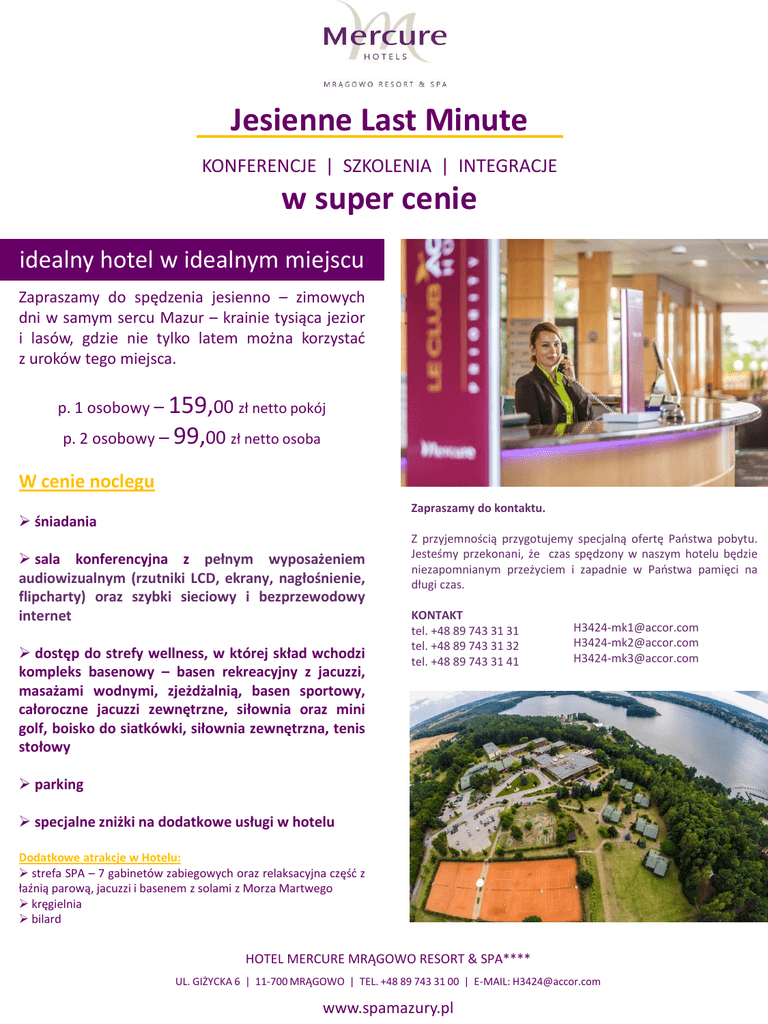 Jesienne Last Minute KONFERENCJE | SZKOLENIA | INTEGRACJE w super cenie idealny hotel w idealnym miejscu Zapraszamy do spędzenia jesienno – zimowych dni w samym sercu Mazur – krainie tysiąca jezior i lasów, gdzie nie tylko latem można korzystać z uroków tego miejsca. p. 1 osobowy – 159,00 zł netto pokój p. 2 osobowy – 99,00 zł netto osoba W cenie noclegu Zapraszamy do kontaktu. śniadania sala konferencyjna z pełnym wyposażeniem audiowizualnym (rzutniki LCD, ekrany, nagłośnienie, flipcharty) oraz szybki sieciowy i bezprzewodowy internet dostęp do strefy wellness, w której skład wchodzi kompleks basenowy – basen rekreacyjny z jacuzzi, masażami wodnymi, zjeżdżalnią, basen sportowy, całoroczne jacuzzi zewnętrzne, siłownia oraz mini golf, boisko do siatkówki, siłownia zewnętrzna, tenis stołowy Z przyjemnością przygotujemy specjalną ofertę Państwa pobytu. Jesteśmy przekonani, że czas spędzony w naszym hotelu będzie niezapomnianym przeżyciem i zapadnie w Państwa pamięci na długi czas. KONTAKT tel. +48 89 743 31 31 tel. +48 89 743 31 32 tel. +48 89 743 31 41 [email protected] [email protected] [email protected] parking specjalne zniżki na dodatkowe usługi w hotelu Dodatkowe atrakcje w Hotelu: strefa SPA – 7 gabinetów zabiegowych oraz relaksacyjna część z łaźnią parową, jacuzzi i basenem z solami z Morza Martwego kręgielnia bilard HOTEL MERCURE MRĄGOWO RESORT & SPA**** UL. GIŻYCKA 6 | 11-700 MRĄGOWO | TEL. +48 89 743 31 00 | E-MAIL: [email protected] www.spamazury.pl