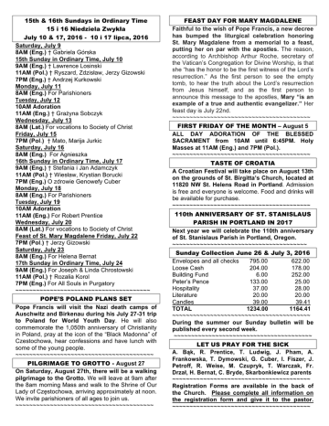 15th & 16th Sundays in Ordinary Time 15 i 16 Niedziela Zwykła July 10 & 17, 2016 - 10 i 17 lipca, 2016 Saturday, July 9 8AM (Eng.) † Gabriela Górska 15th Sunday in Ordinary Time, July 10 9AM (Eng.) † Lawrence Losinski 11AM (Pol.) † Ryszard, Zdzisław, Jerzy Gizowski 7PM (Eng.) † Andrzej Kurkowski Monday, July 11 8AM (Eng.) For Parishioners Tuesday, July 12 10AM Adoration 11AM (Eng.) † Grażyna Sobczyk Wednesday, July 13 8AM (Lat.) For vocations to Society of Christ Friday, July 15 7PM (Pol.) † Mato, Marija Jurkic Saturday, July 16 8AM (Eng.) For Agnieszka 16th Sunday in Ordinary Time, July 17 9AM (Eng.) † Stefania i Jan Adamczyk 11AM (Pol.) † Wiesław, Krystian Borucki 7PM (Eng.) O zdrowie Genowefy Cuber Monday, July 18 8AM (Eng.) For Parishioners Tuesday, July 19 10AM Adoration 11AM (Eng.) For Robert Prentice Wednesday, July 20 8AM (Lat.) For vocations to Society of Christ Feast of St. Mary Magdalene Friday, July 22 7PM (Pol.) † Jerzy Gizowski Saturday, July 23 8AM (Eng.) For Helena Bernat 17th Sunday in Ordinary Time, July 24 9AM (Eng.) For Joseph & Linda Chrostowski 11AM (Pol.) † Rozalia Korol 7PM (Eng.) For All Souls in Purgatory ~~~~~~~~~~~~~~~~~~~~~~~~~~~~~~~~~~~~~~~ POPE’S POLAND PLANS SET Pope Francis will visit the Nazi death camps of Auschwitz and Birkenau during his July 27-31 trip to Poland for World Youth Day. He will also commemorate the 1,050th anniversary of Christianity in Poland, pray at the icon of the “Black Madonna” of Czestochowa, hear confessions and have lunch with some of the young people. ~~~~~~~~~~~~~~~~~~~~~~~~~~~~~~~~~~~~~~~~ PILGRIMAGE TO GROTTO - August 27 On Saturday, August 27th, there will be a walking pilgrimage to the Grotto. We will leave at 9am after the 8am morning Mass and walk to the Shrine of Our Lady of Częstochowa, arriving approximately at noon. We invite parishioners of all ages to join us. ~~~~~~~~~~~~~~~~~~~~~~~~~~~~~~~~~~~~~~~~ FEAST DAY FOR MARY MAGDALENE Faithful to the wish of Pope Francis, a new decree has bumped the liturgical celebration honoring St. Mary Magdalene from a memorial to a feast, putting her on par with the apostles. The reason, according to Archbishop Arthur Roche, secretary of the Vatican’s Congregation for Divine Worship, is that she “has the honor to be the first witness of the Lord’s resurrection.” As the first person to see the empty tomb, to hear the truth about the Lord’s resurrection from Jesus himself, and as the first person to announce this message to the apostles, Mary “is an example of a true and authentic evangelizer.” Her feast day is July 22nd. ~~~~~~~~~~~~~~~~~~~~~~~~~~~~~~~~~~~~~~~~ FIRST FRIDAY OF THE MONTH – August 5 ALL DAY ADORATION OF THE BLESSED SACRAMENT from 10AM until 6:45PM. Holy Masses at 11AM (Eng.) and 7PM (Pol.). ~~~~~~~~~~~~~~~~~~~~~~~~~~~~~~~~~~~~~~~~ TASTE OF CROATIA A Croatian Festival will take place on August 13th on the grounds of St. Birgitta’s Church, located at 11820 NW St. Helens Road in Portland. Admission is free and everyone is welcome. Food and drinks will be available for purchase. ~~~~~~~~~~~~~~~~~~~~~~~~~~~~~~~~~~~~~~~~ 110th ANNIVERSARY OF ST. STANISLAUS PARISH IN PORTLAND IN 2017 Next year we will celebrate the 110th anniversary of St. Stanislaus Parish in Portland, Oregon. ~~~~~~~~~~~~~~~~~~~~~~~~~~~~~~~~~~~~~~~ Sunday Collection June 26 & July 3, 2016 Envelopes and all checks 795.00 622.00 Loose Cash 204.00 178.00 Building Fund 6.00 252.00 Peter’s Pence 133.00 25.00 Hospitality 37.00 28.00 Literature 20.00 20.00 Candles 39.00 39.41 TOTAL 1234.00 1164.41 ~~~~~~~~~~~~~~~~~~~~~~~~~~~~~~~~~~~~~~~~ During the summer our Sunday bulletin will be published every second week. ~~~~~~~~~~~~~~~~~~~~~~~~~~~~~~~~~~~~~~~~ LET US PRAY FOR THE SICK A. Bąk, R. Prentice, T. Ludwig, J. Pham, A. Frankowska, T. Dymowski, G. Cuber, I. Fiszer, J. Petroff, R. Weise, M. Czupryk, T. Warczak, Fr. Drzał, H. Bernat, C. Bryde, Skarbonkiewicz parents ~~~~~~~~~~~~~~~~~~~~~~~~~~~~~~~~~~~~~~~~ Registration Forms are available in the back of the Church. Please complete all information on the registration form and give it to the pastor. ~~~~~~~~~~~~~~~~~~~~~~~~~~~~~~~~~~~~~~~~ MARIA MAGDALENA – 22 lipca Maria Magdalna z Magdali – według Biblii żyjąca w I wieku n.e., kobieta pochodząca z wioski Magala, należała do kręgów uczniów Jezusa. Przyłączyła się do niego po tym, gdy wypędził z niej siedem złych duchów. Tradycja nazywa Marię Magdalenę Apostołką Apostołów, gdyż jako pierwsza oznajmiła im o zmartwychwstaniu. ~~~~~~~~~~~~~~~~~~~~~~~~~~~~~~~~~~~~~~~~ KONCERT WIOLETTY BRZEZIŃSKIEJ polskiej piosenkarki, autorki tekstów, kompozytorki Niedziela, 17 lipca W niedzielę, 17 lipca po Mszy św. w kościele odbędzie się koncert Wioletty Brzezińskiej na który serdeczenie zapraszamy. Wioletta występowała w wielu kościołach w Polsce oraz polonijnych ośrodkach w Stanach i Kanadzie. Karierę wokalną rozpoczęła w telewizyjnym programie „Szansa na sukces” w 1995 r. Od 2006 rozopoczęła karierę solową, wydała kilka albumów: „Przystań”, „A2”, „Opowieść z Mądrej Księgi” – dedykowany dzieciom, „Classical” – 5-ty solowy album z utworami muzyki klasycznej. Wiecej informacji o muzyce Wioletty (Viola Brzezińska) można znaleźć i posłuchać na you tube. ~~~~~~~~~~~~~~~~~~~~~~~~~~~~~~~~~~~~~~~~ PLANY PAPIEŻA W POLSCE w czasie Światowego Dnia Młodzieży - 27 – 31 lipca Papież Franciszek planuje odwiedzić miejsca zagłady w Oświęcimiu i Birkenau. Celebrować będzie 1050 rocznicę chrztu Polski, modlić się w sanktuarium Czarnej Madonny w Częstochowie, wysłucha spowiedzi oraz spędzi czas z młodzieżą. ~~~~~~~~~~~~~~~~~~~~~~~~~~~~~~~~~~~~~~~~ CAŁODNIOWA ADORACJA – 5 sierpnia Pierwszy Piątek Miesiąca – CAŁODNIOWA ADORACJA - od 10:00 do 18:50. Msze św. o 11:00 (ang.), 19:00 (pol.). Wpisujemy się na listę. ~~~~~~~~~~~~~~~~~~~~~~~~~~~~~~~~~~~~~~~~ INTENCJA RÓŻAŃCOWA NA LIPIEC A