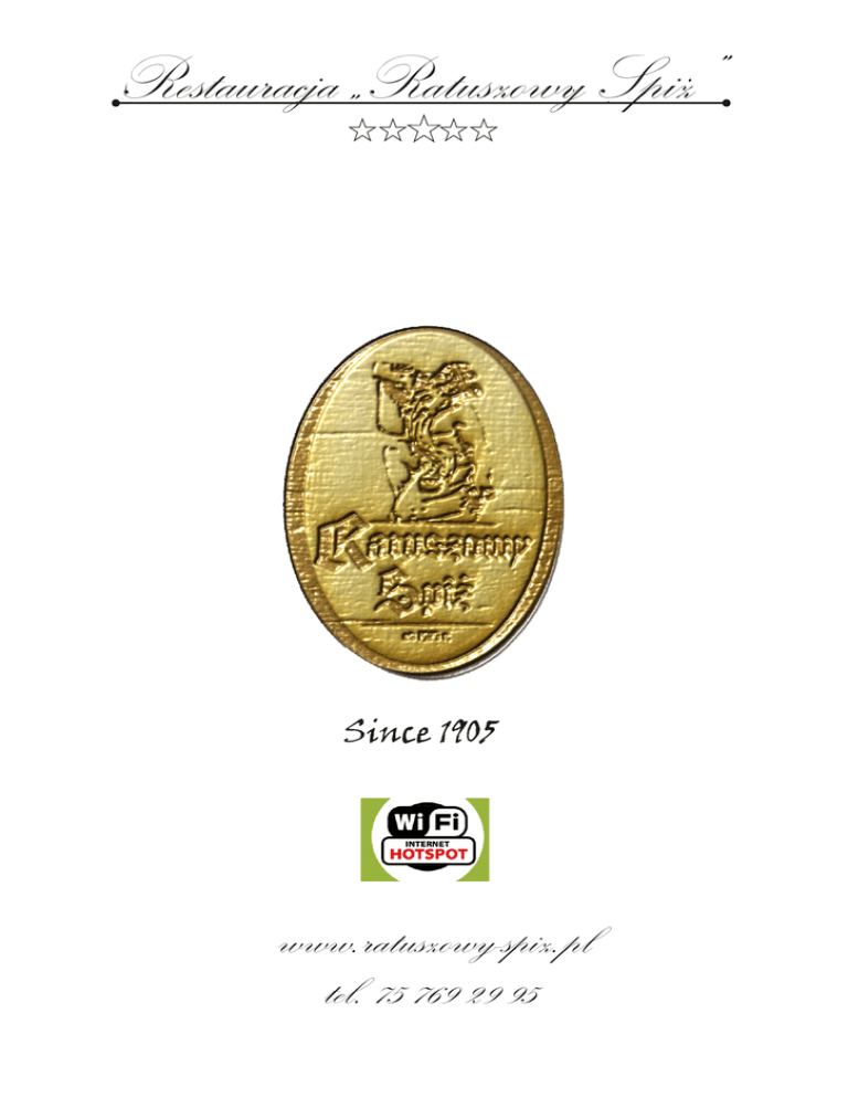 Restauracja „Ratuszowy Spiz” Since 1905 www.ratuszowy-spiz.pl tel. 75 769 29 95 Restauracja „Ratuszowy Spiz” Przystawki na zimno /Cold Snaps/ Wyśmienite kanapeczki na chrupkim pieczywie w dwóch rodzajach 9.00,- /Delicious sandwiches on crisp bread in two types/ /Leckere Sandwiches auf knusprigem brot in zwei typen/ Śledzik w dwóch kolorach marynowany w pomidorach z oliwkami oraz czosnkiem i tymiankiem podany z pieczywem i maselkiem 8.00 ,- /Herring in two colors, marinated in tomatoes with olives, garlic and thyme served with bread and butter/ /Herring in zwei Farben in Tomaten mariniert mit Oliven und Knoblauch und Thymian serviert mit Brot und Butter auf knusprigem brot verbindungen in zwei arten/ Befsztyk tatarski 18.00 ,- /Steak tartare of beef / /Tatar vom rind/ „Włoski proporzec” z serem mozarella, pomidorem i avocado 13.00 ,- /”Italian pennant” with mozarella cheese, tomato and avocado/ /"Italian Wimpel" mit mozarella, tomaten und avocado/ Winogrona na czterech serach /Grapes on the four cheeses/ /Trauben auf vier Käsesorten/ www.ratuszowy-spiz.pl tel. 75 769 29 95 12.00,- Restauracja „Ratuszowy Spiz” Przystawki na gorąco /Hot snaps/ /Warme vorspeisen/ Chrupiące kalmary w cieście z sosem cytrynowym 11.00 ,- /Crispy squids in the dough with lemon sauce/ /Crispy calamari im backteig mit zitronensauce/ Klarowny barszczyk do picia z krokietem faszerowanym serem i pieczarkami 12.00 ,- /Beetroot soup with croquette stuffed with cheese and mushrooms/ /Die klare suppe zu trinken kroketten gefüllt mit käse und champignons/ Rydze z patelni na maśle klarowanym 14.00 ,- /Saffron milk cap in a pan/ /Gebackene champignons in butter geklärt/ Krewetki królewskie smażone na masełku czosnkowym podane z pikantnym sosem brandy i chrupkim pieczywem 12.00 ,- /King prawns fried in garlic butter served with brandy sauce spicy and crispy bread/ /Riesengarnelen in Knoblauchbutter gebraten serviert mit Weinbrand-Sauce würzig und Knäckebrot/ Pieczarki zapiekane z serem podawane z chrupkim pieczywem /Mushrooms baked with cheese served with crusty bread/ /Pilze mit käse überbacken serviert mit knusprigem brot/ www.ratuszowy-spiz.pl tel. 75 769 29 95 11.00 ,- Restauracja „Ratuszowy Spiz” Zupy w wazie /Soups in tureen/ /Suppen in Terrine/ „Jak u Mamy” Tradycyjny rosół z makaronem 8.00 ,- /Traditional chicken soup with regional pasta/ /Traditionelle hühnersuppe mit regionalen pasta/ Klarowny barszczyk czerwony z kołdunami /Clear beetroot soup with dumplings/ /Klare Rote-Bete-Suppe mit Knödeln/ 9.00 ‚ca le po Krem brokułowy z grzankami czosnkowymi 10.00,- /Broccoli cream with garlic croutons/ /Broccoli-Creme mit Knoblauch-Croutons/ Wyśmienity Krem Borowikowy z grzankami pod kruchą pierzynką 15.00 ,- /Delicious boletus cream soup with croutons under French pastry/ /Köstliche Steinpilzen mit Croutons unter Französisch Gebäck/ Żurowa zalewajka Szefa Kuchni na golonce w towarzystwie ziemniaków, kiełbasy i jajka 12.00 ,- /Chef's soup with potatoes, sausages and eggs/ /Chef-Suppe mit Kartoffeln, Würstchen und Eier/ Flaczki 10.00 ,- /tripe soup/ /Kuttelsuppe/ www.ratuszowy-spiz.pl tel. 75 769 29 95 Restauracja „Ratuszowy Spiz” Dania główne /Main course/ /Pfannkuchen/ Naleśnik zapiekany ze szpinakiem i polędwiczką drobiową podany z warzywami z patelni 20.00,- /Pancake baked with spinach and chicken loin served with vegetables from the pan/ /Pfannkuchen mit Spinat und Huhn loin gekröntserviert mit gebratenem Gemüse/ Tradycyjny schab wieprzowy w panierce „od brzega do brzega” z ziemniakami z wody i bukietem surówek 22.00 ,- /Traditional pork chop with boiled Polish potatoes and salad/ /Traditionelles Schweinekotelett mit gekochtem polnischen Kartoffeln und Salat/ Karkówka wieprzowa w sosie pieczeniowym z kluseczkami śląskimi i zasmażaną czerwoną kapustą 23.00 ,- /Pork steak in gravy with silesian dumplings fried cabbage/ /Schweinesteak in Soße mit schlesischen Klößen Kraut/ Stek wołowy w sosie „pepe nero” z zapiekanymi ziemniaczkami i świeżą sałatą 43.00 ,- /Beef steak "pepe nero" with roasted potatoes and fresh salad/ /Beef Steak"pepe nero" mit Bratkartoffeln und frischem Salat/ Grilowany filet z łososia na szparagach z sosem koperkowo czosnkowym podany z ziemniaczkami zapiekanymi z rozmarynem i czosnkiem 39.00 ,- /Grilled fillet of Salmon with asparagus and garlic-dill sauce served with roasted potatoes with garlic and rosemery/ /Gegrilltes Filet vom Lachs mit Spargel und Knoblauch-Dill-Sauce serviert mit Bratkartoffeln mit Knoblauch und rosemery/ Golonka duszona w sosie piwnym po staropolsku z chrupkim pieczywem i chrzanem 32.00 ,- /Regional knuckle stewed in beer sauce with bread and horseradish/ /Regional knuckle geschmort in Bier-Sauce mit Brot und Meerrettich/ Filet z kurczaka w bekonie nadziewany serem mozarella z puree ziemniaczanym podany z sosem pieczarkowo porowym 23.00 ,- /Chicken fillet in bacon stuffed with mozarella cheese, mashed potatoes served with mushroom-leek sauce/ /Hähnchenfilet im Speckmantel, gefüllt mit Mozarella, serviert Kartoffelbrei mit Pilz-Lauch-Sauce/ Pstrag zapiekany w warzywach z masłem czosnkowym podany z frytkami i sosem lubczykowo czosnkowym 31.00 ,- /Baked Trout with vegetables and garlic butter served with chips and lovage-garlic sauce/ / Gebackene Forelle mit Gemüse und Knoblauchbutter mit Chips und Liebstöckel-Knoblauch-Sauce serviert / Schab „HANSA” z frytkami i bukietem surówek /Pork loin of "HANS" with fries and three salad/ / Schweinelende von "HANS" mit Pommes frites und drei Salat / eca 23.00,- l po Pierogi Ruskie „Jak u Babci” 12.00,- /Regional dumplings with cottage cheese/ / Regional Teigtaschen mit Quark / Placek po Węgiersku z bukietem surówek /regional potato pancake with goulash and salads in three types/ / regionalen Kartoffeln Pfannkuchen mit Gulasch und Salate in drei Arten/ www.ratuszowy-spiz.pl 20.00,- Restauracja „Ratuszowy Spiz” Dania dla k