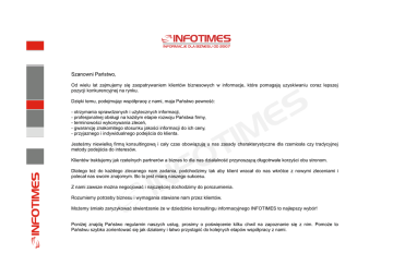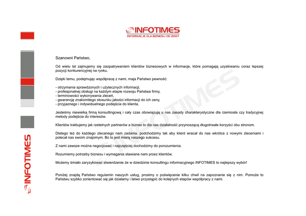 Szanowni Państwo, Od wielu lat zajmujemy się zaopatrywaniem klientów biznesowych w informacje, które pomagają uzyskiwaniu coraz lepszej pozycji konkurencyjnej na rynku. Dzięki temu, podejmując współpracę z nami, maja Państwo pewność: - otrzymania sprawdzonych i użytecznych informacji, - profesjonalnej obsługi na każdym etapie rozwoju Państwa firmy, - terminowości wykonywania zleceń, - gwarancję znakomitego stosunku jakości informacji do ich ceny, - przyjaznego i indywidualnego podejścia do klienta. Jesteśmy niewielką firmą konsultingową i cały czas obowiązują u nas zasady charakterystyczne dla rzemiosła czy tradycyjnej metody podejścia do interesów. Klientów traktujemy jak rzetelnych partnerów a biznes to dla nas działalność przynoszącą długotrwałe korzyści obu stronom. Dlatego też do każdego zlecanego nam zadania, podchodzimy tak aby klient wracał do nas wkrótce z nowymi zleceniami i polecał nas swoim znajomym. Bo to jest miarą naszego sukcesu. Z nami zawsze można negocjować i najczęściej dochodzimy do porozumienia. Rozumiemy potrzeby biznesu i wymagania stawiane nam przez klientów. Możemy śmiało zaryzykować stwierdzenie że w dziedzinie konsultingu informacyjnego INFOTIMES to najlepszy wybór! Poniżej znajdą Państwo regulamin naszych usług, prosimy o poświęcenie kilku chwil na zapoznanie się z nim. Pomoże to Państwu szybko zorientować się jak działamy i łatwo przystąpić do kolejnych etapów współpracy z nami. REGULAMIN USŁUG I. Składanie zleceń przez klienta. 1. Zlecenia przyjmujemy wyłącznie w formie pisemnej - e-mail, fax, list, itp. Nie przyjmujemy zleceń telefonicznie. 2. Zlecenie może mieć kształt nieformalny lub formalnej umowy podpisanej przez obie strony - zależnie od potrzeby klienta. 3. Ewentualne poprawki co do treści zlecenia przyjmujemy także tylko w formie pisemnej. 4. Zlecenie klienta jest potwierdzeniem przyjęcia naszej, złożonej w formie pisemnej, oferty wykonania usługi. 5. Oferta wykonania usługi może być modyfikowana przez INFOTIMES tak aby jak najlepiej odpowiadała potrzebom klienta. 6. Potwierdzeniem gotowości wykonania zlecenia przez INFOTIMES jest przesłanie klientowi (e-mailem lub faxem) faktury proforma na wykonanie usług. II. Wykonywanie zleceń przez INFOTIMES 1. Za zlecenie przyjęte uważa się zlecenie w pełni opłacone przez klienta. Potwierdzeniem opłacenia jest wpływ całości środków na nasze konto: Numer rachunku: PL 59 1140 2004 0000 3502 4766 3336 Odbiorca: INFOTIMES - BALTIC GRIFFIN KRZYSZTOF KURPIECKI Adres: SKŁODOWSKIEJ 29/35, 14-202 IŁAWA Tytułem: tu numer faktury proforma wystawionej przez nas Potwierdzeniem opłacenia jest także wpływ środków na nasze konto u operatora (DOTPAY) obsługującego karty płatnicze. Sposób płatności kartami podawany jest na życzenie klienta. W szczególnych przypadkach oferujemy także inne sposoby płatności. W przypadku stałych klientów i przy zleceniach na kwotę powyżej 1000zł netto, warunki płatności są negocjowalne. 2. Zlecenia wykonywane są zgodnie z umową i w wyznaczonym terminie. W przypadku zdarzeń niezależnych, których jako wykonawca nie mogliśmy wziąć pod uwagę, termin wykonania zlecenia może ulec wydłużeniu. 3. Zlecenia wykonywane są z najwyższą starannością, mimo to, z uwagi na materię z którą pracujemy, informacje które pozyskujemy, mogą w wyjątkowych przypadkach być nieaktualne w chwili wysyłania ich do klienta. Nie zmniejsza to uprawnień klienta do reklamacji usług. 4. Informacje przekazane i pozyskane przez nas wykorzystywane są przez klienta na jego własną odpowiedzialność. 5. Informacje przekazane przez nas klientowi nie mogą być upubliczniane bez naszej wcześniejszej zgody. III. Reklamacje 1. Reklamacje należy składać pisemnie w terminie 14 dni od otrzymania wyników zlecenia. Czas rozpatrywania reklamacji to 10 dni roboczych. 2. Przy reklamacji należy podać powód i wybrany przez klienta sposób rekompensaty. Maksymalna rekompensata to pełna suma wpłacona wcześniej przez klienta. IV. Polityka Prywatności 1. Dane klienta w żadnym przypadku nie będą udostępniane osobom trzecim. 2. Dołożyliśmy należytych starań aby ani dane klienta ani przekazane przez niego informacje nie dostały się w ręce osób postronnych. 3. Z powodów od nas niezależnych nie odpowiadamy za poufność informacji wymienianych z klientem nieszyfrowanymi kanałami komunikacji. 4. Na życzenie klienta uaktywniamy szyfrowany kanał korespondencji. V. Opłacenie zlecenia przez klienta jest równoznaczne z przyjęciem do wiadomości tego regulaminu. VI. Kwestie nie omówione w regulaminie regulowane są przez prawo w Polsce. VII. Regulamin obowiązuje od dnia 01.01.2010 do odwołania DANE FIRMY: INFOTIMES - BALTIC GRIFFIN KRZYSZTOF KURPIECKI tel: 0048 89 679 7053 fax: 0048 89 679 0632 tel kom: 0048 504 637 052 Adres korespondencyjny: ul. Skłodowskiej 29/35 14-200 Iława REGON: 280221340 NIP - PL 7441343773