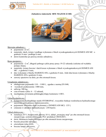 Technika 2011; Złotniki, ul. Krzemowa 1; 62-002 Suchy Las Zabudowa śmieciarki BFE MAZUR 22 HD. Skrzynia zabudowy : pojemność: 22 m3, materiały: dach, ściany i podłoga wykonana z blach wysokogatunkowych DOMEX 650 MC o grubości 4 mm / podłoga 6 mm, drzwi kontrolne po prawej stronie zabudowy. Kosz zasypowy : pojemność ~2 m3, długość pełnego cyklu pracy prasy 19-22 sekundy (zależna od wydatku pompy oleju), materiały: ściany boczne i dach kosza wykonane z blach wysokogatunkowych DOMEX 650 MC , o grubości 4 mm, dno wykonane z blachy HARDOX 450, o grubości 8 mm , boki dna kosza wykonane z blachy HARDOX 450 o grubości 6 mm, zawory spustowe na dnie, po obu stronach kosza. Urządzenie załadowcze : obsługiwane pojemniki 110 – 1100 L , zgodne z normą EN 840, wysokość podnoszenia: 1400 mm, udźwig: 500 kg, czas trwania cyklu: 6 – 12 sekund, mechanizm otwierania półokrągłej klapy kontenera 1100 l. Układ hydrauliczny : komponenty hydrauliczne marki HYDROPAC, wszystkie funkcje rozdzielacza hydraulicznego sterowane przy pomocy elektrozaworów, pojemność zbiornika oleju (wykonany z DOMEX 650 MC) 135 l, ciśnienie w układzie hydraulicznym ~250 barów. Układ elektryczny : instalacja 24 V, bezpiecznik główny 10 A, układ „awaryjny stop” po obu stronach kosza zasypowego, system elektryczny PLC produkcji CROUZET, dwie, bliźniacze kasety sterujące po obu stronach kosza zasypowego, boczne przyciski sterujące, oświetlenie tylne LED, boczne lampy obrysowe, tel./fax.: +48 61 658 55 37; email:[email protected]; www.technika2011.pl Technika 2011; Złotniki, ul. Krzemowa 1; 62-002 Suchy Las lampy robocze 4 szt., światła ostrzegawcze „kogut” 2 szt.. Pozostałe wyposażenie : dwa składane stopnie z czujnikami obciążenia i reduktorem prędkości pojazdu do 30km/h, uchwyty dla załogi korzystającej ze stopni, lakierowanie wg palety RAL, kamera cofania z ekranem 7” w kabinie kierowcy, pompa oleju dwustrumieniowa. Wszelkie opcje dodatkowe instalowane po indywidualnych konsultacjach z każdym z Klientów. Pośród wielu, mogą to być np.: systemy monitorowania pracy (tzw. GPS), systemy ważenia, systemy centralnego smarowania, systemy mycia wysokociśnieniowego, systemy zraszania… tel./fax.: +48 61 658 55 37; email:[email protected]; www.technika2011.pl
