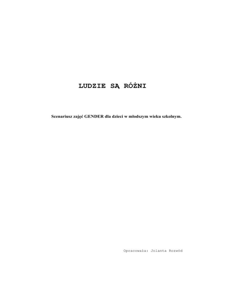 LUDZIE SĄ RÓŻNI Scenariusz zajęć GENDER dla dzieci w młodszym wieku szkolnym. Opracowała: Jolanta Rozwód Ludzie różnią się między sobą. Ten fakt jest często powodem nietolerancyjnych zachowań,agresji i wrogości wobec inności. Zajęcia są okazją do lepszego poznania się, sprzyjają refleksji na temat podobieństw i różnić między ludźmi. Cele: • • • • Uświadomienie dzieciom faktu istnienia podobieństw i różnic między ludźmi; Akceptowanie przez dzieci podobieństw i różnic między ludźmi; Kształtowanie postaw tolerancyjnych; Wzajemne poznawanie się. Metody: • • • • praca indywidualna; praca w małych grupach; praca z całym zespołem klasowym; dyskusja na forum klasy. Pomoce dydaktyczne: Kłębek włóczki, arkusz papieru formatu A-4, kolorowe mazaki, taśma papierowa, narysowane lub namalowane obrazki przedstawiające pogodę słoneczną, deszczową, burzową, wietrzną, mglistą (rozwieszone w różnych miejscach na sali), wiersz S . Kraszewskiego „ Różni, ale tacy sami”, poduszki z tuszem i kartoniki dla każdego ucznia,magnesy, krzesła ustawione w kręgu. Czas trwania zajęć: 2 godziny lekcyjne, uczniowie kl.I-III szkoły podstawowej. Przebieg zajęć: 1. Zapraszamy dzieci wchodzące do sali, aby stanęły przy obrazkach symbolizujących nastrój, w jakim rozpoczynają zajęcia. W grupach, które w sposób naturalny powstały, zachęcamy do rozmowy na ten temat. Podkreślamy, że znalazły się w małej grupie, którą coś łączy. 2. Siadamy w kręgu. Nauczyciel rozpoczyna powitanie wygłaszając takie oto zdanie: Witam wszystkich, którzy tak, jak ja .............. (dodaje informacje o sobie i dołącza powitalny gest). Te dzieci których dotyczy ta informacja, powtarzają gest Nauczyciela. Zapraszamy kolejnych uczestników do kontynuowania zabawy. 3. Nauczyciel rozdaje uczestnikom zajęć czyste kartki papieru, kolorowe mazaki i prosi, aby każdy z nich narysował na środku kartki swój portret, podpisał go zdrobnieniem swojego imienia, które najbardziej lubi, a następnie zapisał na kartce te informacje o sobie, którymi chciałby się podzielić z innymi dziećmi. 4. Stworzenie na tablicy galerii portretów i zaproszenie wszystkich obecnych do jej obejrzenia. 5. Dzieci wracają do kręgu. Nauczyciel czyta wiersz: ,,Różni, ale tacy sami” S. Kraszewskiego Wyglądam tak jak inni, z daleka – taki sam. Dwie ręce i dwie nogi, i jedna głowę mam! Wyszedłem na ulicę, tam wielu ludzi szło, a każdy z nich był inny, i różnic było sto! Mały, duży, chudy, gruby, blondyn, szatyn, brunet, rudy, śniady, blady, piegowaty, ostrzyżony, lub kudłaty, oczy czarne, piwne, szare, każdy z nas ma oczu parę... Więcej różnic nie wyliczę, bo nie liczą się różnice! Jesteśmy trochę różni, a jednak tacy sami, choć różne charaktery, podobne myśli mamy! 6. Dostrzeganie szczegółów twarzy swoich kolegów. Dzieci siedzą w kręgu. Każde dziecko mówi, co podoba mu się w twarzy sąsiada z lewej strony. 7. Następnie nauczyciel daje uczestnikom kłębek wełny. Trzymając koniec nitki kłębka włóczki, dzieci rzucają kłębek kolejno do wybranej osoby, mówiąc: Joasiu (Zosieńko, Misiu, Krzysiu itp. - posługując się zdrobnieniami zapisanymi na portretach dzieci) jestem do ciebie podobna/podobny w tym, że ......... ( wybierają informację z portretu dziecka, albo znajdują inny atrybut podobieństwa). Osoba, która otrzyma kłębek, kontynuuje zabawę. 8. Powstała grupowa pajęczyna, którą należy rozplątać. Ostatni członek grupy, który otrzymał kłębek, odrzuca go do swojego poprzednika, mówiąc: Małgosiu (inne imię)różnię się od Ciebie tym, że .......... ( ponownie wybierają informację z portretu dziecka lub dodają swoją). 9. Podsumowanie zajęć. Ludzie są różni. Nigdy nie było i nie będzie kogoś takiego jak TY czy ja. Każdy z nas jest wyjątkowy, niepowtarzalny. Jesteśmy podobni i jednocześnie różnimy się. Jest to zupełnie naturalne. 10. Odciskanie kciuka na kartce ze swoim portretem. Podkreślenie, że tak jak każdy człowiek jest inny, tak samo odciski kciuków różnią się. 11. Na zakończenie tworzymy wspólną listę podobieństw i różnic występujących w grupie.