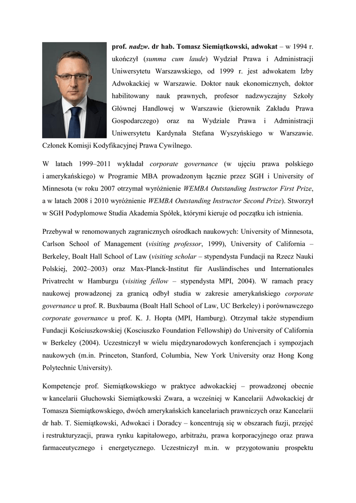 prof. nadzw. dr hab. Tomasz Siemiątkowski, adwokat – w 1994 r. ukończył (summa cum laude) Wydział Prawa i Administracji Uniwersytetu Warszawskiego, od 1999 r. jest adwokatem Izby Adwokackiej w Warszawie. Doktor nauk ekonomicznych, doktor habilitowany nauk prawnych, profesor nadzwyczajny Szkoły Głównej Handlowej w Warszawie (kierownik Zakładu Prawa Gospodarczego) oraz na Wydziale Prawa i Administracji Uniwersytetu Kardynała Stefana Wyszyńskiego w Warszawie. Członek Komisji Kodyfikacyjnej Prawa Cywilnego. W latach 1999–2011 wykładał corporate governance (w ujęciu prawa polskiego i amerykańskiego) w Programie MBA prowadzonym łącznie przez SGH i University of Minnesota (w roku 2007 otrzymał wyróżnienie WEMBA Outstanding Instructor First Prize, a w latach 2008 i 2010 wyróżnienie WEMBA Outstanding Instructor Second Prize). Stworzył w SGH Podyplomowe Studia Akademia Spółek, którymi kieruje od początku ich istnienia. Przebywał w renomowanych zagranicznych ośrodkach naukowych: University of Minnesota, Carlson School of Management (visiting professor, 1999), University of California – Berkeley, Boalt Hall School of Law (visiting scholar – stypendysta Fundacji na Rzecz Nauki Polskiej, 2002–2003) oraz Max-Planck-Institut für Ausländisches und Internationales Privatrecht w Hamburgu (visiting fellow – stypendysta MPI, 2004). W ramach pracy naukowej prowadzonej za granicą odbył studia w zakresie amerykańskiego corporate governance u prof. R. Buxbauma (Boalt Hall School of Law, UC Berkeley) i porównawczego corporate governance u prof. K. J. Hopta (MPI, Hamburg). Otrzymał także stypendium Fundacji Kościuszkowskiej (Kosciuszko Foundation Fellowship) do University of California w Berkeley (2004). Uczestniczył w wielu międzynarodowych konferencjach i sympozjach naukowych (m.in. Princeton, Stanford, Columbia, New York University oraz Hong Kong Polytechnic University). Kompetencje prof. Siemiątkowskiego w praktyce adwokackiej – prowadzonej obecnie w kancelarii Głuchowski Siemiątkowski Zwara, a wcześniej w Kancelarii Adwokackiej dr Tomasza Siemiątkowskiego, dwóch amerykańskich kancelariach prawniczych oraz Kancelarii dr hab. T. Siemiątkowski, Adwokaci i Doradcy – koncentrują się w obszarach fuzji, przejęć i restrukturyzacji, prawa rynku kapitałowego, arbitrażu, prawa korporacyjnego oraz prawa farmaceutycznego i energetycznego. Uczestniczył m.in. w przygotowaniu prospektu emisyjnego pierwszej spółki utworzonej na prawie obcym, której akcje zostały dopuszczone do obrotu publicznego w Polsce, reprezentował w postępowaniu przed Trybunałem Konstytucyjnym Polską Konfederację Pracodawców Prywatnych „Lewiatan” w sprawie wprowadzenia obowiązku stosowania marż urzędowych oraz zasad stosowania cen w obrocie lekami importowanymi, uzyskując korzystne dla swego klienta orzeczenie, a także opracował i zrealizował pierwszą na polskim rynku publicznym koncepcję wypłaty dywidendy w akcjach „gratisowych”. Pełnił funkcję członka rady nadzorczej m.in. PKO BP S.A. oraz Przewodniczącego Komitetu Audytu tej Rady, PLL LOT S.A. oraz Polbank S.A. Aktualnie Przewodniczący Rady Nadzorczej Polskiej Grupy Zbrojeniowej S.A., członek Naukowej Grupy Doradczej przy Grupie Kapitałowej PGNiG, a także członek Rady Fundacji Piłkarstwa Polskiego i PolskoAmerykańskiej Fundacji Onkologicznej. Był współautorem projektu ustawy nowelizującej kodeks spółek handlowych oraz członkiem zespołu ekspertów pracującego pod kierownictwem prof. S. Sołtysińskiego (2001–2003). W latach 2003–2005 był członkiem zespołu problemowego, powołanego przez Przewodniczącego Komisji Kodyfikacyjnej Prawa Cywilnego, który przygotował projekt ustawy wprowadzającej do polskiego systemu prawnego spółkę europejską (w zespole tym był odpowiedzialny za opracowanie regulacji monistycznego systemu ładu korporacyjnego), a następnie uczestniczył jako ekspert rządu w pracach parlamentarnych nad tym projektem. W grudniu 2009 r. został powołany przez Przewodniczącego Komisji Kodyfikacyjnej Prawa Cywilnego w skład stałego zespołu problemowego Komisji Kodyfikacyjnej Prawa Cywilnego ds. nowelizacji kodeksu spółek handlowych (współautor tzw. projektu modernizacji spółki z o.o. oraz projektu implementacji dyrektywy 2009/109/WE dotyczącej sprawozdawczości i dokumentacji w przypadku połączeń i podziałów spółek). W roku 2011 został powołany przez Przewodniczącego Komisji Kodyfikacyjnej Prawa Cywilnego w skład zespołu ds. prawa spółek. Od 2011 Członek Komisji Legislacyjnej Naczelnej Rady Adwokackiej (przewodniczący zespołu prawa gospodarczego i handlowego tej komisji). Prof. Siemiątkowski jest arbitrem Sądu Arbitrażowego przy KIG w Warszawie, Sądu Arbitrażowego przy PKPP „Lewiatan” i Sądu Polubownego przy KNF. Jest także członkiem American Law & Economics Association, członkiem–założycielem Polskiego Stowarzyszenia Ekonomicznej Analizy Prawa (Law & Economics), członkiem zarządu Polskiego Stowarzyszenia Sądownictwa Polubownego oraz Polskiego Towarzystwa Prawa Sportowego. Jest autorem dwóch monografii: Prokura w spółkach prawa handlowego, (LexisNexis 1999) oraz Odpowiedzialność cywilnoprawna w spółkach kapitałowych, (C.H. Beck, 2007) współautorem i współredaktorem czterotomowego komentarza do kodeksu spółek handlowych opublikowanego w LexisNexis – Spółki osobowe (2011), Spółka z ograniczoną odpowiedzialnością (2011), Spółka akcyjna (2012), Łączenie, podział i przekształcanie spółek (2011), współautorem Systemu Prawa Prywatnego t. 16 – Prawo spółek osobowych pod red. A. Szajkowskiego oraz t. 17 – Prawo spółek kapitałowych pod red. S. Sołtysińskiego, autorem bądź współautorem kilkudziesięciu artykułów z zakresu prawa cywilnego i handlowego, opublikowanych m.in. w „Palestrze”, „Przeglądzie Prawa Handlowego”, „Przeglądzie Sądowym” oraz „Przeglądzie