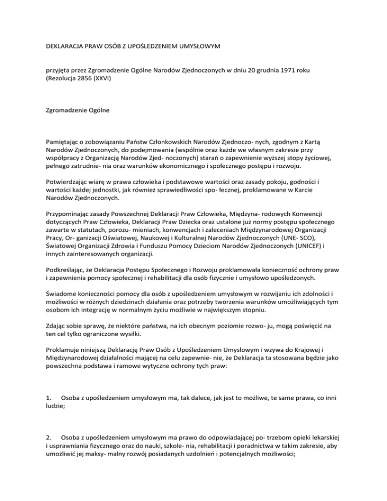 DEKLARACJA PRAW OSÓB Z UPOŚLEDZENIEM UMYSŁOWYM przyjęta przez Zgromadzenie Ogólne Narodów Zjednoczonych w dniu 20 grudnia 1971 roku (Rezolucja 2856 (XXVI) Zgromadzenie Ogólne Pamiętając o zobowiązaniu Państw Członkowskich Narodów Zjednoczo- nych, zgodnym z Kartą Narodów Zjednoczonych, do podejmowania (wspólnie oraz każde we własnym zakresie przy współpracy z Organizacją Narodów Zjed- noczonych) starań o zapewnienie wyższej stopy życiowej, pełnego zatrudnie- nia oraz warunków ekonomicznego i społecznego postępu i rozwoju. Potwierdzając wiarę w prawa człowieka i podstawowe wartości oraz zasady pokoju, godności i wartości każdej jednostki, jak również sprawiedliwości spo- łecznej, proklamowane w Karcie Narodów Zjednoczonych. Przypominając zasady Powszechnej Deklaracji Praw Człowieka, Międzyna- rodowych Konwencji dotyczących Praw Człowieka, Deklaracji Praw Dziecka oraz ustalone już normy postępu społecznego zawarte w statutach, porozu- mieniach, konwencjach i zaleceniach Międzynarodowej Organizacji Pracy, Or- ganizacji Oświatowej, Naukowej i Kulturalnej Narodów Zjednoczonych (UNE- SCO), Światowej Organizacji Zdrowia i Funduszu Pomocy Dzieciom Narodów Zjednoczonych (UNICEF) i innych zainteresowanych organizacji. Podkreślając, że Deklaracja Postępu Społecznego i Rozwoju proklamowała konieczność ochrony praw i zapewnienia pomocy społecznej i rehabilitacji dla osób fizycznie i umysłowo upośledzonych. Świadome konieczności pomocy dla osób z upośledzeniem umysłowym w rozwijaniu ich zdolności i możliwości w różnych dziedzinach działania oraz potrzeby tworzenia warunków umożliwiających tym osobom ich integrację w normalnym życiu możliwie w największym stopniu. Zdając sobie sprawę, że niektóre państwa, na ich obecnym poziomie rozwo- ju, mogą poświęcić na ten cel tylko ograniczone wysiłki. Proklamuje niniejszą Deklarację Praw Osób z Upośledzeniem Umysłowym i wzywa do Krajowej i Międzynarodowej działalności mającej na celu zapewnie- nie, że Deklaracja ta stosowana będzie jako powszechna podstawa i ramowe wytyczne ochrony tych praw: 1. Osoba z upośledzeniem umysłowym ma, tak dalece, jak jest to możliwe, te same prawa, co inni ludzie; 2. Osoba z upośledzeniem umysłowym ma prawo do odpowiadającej po- trzebom opieki lekarskiej i usprawniania fizycznego oraz do nauki, szkole- nia, rehabilitacji i poradnictwa w takim zakresie, aby umożliwić jej maksy- malny rozwój posiadanych uzdolnień i potencjalnych możliwości; 3. Osoba z upośledzeniem umysłowym ma prawo do zabezpieczenia środ- ków utrzymania i godziwego poziomu życia. Ma ona prawo do wykony- wania pracy zarobkowej bądź innego pożytecznego zajęcia przy najpeł- niejszym wykorzystaniu jej uzdolnień; 4. Kiedy tylko jest to możliwe, Osoba z upośledzeniem umysłowym powinna żyć razem z własną rodziną względnie z rodzina zastępcza i uczestniczyć w różnych formach życia społecznego. Rodzina, z którą zamieszkuje, po- winna otrzymywać pomoc. Jeżeli konieczne jest umieszczenie w zakładzie opiekuńczym, to warunki życia i otoczenie w tym zakładzie powinny być jak najbardziej zbliżone do warunków życia normalnego; 5. Osoba z upośledzeniem umysłowym ma prawo do korzystania z pomo- cy opiekunów o odpowiednich kwalifikacjach, jeśli jest to wskazane do ochrony jej osoby i interesów; 6. Osoba z upośledzeniem umysłowym ma prawo do ochrony przed wy- zyskiem nadużyciami i poniżającym traktowaniem. Osoba z upośledze- niem umysłowym postawiona w stan oskarżenia ma prawo do normal- nego postępowania sądowego z pełnym uwzględnieniem stopnia jej odpowiedzialności; 7. Jeśli Osoba z upośledzeniem umysłowym nie jest w stanie ze względu na stopień swego upośledzenia prawidłowo korzystać ze swoich uprawnień, lub gdy konieczne jest ograniczenie lub pozbawienie jej części lub wszyst- kich uprawnień, to stosowane w tym przypadku postępowanie powinno zapewnić prawne środki ochrony osoby z upośledzeniem umysłowym przed możliwością jakichkolwiek form nadużyć. Postępowanie to opar- te być powinno na ocenie dojrzałości społecznej osoby z upośledzeniem umysłowym, dokonanej przez wykwalifikowanych specjalistów. Decyzje w sprawie ograniczenia lub pozbawienia uprawnień powinny być wery- fikowane w odpowiednich terminach i podlegać odwołaniu do wyższych instancji.