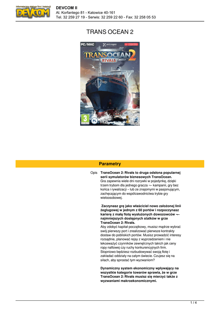 DEVCOM II Al. Korfantego 81 - Katowice 40-161 Tel. 32 259 27 19 - Serwis: 32 259 22 60 - Fax: 32 258 05 53 TRANS OCEAN 2 Parametry Opis TransOcean 2: Rivals to druga odsłona popularnej serii symulatorów biznesowych TransOcean. Gra zapewnia wiele dni rozrywki w pojedynkę, dzięki trzem trybom dla jednego gracza ¬– kampanii, gry bez końca i rywalizacji – lub ze znajomymi w pasjonującym, zachęcającym do współzawodnictwa trybie gry wieloosobowej. Zaczynasz grę jako właściciel nowo założonej linii żeglugowej w jednym z 60 portów i rozpoczynasz karierę z małą flotą wysłużonych dowozowców ¬– najmniejszych dostępnych statków w grze TransOcean 2: Rivals. Aby zdobyć kapitał początkowy, musisz mądrze wybrać swój pierwszy port i zrealizować pierwsze kontrakty dostaw do pobliskich portów. Musisz prowadzić interesy rozsądnie, planować rejsy z wyprzedzeniem i nie lekceważyć czynników zewnętrznych takich jak ceny ropy naftowej czy ruchy konkurencyjnych firm. Stopniowo będziesz rozbudowywać swoją flotę i zakładać oddziały na całym świecie. Czujesz się na siłach, aby sprostać tym wyzwaniom? Dynamiczny system ekonomiczny wpływający na wszystkie kategorie towarów sprawia, że w grze TransOcean 2: Rivals musisz się mierzyć także z wyzwaniami makroekonomicznymi. 1/4 DEVCOM II Al. Korfantego 81 - Katowice 40-161 Tel. 32 259 27 19 - Serwis: 32 259 22 60 - Fax: 32 258 05 53 Trzy dostępne typy statków – zbiornikowce, kontenerowce i masowce – umożliwią ci wyspecjalizowanie się i doprowadzenie swojej firmy na sam szczyt. Rzuć wyzwanie konkurencji i zbuduj własną korporację o globalnym zasięgu. W trybie gry jednoosobowej możesz też zmierzyć się z niezwykłym wyzwaniem – samodzielnie stanąć za kołem sterowym i poprowadzić swoje statki na różnych trójwymiarowych mapach w niełatwych sytuacjach podczas strajku holowników. Czy uda ci się przepłynąć cały basen portowy bez uszkodzeń, omijając zarówno małe, jak i wielkie jednostki? Kampania Wiele lat temu udało ci się spłacić bezwzględnego inwestora i zostać prawdziwym potentatem żeglugi oceanicznej. Jednak coś poszło nie tak! Twoje imperium żeglugowe popadło w ruinę, a do tego twój dawny konsultant i znajomy, Hiram T. Witherspoon, wylądował za kratkami. Obecnie prowadzisz odludne życie jako maszer na Alasce. Jednak chęć pomocy Hiramowi i pokrzyżowania planów Lydii Blythe-Smith, twojemu dawnemu wrogowi, przekonuje cię, aby wrócić do świata żeglugi wielkiej. Czy starczy ci determinacji, aby stawić czoło dawnym i nowym konkurentom oraz odzyskać dawną pozycję światowego potentata? Tylko ty możesz raz na zawsze położyć kres nieczystym zagraniom rynkowym Lydii Blythe-Smith. Zawartość trybu kampanii: - 6 pasjonujących rozdziałów, dzięki którym poznasz wszystkie zasady i mechanizmy rządzące grą - Trzy medale za osiągnięcia, znacznie zwiększające atrakcyjność ponownego przechodzenia rozdziałów - Możliwość ponownego spotkania starych przyjaciół i nawiązania nowych znajomości podczas walki z bezlitosnymi konkurentami; - Dostępne także we wszystkich trybach gry jednoosobowej – samodzielne sterowanie statkami w pasjonujących mini-grach w środowisku trójwymiarowym. Tryb gry wieloosobowej W grze wieloosobowej stajesz do walki z maksymalnie 7 innymi graczami. Będziesz potrzebować mistrzowskiej strategii, żeby nie dać się prześcignąć konkurencji. Coraz bardziej zacięta rywalizacja udostępni ci nowe możliwości: walkę o ekonomiczną dominację w różnych regionach świata albo akcje sabotażowe, wyrządzające szkody konkurentom. Musisz jednak działać rozważnie – przeciwnicy na pewno nie puszczą ci tego płazem. Każda gra jest podzielona na kilka rund, w których trzeba wykonywać określone zadania, aby zdobyć Punkty Zwycięstwa. Wygrywa gracz, który na koniec gry zgromadzi najwięcej Punktów Zwycięstwa. Kryteria przyznawania Punktów Zwycięstwa są określane losowo na początku każdej gry. Możliwe jest też ręczne ustawienie długości gry. Dzięki temu wszystkiemu nigdy nie będzie się dało zastosować optymalnej strategii, a każda gra przyniesie 2/4 DEVCOM II Al. Korfantego 81 - Katowice 40-161 Tel. 32 259 27 19 - Serwis: 32 259 22 60 - Fax: 32 258 05 53 nowe wyzwania. W jednej grze można zdobyć Punkty Zwycięstwa, gromadząc największy kapitał, a w innej nagrodę przyniesie posiadanie najnowocześniejszego statku. Czy uda ci się sprostać wszystkim wyzwaniom i pokonać konkurencję? Zawartość trybu gry wieloosobowej: - Rywalizacja w czasie rzeczywistym z maksymalnie 7 graczami; Niepowtarzalne wrażenia podczas każdej gry dzięki różnym kryteriom przyznawania Punktów Zwycięstwa, określanym losowo na początku każdej gry - Szeroki wachlarz strategii, urozmaicający rozgrywkę w każdej partii - Możliwość zyskiwania przewagi nad konkurentami w kluczowych momentach dzięki akcjom sabotażowym - Możliwość określenia długości każdej gry – nawet do 2 godzin Cechy gry: - Trzy różne tryby gry: pełna wyzwań kampania, relaksująca gra bez końca oraz tryb rywalizacji z przeciwnikami SI; - Popularna mini-gra w środowisku trójwymiarowym – stań za sterem własnego statku i przeprowadź go przez niebezpieczne sytuacje; - Walka z innymi graczami w trybie gry wieloosobowej, oferującym szeroki wachlarz możliwych strategii zdobywania Punktów Zwycięstwa; - Możliwość sabotowania rywali - Nowe typy statków i ładunku: kontenerowce, zbiornikowce i masowce – każdy typ statku ma unikatowe mocne i słabe strony - Szerokie możliwości ulepszania statków - Ponad 60 portów na wszystkich kontynentach - Niesamowita orkiestrowa ścieżka dźwiękowa - Możliwość rozbudowywania floty i kupowania większych statków - Możliwość wytyczania nowych, dynamicznych wyzwań i zdobycia pozycji światowego potentata żeglugowego Data premiery 2016-10-28 Platforma DRM Gatunek 