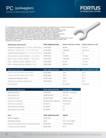 PC (poliwęglan) 3D PRODUCTION SYSTEMS Dedykowany dla systemów produkcyjnych FORTUS TM PC (poliwęglan) jest prawdziwym przemysłowym materiałem termoplastycznym szeroko stosowanym w przemyśle motoryzacyjnym, lotniczym ale również w medycynie jak i w wielu innych gałęziach przemysłu. PC zapewnia dokładność, trwałość i niezmienność kształtu w miarę upływu czasu czego efektem są trwałe części, które wytrzymują użytkowe testy funkcjonalności. Części produkowane z PC z zastosowaniem systemów produkcyjnych Fortus są od 5 do 60 procent bardziej wytrzymałe niż części wykonane na poprzednich systemach FDM. PC w porównaniu z ABS i innymi materiałami termoplastycznymi posiada doskonałe właściwości mechaniczne. W połączeniu z systemami produkcyjnymi Fortus, PC daje możliwość wytwarzania realnych, użytecznych części TM (ang. Real Parts ) z których powstają modele koncepcyjne, funkcjonalne prototypy oraz narzędzia produkcyjne. Właściwości mechaniczne1 Metoda wgktórej wykonanotesty System metryczny w Polsce System metryczny w USA Wytrzymałość na rozciąganie (Typ 1, 3.175 mm, 5.08 mm/min) ASTM D638 68 MPa 9,800 psi Moduł Younga – rozciąganie (Typ 1, 3.175 mm, 5.08 mm/min) ASTM D638 2,300 MPa 330,000 psi Wydłużeniepozerwaniuprzyrozciąganiu (Typ 1, 3.175 mm, 5.08 mm/min) ASTM D638 5% 5% Wytrzymałość na zginanie (Metoda 1, 1.27 mm/min) ASTM D790 104 MPa 15,100 psi Moduł Younga – zginanie (Metoda 1, 1.27 mm/min) ASTM D790 2,200 MPa 324,000 psi IZOD – udarność z karbem (Metoda A, 23°C) ASTM D256 53 J/m 1 ft-lb/cal IZOD – udarność bez karbu (Metoda A, 23°C) ASTM D256 320 J/m 6 ft-lb/cal Właściwości termiczne2 Metoda wgktórej wykonanotesty System metryczny w Polsce System metryczny w USA Temperatura ugięcia pod obciążeniem (HDT) 0.45 MPa, ASTM D648 138°C 280°F Temperatura ugięcia pod obciążeniem (HDT) 1.83 MPa, ASTM D648 127°C 261°F Temperatura mięknięcia (Vicat) ASTM D1525 139°C 282°F Temperatura zeszklenia materiału (Tg) DMA (SSYS) 161°C 322°F 3 Punkt topnienia --------- Nie dotyczy Właściwości elektryczne4 Metoda wgktórej wykonanotesty Zakres wartości Rezystancja skrośna ASTM D257 2.0x10e14 - 6.0x10e13 Ω Stała dielektryczna ASTM D150-98 3.0 - 2.8 Współczynnik strat ASTM D150-98 0.0006 - 0.0005 Odporność na przebicie ASTM D149-09, Metoda A 360-80 V/mm Odporność na przebicie IEC 60112 15.0 kV/mm Stała dielektryczna (60 Hz) IEC 60250 3.2 Stała dielektryczna (1 Mhz) IEC 60250 3.0 Inne2 Metoda wgktórej wykonanotesty Wartość Gęstość względna ASTM D792 1.2 Klasyfikacja palności UL94 V2 (1.1 mm, 0.043”) Współczynnik objętościowej rozszerzalności cieplnej ASTM E831 3.8E-05 cal/cal/°F Twardość wg Skali Rockwella ASTM D785 R115 Nie dotyczy3 TERMOPLASTYCZNE MATERIAŁY DO PRZYROSTOWEGO WYTWARZANIA PC Dedykowany dla systemów Dostępne grubości warstw Typ materiału podporowego Fortus 360mc Fortus 400mc Fortus 900mc 0.330 mm (0.013 cala) 0.254 mm (0.010 cala) 0.178 mm (0.007 cala) Nierozpuszczalny; materiał typu BASS (ang. Break Away Support Structure) – podpora odłamywalna. Dostępne kolory Biały Prezentowane dane są wartościami przeznaczonymi jako punkt odniesienia i do celów porównawczych. Nie powinny być używane do specyfikacji projektów lub kontroli jakości. Na końcowe właściwości materiałów może mieć wpływ, choć nie tylko: sposób projektowania części, docelowe warunki w których części będą używane, warunki wykonywania testów, itp. Rzeczywiste wartości zależą od warunków budowy części. Testowane części zostały zbudowane z zastosowaniem systemu Fortus 400mc; grubość warstwy: 0.254mm (0.010’’). Specyfikacja produktu może ulec zmianie bez powiadomienia. Orientacja budowania detalu jest zgodna z jego najdłuższą krawędzią. 1 Wartości z literatury, chyba że podano inaczej. 2 3 Ze względu na amorficzny charakter materiału nie podano temperatury punktu topienia. Wszystkie elektryczne dane zostały wyznaczone na podstawie wartości średnich z testów wykonywanych na częściach (płytach) wytwarzanych w ustawieniach standardowych (SOLID). Płyty testowe miały wymiary 102 x 102 x 2.5 mm (4 x 4 x 0.1 cala) i zostały zbudowane zarówno w orientacji pionowej jak i poziomej. Zakres wartości jest głównie wynikiem różnic sposobu budowania płyt testowych tzn. płyty były budowane w dwóch różnych orientacjach – poziomej i pionowej. 4 W skrócie: Zaawansowana technologia TM FDM ® Systemy Fortus są oparte na opatentowanej przez firmę Stratasys technologii FDM – ang. Fused Deposition Modeling. FDM jest przemysłową technologią addytywnego wytwarzania, która jako jedyna oferuje przyrostowe wytwarzanie najbardziej trwałych części z termoplastycznych materiałów. Systemy Fortus wykorzystują szeroki zakres materiałów termoplastycznych o zaawansowanych mechanicznych właściwościach, dzięki czemu wytwarzane części nie są podatne na wysoką temperaturę, żrące chemikalia, sterylizację i inne trudne warunki pracy. Bez specjalnych udogodnień System Fortus może zostać zainstalowany prawie wszędzie. Nie wymaga specjalnego systemu wentylacji ponieważ nie produkuje szkodliwych oparów, chemikaliów i odpadów. Bez specjalnych umiejętności Systemy Fortus są proste w obsłudze i utrzymaniu w porównaniu do innych dostępnych na rynku systemów, ponieważ nie wymagają stosowania problematycznych proszków i żywic, które wymagałyby specjalnego przechowywania. Opanowanie obsługi systemów Fortus jest bardzo proste i zajmuje nie więcej niż 30 min. . Nowe spojrzenie na jakość produkcji Wysoka jakość w najdrobniejszych szczegółach. Finalnie gładka powierzchnia. Dokładność. Wytrzymałość. Najlepszą drogą żeby przekonać się o zaletach systemu Fortus jest zbudowanie własnej części z zastosowaniem tego systemu. Zamów darmową część na stronie: www.fortus.com/benchmark. W celu uzyskania szcz