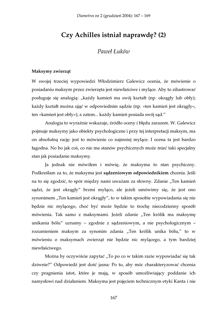 Diametros nr 2 (grudzie 2004): 167 – 169 Czy Achilles istniał naprawd ? (2) Paweł Łuków Maksymy zwierz t W swojej trzeciej wypowiedzi Włodzimierz Galewicz ocenia, e mówienie o posiadaniu maksym przez zwierz ta jest niewła ciwe i myl ce. Aby to zilustrowa posługuje si analogi : „ka dy kamie ka dy kształt mo na uj ma swój kształt (np. okr gły lub obły); w odpowiednim s dzie (np. »ten kamie jest okr gły«, ten »kamie jest obły«); a zatem... ka dy kamie posiada swój s d.” Analogia to wyra nie wskazuje, ródło oceny i bł du zarazem. W. Galewicz pojmuje maksymy jako obiekty psychologiczne i przy tej interpretacji maksym, ma on absolutn racj : jest to mówienie co najmniej myl ce. I ocena ta jest bardzo łagodna. No bo jak co , co nie ma stanów psychicznych mo e mie taki specjalny stan jak posiadanie maksymy. Ja jednak nie mówiłem i mówi , e maksyma to stan psychiczny. Podkre lam za to, e maksyma jest s dzeniowym odpowiednikiem chcenia. Je li na to si zgodzi , to spór mi dzy nami uwa am za słowny. Zdanie „Ten kamie s dzi, e jest okr gły” brzmi myl co, ale je eli umówimy si , e jest ono synonimem „Ten kamie jest okr gły”, to w takim sposobie wypowiadania si nie b dzie nic myl cego, cho by mo e b dzie to troch niecodzienny sposób mówienia. Tak samo z maksymami. Je eli zdanie „Ten królik ma maksym unikania bólu” uznamy – zgodnie z s dzeniowym, a nie psychologicznym – rozumieniem maksym za synonim zdania „Ten królik unika bólu,” to w mówieniu o maksymach zwierz t nie b dzie nic myl cego, a tym bardziej niewła ciwego. Mo na by oczywi cie zapyta „To po co w takim razie wypowiada si tak dziwnie?” Odpowied jest do jasna: Po to, aby móc charakteryzowa chcenia czy pragnienia istot, które je maj , w sposób umo liwiaj cy poddanie ich namysłowi nad działaniem. Maksyma jest poj ciem technicznym etyki Kanta i nie 167 Paweł Łuków ma potrzeby robi Czy Achilles istniał naprawd ? (2) z niej czego wi cej ni tym czym jest, tj. narz dziem teoretycznym słu cym namysłowi moralnemu. Rozci ganie ogólno ci Nie jestem pewny, czy w zarzutach W. Galewicza chodzi o ogólno predykacji), czy o uniwersalno (kwestia (kwestia kwantyfikacji). S to naturalnie dwa ró ne zagadnienia. Tego ostatniego dotyczyła wczorajsza dyskusja o interpretacji sprawdzianu imperatywu kategorycznego. S dz , e dzisiaj chodzi o to pierwsze, a wi c o problem, jaki ma by poziom ogólno ci maksymy, aby mo na j było podda testowi imperatywu kategorycznego. Obiekcja ta jest znana w literaturze przedmiotu jako „przykrawanie maksym.” Twierdzi si (jak to jest w przykładzie z Brandta), e mo emy tak przykroi maksym , aby sprawdzian imperatywu kategorycznego wykazał, e post pujemy słusznie niezale nie od tego, jak post pujemy. Zarzut ten uwa am za doniosły. Ale niecelny. Wystarczy zwróci uwag na dwie – w istocie bardzo podobne, lecz mimo to odr bne – jego interpretacje. Po pierwsze, je li zarzut ten głosi, e hipokryta mo e wykorzysta sprawdzian imperatywu kategorycznego jak zechce, to w odpowiedzi nale y powiedzie , e tak samo mo e on wykorzysta ka dy sprawdzian, kantowski czy niekantowski. Wierz , e milcz cym zało eniem budowania teorii normatywnych jest to, teorie nie b d poczyna e wykorzystywane przez szukaj cych wymówek dla swoich hipokrytów, ale przez ludzi, którzy autentycznie pragn ustali , jak powinni post pi . Po drugie, je li zarzut przykrawania maksym głosi, oceniwszy, co jest czyj maksym mo na doj e niewła ciwie do wadliwych konkluzji moralnych, to wystarczy zda sobie spraw , e nie jest to problem endemiczny dla kantyzmu. Mówi c skrótowo, jest to problem opisu istotnego rozwa anego działania. Ten problem, który w ostatnich latach nazywa si chyba bardziej trafnie problemem os du (Urteilskraft) moralnego, musi podj ka da teoria moralna. Kant doskonale zdawał sobie z niego spraw (np. Gr, 407; Gem, 8: 284/285) i w jego tekstach mo na znale wskazówki rozwi zania tego problemu. O tym, e 168 Paweł Łuków widział problem wiadcz Czy Achilles istniał naprawd ? (2) jego twierdzenia, e nigdy nie mo emy do ko ca pozna nawet własnych autentycznych motywów działania. Ale te podkre lał, e nie jest to powód, by zaniecha tworzenia teorii moralnej (Gem, tam e). mier w Czarnobylu Wydaje si , e istotnie uwaga Mirosława elaznego o po wi caniu ludzi w Czarnobylu w imi idei człowiecze stwa, nie tylko mo e – jak słusznie mówi Galewicz – ale po prostu jest myl ca. Dodałbym te , e jest gro na. Sugeruje ona poniechanie jednostek w imi abstrakcyjnych idei, które niby maj co wspólnego z dobrem, ale dobrem pojmowanym w oderwaniu od jednostek, w których czy dla których ma si ono realizowa . Przykładów takiego post powania dostarczaj niektóre współczesne dyskusje moralne (zwłaszcza w bioetyce), w których wyst puje słowo osoba. Nawoływaniom do poszanowania osoby nierzadko towarzyszy absolutna nieczuło na los ludzi z krwi i ko ci. Bywa, e w imi poszanowania osoby akceptuje si cierpienie, upokorzenie i osamotnienie ludzi. To tak jakby ogromny ideał OSOBY był tak ogromny, e nie wida zza niego zwykłych ludzi. 169