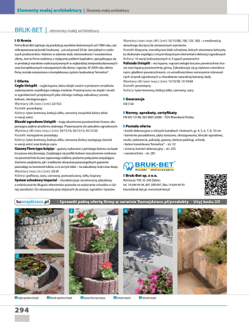 Elementy małej architektury | Elementy małej architektury BRUK-BET | elementy małej architektury ❚ O firmie Firma Bruk-Bet zajmuje się produkcją wyrobów betonowych od 1984 roku, zaś wibroprasowanej kostki brukowej – już od ponad 20 lat. Jest jednym z czołowych producentów i liderów w zakresie skali, różnorodności i nowatorstwa oferty. Jest to firma rodzinna, z wyłącznie polskim kapitałem, specjalizująca się w produkcji wyrobów wykorzystywanych w najbardziej zindywidualizowanych oraz kompleksowych rozwiązaniach dla domu i ogrodu. W 2009 roku oferta firmy została rozszerzona o kompleksowy system budowlany Termalica®. ❚ Oferta Cegła Unisplit – cegła łupana, która dzięki swoim wymiarom umożliwia wykonywanie wszelkiego rodzaju murków. Przeznaczona na słupki i murki w ogrodzeniach przęsłowych jako różnego rodzaju zabudowy: proste, kołowe, obrzegowujące. Wymiary (dł./szer.) [cm]: 22/10,5 Kształt: prostokątny Kolory: tytan kremowy, brekcja żółta, czerwony (wszystkie kolory także w wersji antic) Bloczki ogrodowe Unisplit – mają obustronne powierzchnie licowe, eksponujące piękno przełomu skalnego. Przeznaczone do zabudów ogrodowych. Wymiary (dł./szer./wys.) [cm]: 30/15/10; 30/15/15; 45/15/20 Kształt: nieregularne prostokąty Kolory: tytan kremowy, brekcja żółta, czerwony (kolory występują również w wersji antic) oraz brekcja szara Gazony Flora typu księżyc – gazony wykonane z jamistego betonu na bazie kruszywa otoczkowego. Zazębiające się profile kołowe oraz pionowo rowkowane powierzchnie licowe zapewniają stabilne, poziome połączenia zespalające. Zarówno zazębienia, jak i możliwość obracania poszczególnych gazonów pozwalają na tworzenie łuków, a co za tym idzie – na zabudowę ścian oraz skarp. Wymiary (wys./śr.) [cm]: 20/30 Kolory: grafitowy, szary, czerwony, pomarańczowy, żółty, brązowy System schodowy Imperial – charakteryzuje się łatwością zabudowy, a zróżnicowanie długości elementów pozwala na wykonanie schodów o różnej szerokości. Do stosowania przy dojściach do posesji, ogrodów i tarasów. Wymiary (szer./wys./dł.) [cm]: 35/15/(80, 100, 120, 160) – z możliwością dowolnego docięcia do zamawianych wymiarów Kształt: klasyczne, monolityczne bloki schodowe, których stonowana kolorystyka doskonale współgra z innymi klasycznymi elementami dekoracji ogrodowych Kolory: 14 wersji kolorystycznych w 3 typach powierzchni Palisada Unisplit – ma łupane, naprzeciwległe boczne powierzchnie licowe oraz łupaną powierzchnię górną. Zabudowuje się ją stykowo niewidocznymi, gładkimi powierzchniami, co umożliwia łatwe wznoszenie różnorodnych ścianek ogrodowych o charakterze naturalnej łamanej skały. Wymiary (dł./szer./wys.) [cm]: 15/10/30; 15/10/60 Kształt: prostokątny Kolory: tytan kremowy, brekcja żółta, czerwony, szary ❚ Gwarancja Od 5 lat ❚ Normy, aprobaty, certyfikaty PN-EN 13198, ISO 9001:2008 – TÜV Rheinland Polska ❚ Postała oferta • kostki dekoracyjne o różnych kształtach i kolorach, gr. 4, 5, 6, 7, 8, 10 cm • kamienie posadzkowe, płyty tarasowe, obrzegowania, bloczki ogrodowe, murki, zadaszenia, palisady, gazony, zielone parkingi, schody • beton komórkowy Termalica® – str. 52 • ścienny kamień dekoracyjny – str. 235 • nawierzchnie – str. 281 ❚ Bruk-Bet sp. z o.o. Nieciecza 199, 32-240 Żabno tel. 14 644 44 44, 801 209 047, faks 14 644 44 43 [email protected], www.bruk-bet.pl ❱ Sprawdź pełną ofertę firmy w serwisie Tuznajdziesz.pl/produkty ❱ Użyj kodu 2D 1 3 4 5 2 1 Cegła ogrodowa Unisplit 294 2 Bloczki ogrodowe Unisplit 3 Gazony Flora typu księżyc 4 Schody Imperial 5 Palisada Unisplit