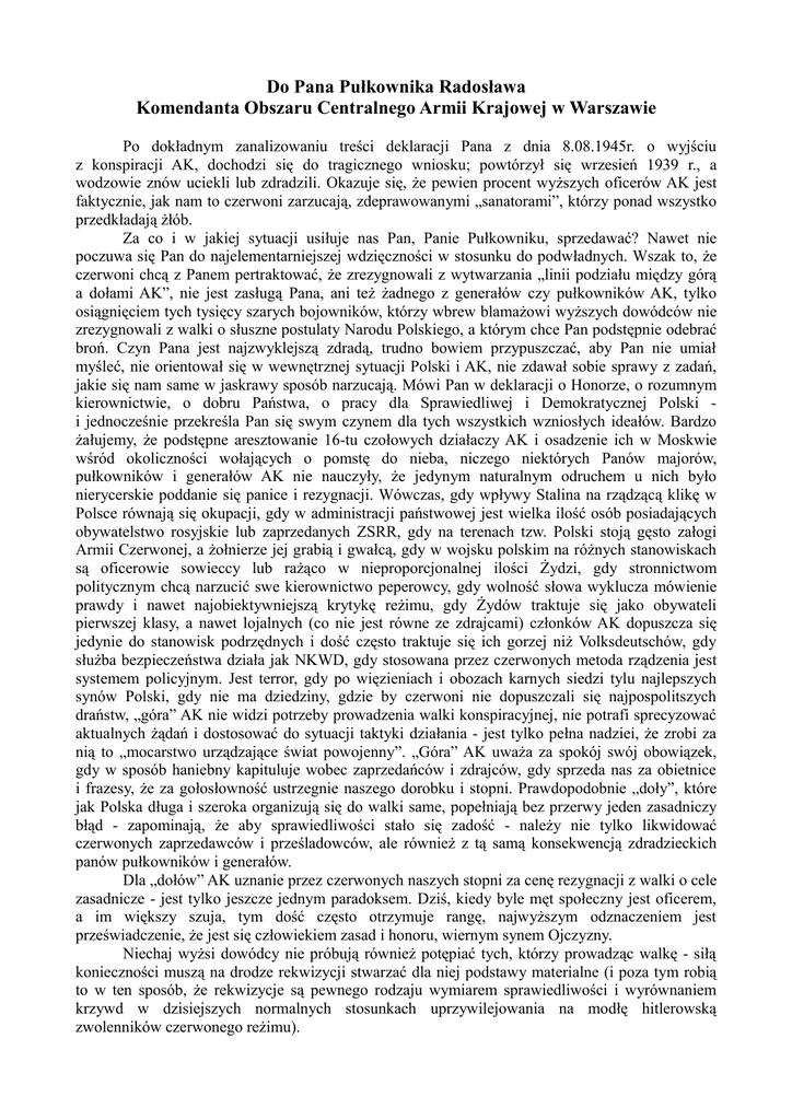 Do Pana Pułkownika Radosława Komendanta Obszaru Centralnego Armii Krajowej w Warszawie Po dokładnym zanalizowaniu treści deklaracji Pana z dnia 8.08.1945r. o wyjściu z konspiracji AK, dochodzi się do tragicznego wniosku; powtórzył się wrzesień 1939 r., a wodzowie znów uciekli lub zdradzili. Okazuje się, że pewien procent wyższych oficerów AK jest faktycznie, jak nam to czerwoni zarzucają, zdeprawowanymi „sanatorami”, którzy ponad wszystko przedkładają żłób. Za co i w jakiej sytuacji usiłuje nas Pan, Panie Pułkowniku, sprzedawać? Nawet nie poczuwa się Pan do najelementarniejszej wdzięczności w stosunku do podwładnych. Wszak to, że czerwoni chcą z Panem pertraktować, że zrezygnowali z wytwarzania „linii podziału między górą a dołami AK”, nie jest zasługą Pana, ani też żadnego z generałów czy pułkowników AK, tylko osiągnięciem tych tysięcy szarych bojowników, którzy wbrew blamażowi wyższych dowódców nie zrezygnowali z walki o słuszne postulaty Narodu Polskiego, a którym chce Pan podstępnie odebrać broń. Czyn Pana jest najzwyklejszą zdradą, trudno bowiem przypuszczać, aby Pan nie umiał myśleć, nie orientował się w wewnętrznej sytuacji Polski i AK, nie zdawał sobie sprawy z zadań, jakie się nam same w jaskrawy sposób narzucają. Mówi Pan w deklaracji o Honorze, o rozumnym kierownictwie, o dobru Państwa, o pracy dla Sprawiedliwej i Demokratycznej Polski i jednocześnie przekreśla Pan się swym czynem dla tych wszystkich wzniosłych ideałów. Bardzo żałujemy, że podstępne aresztowanie 16-tu czołowych działaczy AK i osadzenie ich w Moskwie wśród okoliczności wołających o pomstę do nieba, niczego niektórych Panów majorów, pułkowników i generałów AK nie nauczyły, że jedynym naturalnym odruchem u nich było nierycerskie poddanie się panice i rezygnacji. Wówczas, gdy wpływy Stalina na rządzącą klikę w Polsce równają się okupacji, gdy w administracji państwowej jest wielka ilość osób posiadających obywatelstwo rosyjskie lub zaprzedanych ZSRR, gdy na terenach tzw. Polski stoją gęsto załogi Armii Czerwonej, a żołnierze jej grabią i gwałcą, gdy w wojsku polskim na różnych stanowiskach są oficerowie sowieccy lub rażąco w nieproporcjonalnej ilości Żydzi, gdy stronnictwom politycznym chcą narzucić swe kierownictwo peperowcy, gdy wolność słowa wyklucza mówienie prawdy i nawet najobiektywniejszą krytykę reżimu, gdy Żydów traktuje się jako obywateli pierwszej klasy, a nawet lojalnych (co nie jest równe ze zdrajcami) członków AK dopuszcza się jedynie do stanowisk podrzędnych i dość często traktuje się ich gorzej niż Volksdeutschów, gdy służba bezpieczeństwa działa jak NKWD, gdy stosowana przez czerwonych metoda rządzenia jest systemem policyjnym. Jest terror, gdy po więzieniach i obozach karnych siedzi tylu najlepszych synów Polski, gdy nie ma dziedziny, gdzie by czerwoni nie dopuszczali się najpospolitszych draństw, „góra” AK nie widzi potrzeby prowadzenia walki konspiracyjnej, nie potrafi sprecyzować aktualnych żądań i dostosować do sytuacji taktyki działania - jest tylko pełna nadziei, że zrobi za nią to „mocarstwo urządzające świat powojenny”. „Góra” AK uważa za spokój swój obowiązek, gdy w sposób haniebny kapituluje wobec zaprzedańców i zdrajców, gdy sprzeda nas za obietnice i frazesy, że za gołosłowność ustrzegnie naszego dorobku i stopni. Prawdopodobnie „doły”, które jak Polska długa i szeroka organizują się do walki same, popełniają bez przerwy jeden zasadniczy błąd - zapominają, że aby sprawiedliwości stało się zadość - należy nie tylko likwidować czerwonych zaprzedawców i prześladowców, ale również z tą samą konsekwencją zdradzieckich panów pułkowników i generałów. Dla „dołów” AK uznanie przez czerwonych naszych stopni za cenę rezygnacji z walki o cele zasadnicze - jest tylko jeszcze jednym paradoksem. Dziś, kiedy byle męt społeczny jest oficerem, a im większy szuja, tym dość często otrzymuje rangę, najwyższym odznaczeniem jest przeświadczenie, że jest się człowiekiem zasad i honoru, wiernym synem Ojczyzny. Niechaj wyżsi dowódcy nie próbują również potępiać tych, którzy prowadząc walkę - siłą konieczności muszą na drodze rekwizycji stwarzać dla niej podstawy materialne (i poza tym robią to w ten sposób, że rekwizycje są pewnego rodzaju wymiarem sprawiedliwości i wyrównaniem krzywd w dzisiejszych normalnych stosunkach uprzywilejowania na modłę hitlerowską zwolenników czerwonego reżimu). Niechaj raczej usprawiedliwią się, co robili z wielkimi rezerwami dolarów. Czy zamiast je bezprawnie przywłaszczać sobie lub wkupywać się nimi w łaski czerwonych - nie należało ich zużyć na to prowadzenie walki i na pomoc dla tych, którzy zmuszeni ukrywać się, znaleźli się często w sytuacji bez wyjścia? Dając wyraz poglądowi na czynione rekwizycje, walczące „doły” AK stwierdzają równocześnie, że są bezwzględnymi przeciwnikami band rabunkowych i podkreślają swoje stanowisko wykrywaniem ich i likwidowaniem. Złożenie broni przez oddziały AK czerwonym władzom miałoby inny skutek niż przewiduje Pan Pułkownik: pozbawiłoby środków walki i obrony tysiące bojowników idei (gdyby byli tak niedojrzali, że wykonaliby niedorzeczny rozkaz), natomiast elementy bandyckie broń, mimo nakazów i pogróżek, z całą pewnością zawsze zatrzymają, wszak jest dużo broni nie zgłoszonej władzom konspiracyjnym i broni w posiadaniu osobników, na których one nie mają służbowego wpływu. Nie trzeba udowadniać, że w obecnych warunkach rażącej niesprawiedliwości trzymanie przez nas ludzi w garści i przez nas zwalczanie bandytyzmu, da bezwzględne rezultaty. Podobnie argumentem bez znaczenie jest zapowiedź, że po terminie 21 września b.r. kto nie zgłosił się do rejestracji, odpowiadać będzie zgo