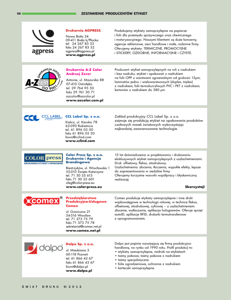 Zestawienie producentów etykiet 56 Drukarnia AGPRESS Nowa Biała 34 09-411 Biała k/Płocka tel. 24 267 83 33 faks 24 267 83 32 [email protected] www.agpress.pl Drukarnia A-Z Color Andrzej Zecer Antonie, ul. Mazurska 88 07-410 Ostrołęka tel. 29 764 95 50 faks 29 761 30 71 [email protected] www.azcolor.com.pl CCL Label Sp. z o.o. Kiekrz, ul. Kierska 78 62-090 Rokietnica tel. 61 896 05 00 faks 61 896 05 20 [email protected] www.cclind.com Color Press Sp. z o.o. Drukarnia i Agencja Brandingowa Biestrzyków, ul. Wrocławska 1 55-010 Święta Katarzyna tel. 71 30 35 613 faks 71 30 35 601 [email protected] www.color-press.eu Przedsiębiorstwo Produkcyjno-Usługowe Comex ul. Graniczna 21 54-516 Wrocław tel. 71 373 75 79 faks 71 373 75 78 [email protected] www.comex.net.pl Dalpo Sp. z o.o. ul. Miedziana 3 60-118 Poznań tel. 61 866 43 67 faks 61 866 43 67 [email protected] www.dalpo.pl ś W I A T D R U K U 9/ 2 0 1 2 Produkujemy etykiety samoprzylepne na papierze i folii dla przemysłu spożywczego oraz chemicznego i motoryzacyjnego. Naszymi klientami są duże koncerny, agencje reklamowe, sieci handlowe i małe, rodzinne firmy. Oferujemy etykiety: TERMICZNE, PROMOCYJNE i STICKERY, OZDOBNE, INFORMACYJNE i CZYSTE. Producent: etykiet samoprzylepnych na roli z nadrukiem i bez nadruku; etykiet i opakowań z nadrukiem na folii OPP z warstwami zgrzewalnymi od grubości 15µm; laminatów jedno- i wielowarstwowych (duplex, triplex) z nadrukiem; folii termokurczliwych PVC i PET z nadrukiem; kartonów z nadrukiem do 380 µm. Zakład produkcyjny CCL Label Sp. z o.o. zajmuje się produkcją etykiet na opakowania produktów czołowych marek światowych wykorzystując najbardziej zaawansowane technologie. 15 lat doświadczenia w projektowaniu i drukowaniu ekskluzywnych etykiet samoprzylepnych z uszlachetnieniami. Druk: offsetowy, flekso, sitodrukowy. Uszlachetnienia: złocenia, tłoczenia, wypukłe efekty, lepsze do zaprezentowania w siedzibie firmy Oferujemy korzystne warunki współpracy i błyskawiczną realizację Skorzystaj! Comex produkuje etykiety samoprzylepne i inne druki wąskowstęgowe w technologii rolowej, w technice flekso, offsetowej, sitodrukowej, cyfrowej – z uszlachetnieniem: złocenie, wytłaczanie, aplikacja hologramów. Oferuje sprzęt autoID, aplikacje RFID, drukarki termotransferowe z oprogramowaniem. Dalpo jest prężnie rozwijającą się firmą produkcyjnohandlową, na rynku od 1990 roku. Profil produkcji to: •etykiety samoprzylepne, nadruki na etykietach •taśmy pakowe, taśmy pakowe z nadrukiem •taśmy specjalistyczne •folie ogrodzeniowe, ochronne z nadrukiem •karteczki samoprzylepne. Zestawienie producentów etykiet 57 Etiko Sp. z o.o. Trzeszczyn, ul. Kościuszki 45e 72-004 Tanowo k/Szczecina tel. 91 432 97 00 faks 91 487 11 99 [email protected] www.etiko.pl •druk do 8 kolorów (farby UV lub wodne) •odwracanie i rozdzielanie wstęgi – druk od strony kleju lub na podkładzie •lakierowanie •uszlachetnianie etykiet foliami metalizowanymi (złocenie, srebrzenie, hologramy) •laminowanie •wytłaczanie wybranych elementów etykiety – embossing •etykiety trzystronicowe typu peel off Etisoft Sp. z o.o. Etisoft jest dostawcą kompleksowych rozwiązań w zakresie Auto ID. Produkuje etykiety do trwałych oznaczeń w przemyśle, oferuje najwyższej jakości etykiety foliowe i papierowe, przywieszki kartonowe i z tworzyw sztucznych. W ofercie posiada taśmy barwiące do wszelkiego typu drukarek termotransferowych. ul. Szara 21 44-100 Gliwice tel. 32 332 80 20 faks 32 332 80 01 [email protected] www.etisoft.com.pl Etyflex Sp. z o.o. ul. Romanowicza 11 30-702 Kraków tel. 12 257 00 17 faks 12 292 72 43 [email protected] www.etyflex.pl Przedsiębiorstwo Zagraniczne Helios ul. Chrościckiego 93/105 02-414 Warszawa tel. 22 571 94 04 faks 22 571 93 62 [email protected] www.pzhelios.pl KDS Sp. z o.o. Sp.k. ul. Krucza 6 05-070 Sulejówek tel. 22 783 28 43 faks 22 783 35 77 [email protected] www.kds.com.pl Producent etykiet samoprzylepnych, który nieprzerwanie od 1990 roku drukuje etykiety dla wielu wiodących firm w Polsce i na świecie. Posiada wszechstronny park maszynowy, możliwości różnorodnego uszlachetniania druku oraz nowoczesną przygotowalnię CTP. Wykonujemy wysokiej jakości etykiety samoprzylepne na papierach i foliach: •wielobarwne – techniką fleksograficzną •termiczne, termotransferowe do wag elektronicznych i drukarek kodu kreskowego •na arkuszach do drukarek laserowych •taśmy do metkownic (białe i w 4 kolorach fluorescencyjnych). Drukarnia etykiet. Nadruki do 12 kolorów, cold stamping, nadruk od strony kleju, laminacja, etykiety peel off. Etykiety papierowe, foliowe, tabliczki znamionowe i etykiety plomby. Bilety do kin, teatrów i na imprezy sportowe. Produkcja taśm termotransferowych do drukarek kodów kreskowych. Serwis i sprzedaż drukarek: Toshiba, Zebra, Sato, Datamax, TSC i inne. P 295 C GRUPA MASTERPRESS S.A. to innowacyjne przedsiębiorstwo o ponad 15-letnim doświadczeniu, specjalizujące się w produkcji etykiet i opakowań z wykorzystaniem technologii druku fleksograficznego i offsetowego. Masterpress jest obecny na rynku europejskim jako uznany producent etykiet shrink sleeve oraz etykiet i opakowań wykonanych z materiałów samoprzylepnych, folii, laminatów i tektury litej. P Cool Gray 6 C K MASTERPRESS S.A. Zakład Olsztyn: ul. Lubelska 46, 10-406 Olsztyn, tel. 89 533 47 12, fax 89 533 43 30, [email protected], www.masterpress.com Zakład Białystok: ul. Kuronia 4, 15-569 Białystok, tel. 85 664 75 30, fax 85 664 75 40, [email protected], www.masterpress.com ś W I A T D R U K U 9/ 2 0 1 2