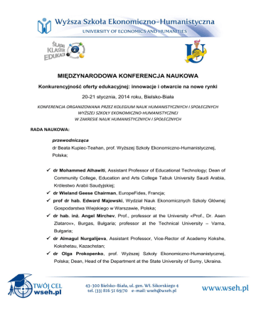 MIĘDZYNARODOWA KONFERENCJA NAUKOWA Konkurencyjność oferty edukacyjnej: innowacje i otwarcie na nowe rynki 20-21 stycznia, 2014 roku, Bielsko-Biała KONFERENCJA ORGANIZOWANA PRZEZ KOLEGIUM NAUK HUMANISTYCZNYCH I SPOŁECZNYCH WYŻSZEJ SZKOŁY EKONOMICZNO-HUMANISTYCZNEJ W ZAKRESIE NAUK HUMANISTYCZNYCH I SPOŁECZNYCH RADA NAUKOWA: przewodnicząca dr Beata Kupiec-Teahan, prof. Wyższej Szkoły Ekonomiczno-Humanistycznej, Polska; dr Mohammed Alhawiti, Assistant Professor of Educational Technology; Dean of Community College, Education and Arts College Tabuk University Saudi Arabia, Królestwo Arabii Saudyjskiej; dr Wieland Geese Chairman, EuropeFides, Francja; prof dr hab. Edward Majewski, Wydział Nauk Ekonomicznych Szkoły Głównej Gospodarstwa Wiejskiego w Warszawie, Polska; dr hab. inż. Angel Mirchev, Prof., professor at the University «Prof., Dr. Asen Zlatarov», Burgas, Bułgaria; professor at the Technical University – Varna, Bułgaria; dr Almagul Nurgalijeva, Assistant Professor, Vice-Rector of Academy Kokshe, Kokshetau, Kazachstan; dr Olga Prokopenko, prof. Wyższej Szkoły Ekonomiczno-Humanistycznej, Polska; Dean, Head of the Department at the State University of Sumy, Ukraina. KOMITET ORGANIZACYJNY: Witold Marzęda – przewodniczący; Edyta Kołodziejczyk – sekretarz polskojęzyczny konferencji; Elżbieta Jaszczurowska – sekretarz anglojęzyczny konferencji; Katarzyna Buława – sekretarz rosyjskojęzyczny konferencji; Michał Buława – samorząd studencki. 20.01.2014 10.00-10.30 rejestracja uczestników konferencji 10.30-11.00 przywitanie gości przez Dyrektora Kolegium Nauk Humanistycznych i Społecznych dr. Witolda Marzędę i przewodniczącą Rady Naukowej dr Beatę Kupiec-Teahan, prof. Wyższej Szkoły EkonomicznoHumanistycznej Innovation in Further Education Moderator panelu: dr Beata Kupiec-Teahan 11.00-11.30 mgr Janusz Dąbrowski „Coaching in SMEs: real need or a managerial whim?” 11.30-12.00 prof. dr hab. Edward Majewski „Development of specialized MBA offering – the case of AGRIMBA” 12.00-12.30 dr hab. Monika Wszołek „Oferta Edukacyjna dla praktyki produkcyjnej na przykładzie zapewnienia bezpieczeństwa i jakości żywności” 12.30-13.00 dyskusja panelowa 13.00-13.30 catering Contemporary Education: Markets, Competition and Sustainability Moderator panelu: mgr Janusz Dąbrowski 13.30-14.00 dr Janusz Dworak „Ekonomika Szkolnictwa Wyższego – wybrane Zagadnienia” 14.00-14.30 dr Sara Parry „Developing International Market: Educational Offerings for Asian and African students in the United Kingdom” 14.30-15.00 Mr Khaled Alhawiti „History of the Higher Education and the Stages of its Evolution” 15.00-15.30 dyskusja panelowa 15.30 catering 21.01.2014 Innovation in Higher Education Moderator panelu: Mr Khaled Alhawiti 10.00-10.30 dr William Teahan „Agent-oriented systems for teaching, learning and research” 10.30-11.00 Mr Yasser AlGhurabi „A conceptual spaces for agent-based model for e-learning” 11.00-11.30 dr Beata Kupiec-Teahan, prof. Wyższej Szkoły EkonomicznoHumanistycznej „An overview of Innovation in Higher Education practice: the case of Business Studies” 11.30-12.00 dyskusja panelowa 12.00-12.30 catering Wykorzystanie mediów społecznościowych w szkolnictwie wyższym i biznesie Moderator panelu: dr Katarzyna Zięba 12.30-13.00 Aleksandra Bałdyga „Teoretyczne i praktyczne aspekty edukacji małych dzieci. Alternatywne metody nauczania” 13.00-14.00 mgr Wojciech Kaczmarek (coach, trener biznesu, consultant) „Media społecznościowe w biznesie – budowanie przewagi konkurencyjnej” 14.00-14.30 dyskusja 14.00-14.30 catering Innovations in the management of competitiveness of educational services Moderator panelu: prof. dr. hab. Olha Prokopenko 14.30-14.55 prof. dr. hab. Sergii Illiashenko „Using Internet-technologies for promotion of scientific and educational services” 14.55-15.20 prof. dr. hab. Olha Prokopenko „The tools for enhancing competiveness of educational services at the Department of economics and management of SSU” 15.20-15.40 prof. dr. hab. Ievgen Khlobystov „Potential of competitiveness in the Ukrainian aspiration to the EU integration (educational services e.g.)” 15.40-16.00 prof. dr. hab. Elena Sadchenko „Research and development activities of the university as a source of creating university competitiveness” 16.00-16.30 dyskusja 16.30 zakończenie konferencji