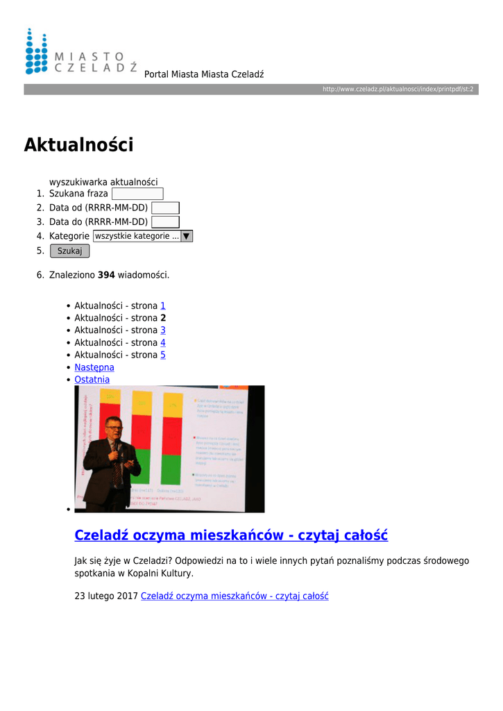 Portal Miasta Miasta Czeladź http://www.czeladz.pl/aktualnosci/index/printpdf/st:2 Aktualności wyszukiwarka aktualności 1. Szukana fraza 2. Data od (RRRR-MM-DD) 3. Data do (RRRR-MM-DD) 4. Kategorie wszystkie kategorie ... ▼ 5. Szukaj 6. Znaleziono 394 wiadomości. Aktualności - strona 1 Aktualności - strona 2 Aktualności - strona 3 Aktualności - strona 4 Aktualności - strona 5 Następna Ostatnia Czeladź oczyma mieszkańców - czytaj całość Jak się żyje w Czeladzi? Odpowiedzi na to i wiele innych pytań poznaliśmy podczas środowego spotkania w Kopalni Kultury. 23 lutego 2017 Czeladź oczyma mieszkańców - czytaj całość Grzegorz Niemczuk znów w Saturnie - czytaj całość W najbliższy piątek, 24 lutego w Muzeum Saturn wystąpi z recitalem fortepianowym znakomity pianista klasyczny Grzegorz Niemczuk. 22 lutego 2017 Grzegorz Niemczuk znów w Saturnie - czytaj całość Nabór do przedszkoli publicznych - czytaj całość W środę, 1 marca 2017 r. rusza nabór do czeladzkich przedszkoli publicznych na rok szkolny 2017/2018. Druki wniosków o przyjęcie będą dostępne w każdym przedszkolu. 22 lutego 2017 Nabór do przedszkoli publicznych - czytaj całość Pociąg do kultury dla czeladzkich seniorów - czytaj całość Kolejny rok Miasto Czeladź serdecznie zaprasza czeladzkich seniorów na comiesięczne, jednodniowe wycieczki w ramach projektu „Wycieczki dla osób po 60 roku życia – Pociąg do kultury”. 22 lutego 2017 Pociąg do kultury dla czeladzkich seniorów - czytaj całość MOSiR w Czeladzi uczcił pamięć Waldka Lubnaua - czytaj całość W minioną sobotę, 18 lutego 2017 roku w Hali Miejskiego Ośrodka Sportu i Rekreacji w Czeladzi odbył się I Halowy Turniej Piłki Nożnej, upamiętniający Waldka Lubnau. 22 lutego 2017 MOSiR w Czeladzi uczcił pamięć Waldka Lubnaua - czytaj całość Studia podyplomowe i szkolenia za darmo? - czytaj całość Podnieś kwalifikacje swoich pracowników. Pokaż pracodawcy, że warto inwestować w rozwój kadr. Teraz możesz liczyć nawet na 100% dofinansowania studiów podyplomowych i szkoleń z Krajowego Funduszu Szkoleniowego. 21 lutego 2017 Studia podyplomowe i szkolenia za darmo? - czytaj całość Wspomnienie "Dzieci Potulic" - czytaj całość 20 lutego 2017 roku pod obeliskiem upamiętniającym powrót 54 czeladzkich dzieci z obozu w Potulicach, odbyły się obchody 72. rocznicy tego wydarzenia. 20 lutego 2017 Wspomnienie "Dzieci Potulic" - czytaj całość III Turniej Grand Prix Czeladzi w Badmintonie - czytaj całość 19 lutego 2017 r. w hali MOSiR w Czeladzi odbył się trzeci z pięciu turniejów Grand Prix Czeladzi w badmintonie 2016/2017. 20 lutego 2017 III Turniej Grand Prix Czeladzi w Badmintonie - czytaj całość Zmarł Daniel Normand - czytaj całość Z wielkim smutkiem zawiadamiamy, że po długiej i ciężkiej chorobie zmarł Daniel Normand Honorowy Obywatel Naszego Miasta 18 lutego 2017 Zmarł Daniel Normand - czytaj całość III Turniej Grand Prix Czeladzi w Badmintonie - czytaj całość Miejski Szkolny Związek Sportowy zaprasza mieszkańców w niedzielę 19 lutego na III Turniej Grand Prix Czeladzi w Badmintonie. 17 lutego 2017 III Turniej Grand Prix Czeladzi w Badmintonie - czytaj całość Aktualności - strona 1 Aktualności - strona 2 Aktualności - strona 3 Aktualności - strona 4 Aktualności - strona 5 Następna Ostatnia