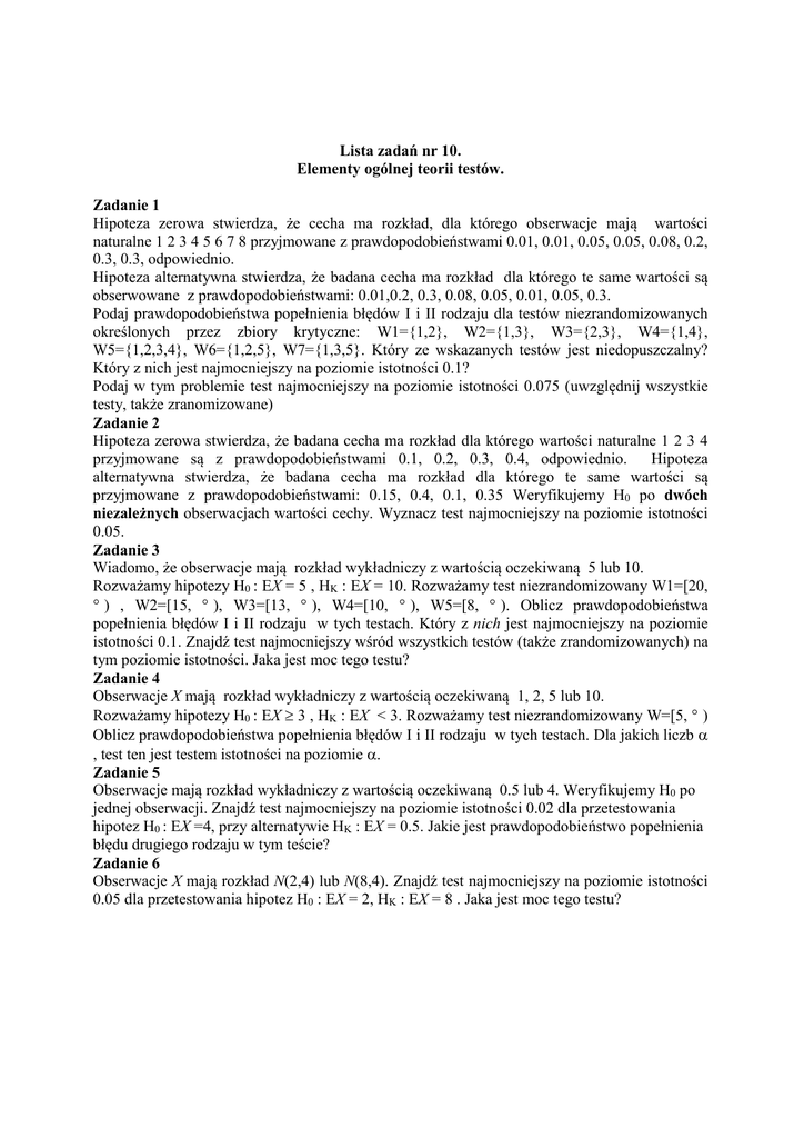 Rozważamy hipotezy H0 : EX = 5 , HK : EX = 10. Rozważamy test niezrandomizowany W1=[20,