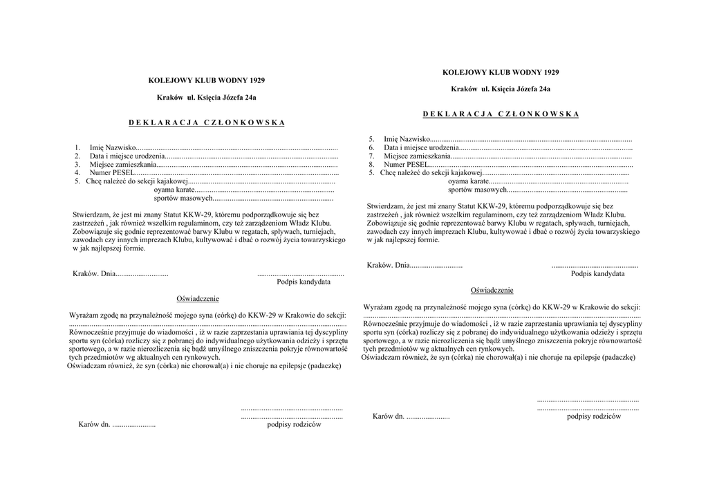 KOLEJOWY KLUB WODNY 1929 KOLEJOWY KLUB WODNY 1929 Kraków ul. Księcia Józefa 24a Kraków ul. Księcia Józefa 24a DEKLARACJA CZŁONKOWSKA 1. Imię Nazwisko........................................................................................................... 2. Data i miejsce urodzenia............................................................................................ 3. Miejsce zamieszkania................................................................................................ 4. Numer PESEL............................................................................................................ 5. Chcę należeć do sekcji kajakowej.............................................................................. oyama karate.......................................................................... sportów masowych................................................................ Stwierdzam, że jest mi znany Statut KKW-29, któremu podporządkowuje się bez zastrzeżeń , jak również wszelkim regulaminom, czy też zarządzeniom Władz Klubu. Zobowiązuje się godnie reprezentować barwy Klubu w regatach, spływach, turniejach, zawodach czy innych imprezach Klubu, kultywować i dbać o rozwój życia towarzyskiego w jak najlepszej formie. DEKLARACJA CZŁONKOWSKA 5. Imię Nazwisko........................................................................................................... 6. Data i miejsce urodzenia............................................................................................ 7. Miejsce zamieszkania................................................................................................ 8. Numer PESEL............................................................................................................ 5. Chcę należeć do sekcji kajakowej.............................................................................. oyama karate.......................................................................... sportów masowych................................................................ Stwierdzam, że jest mi znany Statut KKW-29, któremu podporządkowuje się bez zastrzeżeń , jak również wszelkim regulaminom, czy też zarządzeniom Władz Klubu. Zobowiązuje się godnie reprezentować barwy Klubu w regatach, spływach, turniejach, zawodach czy innych imprezach Klubu, kultywować i dbać o rozwój życia towarzyskiego w jak najlepszej formie. Kraków. Dnia............................ Kraków. Dnia............................ .............................................. Podpis kandydata .............................................. Podpis kandydata Oświadczenie Oświadczenie Wyrażam zgodę na przynależność mojego syna (córkę) do KKW-29 w Krakowie do sekcji: ................................................................................................................................................... Równocześnie przyjmuje do wiadomości , iż w razie zaprzestania uprawiania tej dyscypliny sportu syn (córka) rozliczy się z pobranej do indywidualnego użytkowania odzieży i sprzętu sportowego, a w razie nierozliczenia się bądź umyślnego zniszczenia pokryje równowartość tych przedmiotów wg aktualnych cen rynkowych. Oświadczam również, że syn (córka) nie chorował(a) i nie choruje na epilepsje (padaczkę) Karów dn. ....................... ...................................................... ...................................................... podpisy rodziców Wyrażam zgodę na przynależność mojego syna (córkę) do KKW-29 w Krakowie do sekcji: ................................................................................................................................................... Równocześnie przyjmuje do wiadomości , iż w razie zaprzestania uprawiania tej dyscypliny sportu syn (córka) rozliczy się z pobranej do indywidualnego użytkowania odzieży i sprzętu sportowego, a w razie nierozliczenia się bądź umyślnego zniszczenia pokryje równowartość tych przedmiotów wg aktualnych cen rynkowych. Oświadczam również, że syn (córka) nie chorował(a) i nie choruje na epilepsje (padaczkę) Karów dn. ....................... ...................................................... ...................................................... podpisy rodziców