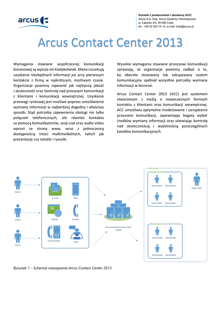 Kontakt z producentem i dostawcą ACC: Arcus S.A. Dep. Arcus Systemy Informatyczne ul. Łąkowa 3/5, 90-562 Łódź tel.: +48 42 203 14 12, e-mail: [email protected] Arcus Contact Center 2013 Wymagania stawiane współczesnej komunikacji biznesowej są wyższe niż kiedykolwiek. Klienci oczekują uzyskania niezbędnych informacji już przy pierwszym kontakcie z firmą w najkrótszym, możliwym czasie. Organizacje powinny zapewnić jak najlepszą jakość i skuteczność oraz kontrolę nad procesem komunikacji z klientami i komunikacji wewnętrznej. Uzyskanie przewagi rynkowej jest możliwe poprzez umożliwienie wymiany informacji w najbardziej dogodny i właściwy sposób. Stąd potrzeba zapewnienia obsługi nie tylko połączeń telefonicznych, ale również kontaktu za pomocą komunikatorów, sesji czat oraz audio-video wprost ze strony www, wraz z jednoczesną dostępnością treści multimedialnych, takich jak prezentacje czy notatki i rysunki. Rysunek 1 – Schemat rozwiązania Arcus Contact Center 2013 Wysokie wymagania stawiane procesowi komunikacji sprawiają, że organizacje powinny zadbać o to, by obecnie stosowany lub zakupywany system komunikacyjny spełniał wszystkie potrzeby wymiany informacji w biznesie. Arcus Contact Center 2013 (ACC) jest systemem stworzonym z myślą o nowoczesnych formach kontaktu z klientami oraz komunikacji wewnętrznej. ACC umożliwia optymalne modelowanie i zarządzanie procesem komunikacji, zapewniając bogaty wybór środków wymiany informacji oraz ułatwiając kontrolę nad skutecznością i wydolnością poszczególnych kanałów komunikacyjnych. Kontakt z producentem i dostawcą ACC: Arcus S.A. Dep. Arcus Systemy Informatyczne ul. Łąkowa 3/5, 90-562 Łódź tel.: +48 42 203 14 12, e-mail: [email protected] Najważniejsze cechy i funkcjonalności Kompatybilność i architektura System Arcus Contact Center 2013 został zaprojektowany w oparciu o technologię i komponenty Microsoft Lync Server – jeden z najlepszych na rynku systemów komunikacji zunifikowanej. Microsoft Lync Server jest niezbędnym komponentem ACC. Oba systemy powstały na bazie otwartych standardów komunikacyjnych i mogą współpracować praktycznie z każdym innym systemem telekomunikacyjnymi i dostawcą usług telekomunikacyjnych. Formy interakcji ACC zapewnia szeroki wybór metod interakcji, takich jak: Połączenia głosowe, a w tym połączenia telefoniczne, oraz połączenia audio realizowane przez komunikator Skype, w trybie przychodzącym i wychodzącym (od i do klienta). Czat, realizowany wprost ze strony www. Sesje audio-video, wraz z udostępnianiem treści multimedialnych, takich jak prezentacje, tablica interaktywna, notatki i rysunki - wprost ze strony www, bez konieczności instalacji oprogramowania klienckiego. Automatyczne kierowanie procesem komunikacji ACC zapewnia kolejkowanie interakcji na podstawie informacji o dostępności pracowników monitorowanej w czasie rzeczywistym. Daje to szerokie możliwości doboru pracowników uczestniczących w procesie obsługi klientów oraz elastyczne podejście do ich czasu pracy i fizycznej lokalizacji. Poszczególne formy interakcji są kierowane z uwzględnieniem zakresu i stopnia posiadanych przez pracowników kompetencji. Precyzyjne określanie tematu interakcji (IVR) System ACC umożliwia łatwe budowanie zaawansowanych menu – tzw. Interactive Voice Response (IVR) - służących do wyboru tematu rozmów głosowych (w tym telefonicznych i Skype). IVR można budować w oparciu o możliwość wyboru tematu rozmowy poprzez stosowanie klawiszy telefonu (DTMF). Dodatkowo poprzez pobieranie informacji z innych systemów biznesowych schemat IVR jest dynamicznie modyfikowany. W trakcie oczekiwania na połączenie głosowe odtwarzane są customizowane informacje (np. lub informacje o na połączenie). informacje marketingowe średnim czasie oczekiwania Rejestracja interakcji System ACC umożliwia rejestrację interakcji z klientem wykonywaną w formie głosowej i czatowej. Rejestrowane są: Połączenia głosowe, w tym połączenia telefoniczne i Skype oraz sesje audio. Sesje czatowe, wykonywane za pomocą www. Interfejs Konsultanta Pracownik obsługujący interakcję z klientami korzysta z aplikacji działającej na komputerze klasy PC, dającej szerokie możliwości komunikacji z wykorzystaniem audio, video i czatu oraz współdzielenia pulpitu. Interfejs użytkownika zapewnia parametryzowany dostęp do historii komunikacji wraz z odsłuchiwaniem nagrań i odtwarzaniem sesji czat. Konsultant ma możliwości regulacji tempa pracy poprzez zgłaszanie gotowości po obsłudze ostatniego połączenia (co umożliwia mu dostosowanie czasu w którym wykonuje notatki po rozmowie). Interfejs Supervisora System ACC umożliwia nadzorowanie pracy konsultantów dzięki roli Supervisora. Osoba, której nadano odpowiednie uprawnienia może monitorować stan kolejek multimedialnych (głosowych i czatowych) oraz podsłuchiwać rozmowy, podpowiadać konsultantom, i w razie potrzeby, przejmować rozmowy od Agentów. Supervisor ma także dostęp do wszelkich niezbędnych statystyk związanych z pracą ACC, w tym do średniego czasu oczekiwania na połączenie/czat, ilość połączeń/czatów wykonanych i odrzuconych, czas dostępności agenta itd. Współpraca z innymi systemami ACC może współpracować z innymi systemami takimi jak CRM (w tym Microsoft Dynamics CRM), ERP i Help Desk. Integracja z powyższymi systemami daje możliwość ujednolicenia miejsca obsługi procesu kontaktu z klientami.