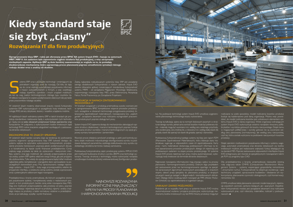 Kiedy standard staje się zbyt „ciasny” Rozwiązania IT dla firm produkcyjnych Oprogramowanie klasy ERP – takie jak oferowany przez BPSC SA system Impuls EVO – bazuje na systemach MRP i MRP II. Ich zadaniem było zapewnienie ciągłości działania linii produkcyjnej, a więc utrzymanie niezbędnych zapasów. Aplikacje ERP są dużo bardziej zaawansowane ze względu na to, że posiadają dwukierunkowe mechanizmy, które usprawniają proces planowania poprzez umożliwienie symulacji różnego rodzaju działań wraz z analizą ich skutków. S ystemy ERP wraz z postępem technologii i zmieniającymi się potrzebami organizacji stale się rozwijają. Od kilku lat dąży się do coraz większej automatyzacji pozyskiwania informacji z maszyn wykorzystywanych w firmach, a więc wszelkiego rodzaju skanerów, czytników i innych urządzeń mobilnych, ale też np. wag, maszyn technologicznych, różnego typu czujników itp. W efekcie rozwiązanie to wspiera podejmowanie właściwych decyzji także przez pracowników niższego szczebla. Zaletą najbardziej rozbudowanych systemów klasy ERP jest posiadanie szeregu dodatkowych funkcjonalności o różnym zakresie. Impuls EVO zawiera kilkanaście aplikacji rozszerzających standardową funkcjonalność systemu MRPII – od zarządzania Magazynem Wysokiego Składowania, wspomnianego rozwiązania klasy MES, przez Elektroniczną Akceptację Faktur, Portal Pracowniczy, po Zarządzanie Projektami. W ostatnich latach możemy obserwować znaczny rozwój funkcjonalny systemów ERP wykorzystujących w szczególności kody kreskowe, technologię RFID, ekrany dotykowe, skanery i wszelkie urządzenia mobilne. W branżach związanych z produkcją przemysłową wysoko oceniane jest w oprogramowaniu BPSC kompleksowe wsparcie procesów produkcyjnych, szczególnie w obszarach technicznego przygotowania produkcji, bilansowania zapotrzebowań materiałowych, rozwiązywania tzw. „wąskich gardeł”, zarządzania zleceniami oraz rozliczania wynagrodzeń pracowników produkcyjnych poprzez obsługę kart pracy. W najbliższych latach wdrożenia systemu ERP w takich branżach jak produkcja standardowo realizowane będą z wykorzystaniem tych technologii i będą one w wielu obszarach przejmować funkcje operatorów oraz komputerów. W połączeniu z wykorzystaniem kodów kreskowych bądź technologii RFID rośnie znaczenie udogodnień wynikających z zastosowania ekranów dotykowych. ERGONOMICZNIE TO ZNACZY SPRAWNIE W ostatnich latach bardzo wyraźna staje się tendencja do podnoszenia poziomu ergonomii oprogramowania klasy ERP. Łatwość dostępu do systemu wpływa na optymalne wykorzystanie funkcjonalności, przyśpieszenie procesów biznesowych, poprawę jakości podejmowanych decyzji, a w konsekwencji na lepsze wyniki finansowe przedsiębiorstw. Coraz większą wagę przykłada się także do użyteczności i elastyczności interfejsu systemu oraz jego mobilność. Jak wykazały przeprowadzone przez nas analizy, system ERP spełnia właściwie swoją funkcję, gdy jest przyjazny dla użytkowników. Tylko wtedy do oprogramowania będą trafiać możliwie najbardziej pełne, kompleksowe i wiarygodne dane wprowadzane na poszczególnych stanowiskach pracy. Przy opracowywaniu naszego najnowszego systemu – Impuls EVO – dużą wagę przywiązywaliśmy właśnie do przyjazności interfejsu, a ostateczna wersja systemu została wypracowana wraz z potencjalnymi odbiorcami tegoż rozwiązania. Przedsiębiorstwa z branży przemysłowej, dla których szczególnie istotne jest pozyskiwanie szybkiej i kompleksowej wiedzy o realizowanych procesach, w tym produkcyjnych, bardzo cenią sobie rozwiązania klasy MES. Dają one możliwość przeprowadzenia całej produkcji od planu, poprzez fizyczną realizację i rejestrację danych na produkcji, raporty i analizy z każdego miejsca na produkcji, a także normatywy ustalone w przedsiębiorstwie, aż po kalkulację, wysyłkę i wyniki finansowe. 20 Polski Przemysł | ARTYKUŁ SPONSOROWANY PRODUKCJA W RAMACH ZINTEGROWANEGO ŚRODOWISKA IT System Impuls EVO zapewnia dostęp do mechanizmów ułatwiających opisanie struktury złożeniowej i marszrut technologicznych poprzez funkcje kopiowania struktur wyrobów i marszrut technologicznych czy opcje grupowej wymiany komponentów i zamienników. Również proces składania zamówień przebiega w pełni pod kontrolą systemu dzięki możliwości indywidualnego skonfigurowania wyrobu na podstawie dostępnych parametrów, szybkiego skalkulowania ceny wyrobu czy dokładnego określenia terminów realizacji zamówienia. Podstawową funkcjonalnością części produkcyjnej systemu IMPULS EVO jest możliwość budowania struktury wyrobu (BOM) oraz technologii wykonania. Tworząc strukturę z technologią, można wykorzystać narzędzia umożliwiające budowę produkcji wielowariantowej (konfigurator produk- NAJNOWSZE ROZWIĄZANIA INFORMATYCZNE MAJĄ ZNACZĄCY WPŁYW NA PROCESY PLANOWANIA I HARMONOGRAMOWANIA PRODUKCJI tu). Na podstawie technologii system Impuls EVO umożliwia wygenerowanie planowanego technicznego kosztu wytworzenia. Tworząc tę kalkulację, opiera się na normach ilościowych zawartych w strukturze danego wyrobu, jednak sama wartość kosztów może być pobierana różnie – materiały mogą być wyceniane m.in. według ceny ostatniego przychodu, ceny ewidencyjnej, ceny średniej itd., a robocizna m.in. według stałej stawki dla gniazda, stawki dla operacji lub stawki dla gniazda, operacji i stanowiska. Podstawową funkcjonalnością każdego systemu tej klasy jest raport PZM (Planowanie Zapotrzebowań Materiałowych), który bilansuje stany materiałowe, sugerując w odpowiednim czasie ich zapotrzebowanie. Karty pracy i karty materiałowe dostarczają podstawowych informacji na temat zaawansowania procesów produkcyjnych, dlatego ich rejestracja jest podstawowym zadaniem na etapie procesu produkcyjnego. W systemie Impuls EVO proces rejestracji kart pracy można zautoma