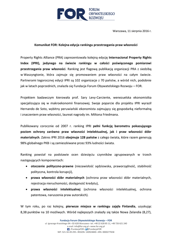 Warszawa, 11 sierpnia 2016 r. Komunikat FOR: Kolejna edycja rankingu przestrzegania praw własności Property Rights Alliance (PRA) zaprezentowała kolejną edycję Internacional Property Rights Index (IPRI), jedynego na świecie rankingu w całości poświęconego pomiarowi przestrzegania praw własności. Ranking jest flagową publikacją organizacji PRA z siedzibą w Waszyngtonie, która zajmuje się promowaniem praw własności na całym świecie. Partnerami tegorocznej edycji IPRI są 102 organizacje z 70 państw, a wśród nich, podobnie jak w latach poprzednich, znalazła się Fundacja Forum Obywatelskiego Rozwoju – FOR. Projektem badawczym kierowała prof. Sary Levy-Carciente, wenezuelska ekonomistka specjalizująca się w makroekonomii finansowej. Swoje poparcie dla projektu IPRI wyraził Hernando de Soto, wybitny peruwiański ekonomista zajmujący się gospodarką nieformalną i znaczeniem praw własności, laureat nagrody im. Miltona Friedmana. Publikowany corocznie od 2007 r. ranking IPRI pełni funkcję barometru pokazującego poziom ochrony zarówno praw własności intelektualnej, jak i praw własności dóbr materialnych. Zakres IPRI 2016 obejmuje 128 państw z całego świata, które razem generują 98% globalnego PKB i są zamieszkiwane przez 93% ludności świata. Ranking powstał na podstawie ocen dziesięciu czynników zgrupowanych w trzech następujących komponentach: otoczenie polityczno-prawne (niezawisłość sędziowska, praworządność, stabilność polityczna, kontrola korupcji), prawa własności dóbr materialnych (ochrona praw własności dóbr materialnych, rejestracja nieruchomości, dostępność kredytu), prawa własności intelektualnej (ochrona własności intelektualnej, ochrona patentowa, naruszenia praw autorskich). W tym roku, po raz kolejny, pierwsze miejsce w rankingu zajęła Finlandia, uzyskując 8,38 punktów na 10 możliwych. Wśród najlepszych znalazły się także Nowa Zelandia (8,27), Fundacja Forum Obywatelskiego Rozwoju – FOR ul. Ignacego Krasickiego 9A 02-628 Warszawa tel. +48 22 628 85 11, +48 726 621 240 e-mail: [email protected] www.for.org.pl /FundacjaFOR @FundacjaFOR NIP: 521-34-49-293 REGON: 140924840 KRS: 0000277658 Luksemburg (8,26), Norwegia (8,25) i Szwajcaria (8,16). Prawa własności najsłabiej były chronione w Wenezueli, która otrzymała tylko 2,73 punktów. Polska spadła w tegorocznym rankingu światowym na 43. miejsce z 41. miejsca w 2015 r., uzyskując 5,9 punktów, tyle samo, co w roku poprzednim. Wśród krajów z regionu Europy Wschodniej i Azji Środkowej zajęliśmy 5. miejsce na 20 państw. W porównaniu do 2015 r. Polska poprawiła wynik o 0,1 p.p. w zakresie praw własności intelektualnej, co dało nam 5,9 punktów. W komponencie otoczenia polityczno-prawnego Polska uzyskała 6,2 punktów, a w dziedzinie prawa własności dóbr materialnych 5,7 punktu. IPRI, jako narzędzie dla polityków, świata biznesu i działaczy obywatelskich, podkreśla znaczenie praw własności w tworzeniu dobrze prosperującej gospodarki i sprawiedliwego społeczeństwa. Tegoroczny raport zawiera także badania związków pomiędzy prawami własności a innymi wskaźnikami dotyczącymi kwestii społeczno-ekonomicznych, takich jak aktywność obywatelska, badania i rozwój, ochrona środowiska, przedsiębiorczość, rozwój społeczny i równość płci. Na podstawie tych badań stwierdzono m.in., że: kraje najlepiej chroniące prawa własności mają przeciętnie aż 21 razy wyższy dochód na mieszkańca niż te najgorzej wypadające w rankingu, poziom ochrony praw własności jest silnie skorelowany ze wskaźnikami aktywności obywatelskiej, przedsiębiorczości, wolności edukacji i liczbą naukowców zatrudnionych na pełny etat. „Prawa własności są fundamentem dobrze prosperującego społeczeństwa. Określają co jest twoje, a co nie należy do ciebie oraz odgrywają ważną rolę w wymianie dóbr, która tworzy nową wartość” – mówi Lorenzo Montanari, dyrektor wykonawczy organizacji Property Rights Alliance – „to dlatego są one prawami człowieka i mają istotne znaczenie dla wolności jednostki. Słaby system ochrony praw własności to krótsza długość życia, mniejsze zaangażowanie w aktywność obywatelską i niezdolność do uczestnictwa w światowych wysiłkach prowadzących do odkrywania, wynajdywania i dzielenia się wiedzą”. W tym roku raport IPRI zawiera sześć następujących studiów przypadku poświęconych rozszerzaniu i ochronie praw własności: „Zestaw narzędzi dla współczesnego lidera z wizją: jak redukować szarą strefę poprzez wzmacnianie praw własności” – dr Elena Panaritis, Thought for Action, „Wykorzystywanie technologii blockchain do zabezpieczenia prawa własności ziemi w Hondurasie” – Jorge Constantino Collindres, Matt Regan i Guillermo Pena Panting, Fundacion Eleutera, strona 2 „Własność intelektualna jako siła napędzająca innowacje w sektorze biofarmaceutycznym w krajach rynków wschodzących” – Philip Stevens, Geneva Network, „Rola własności ziemi w egipskiej gospodarce oraz jej związek z szarą strefą i sektorem prywatnym” – Mahmoud Farouk i Adel Elhemaily, Egyptian Center for Public Policy Studies, „Prawa własności a deforestacja w Indonezji” – Hizkia Respatiadi, Center for Indonesian Policy Studies, „Wyjątkowe studium przypadku na temat religii i praw własności: prawa własności z perspektywy islamskiej” – dr Maszlee Malik, Institute for Democracy and Economic Affairs i Instanbul Network for Liberty. Pełna wersja raportu dostępna jest na stronie www.internationalpropertyrightsindex.org. Fundacja Forum Obywatelskiego Rozwoju - FOR jest partnerem International Property Rights Index 2016. Tłumaczenie i opracowanie: Daniel Góra. strona 3 Forum Obywatelskiego Rozwoju FOR zostało założone w 2007 roku przez prof. Leszka Balcerowicza, aby skutecznie chronić wolność oraz promować prawdę i zdrowy r
